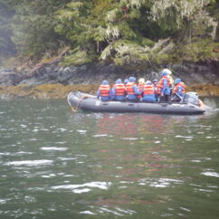 Unsere Gruppe startet ganz früh bei nur leichtem Regen mit dem Zodiak zu Tierbeobachtungen in der Kelp Bay.