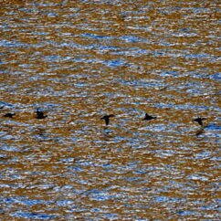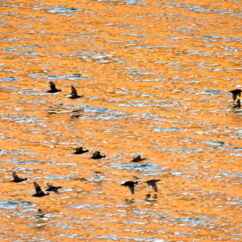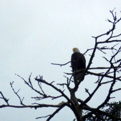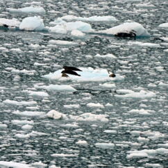 In der Ferne Blas von einem Wal, doch die Führer der Zodiaks denken gar nicht daran, die Richtung einzuschlagen. Stattdessen halten sie auf die geschützte Seite einer Insel zu. Wir sehen einen Robbenkopf, einen Seelöwenkopf und einen wegfliegenden Adler. Alle scheinen begeistert.