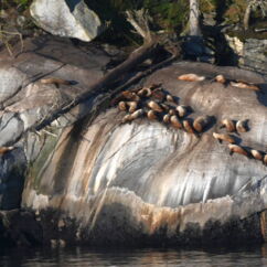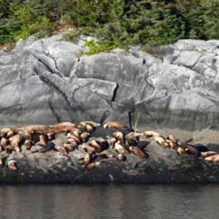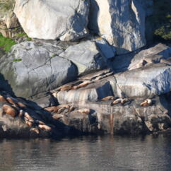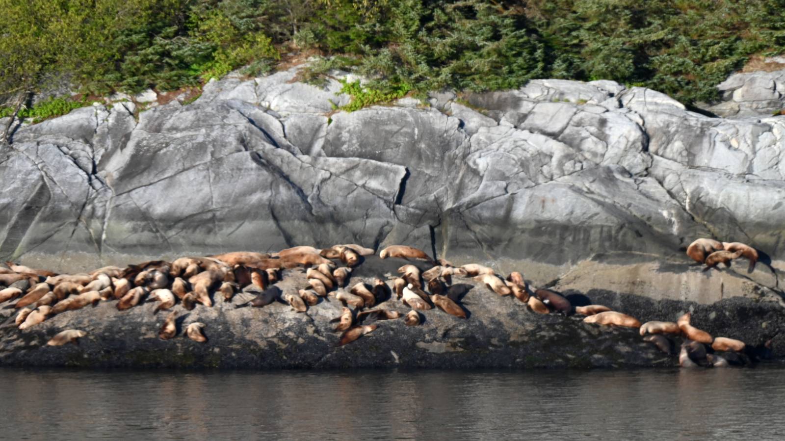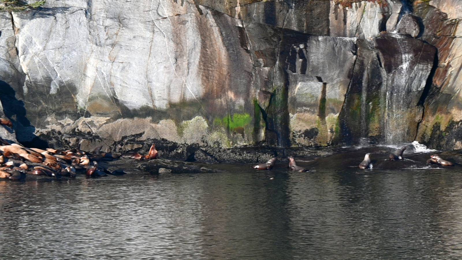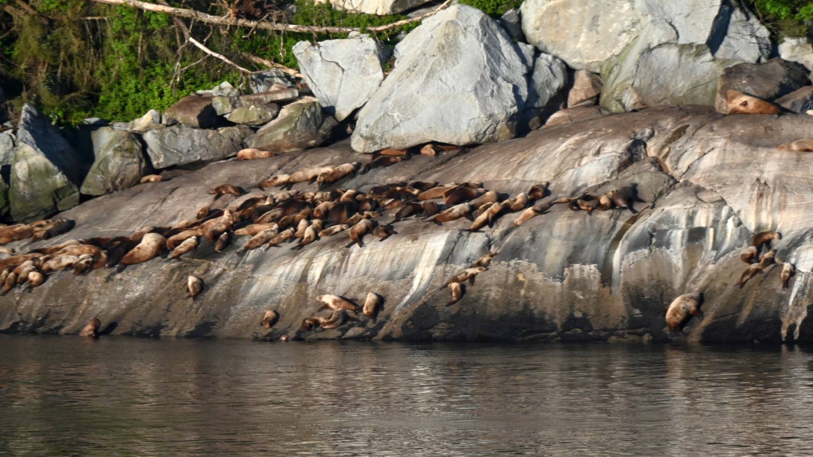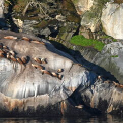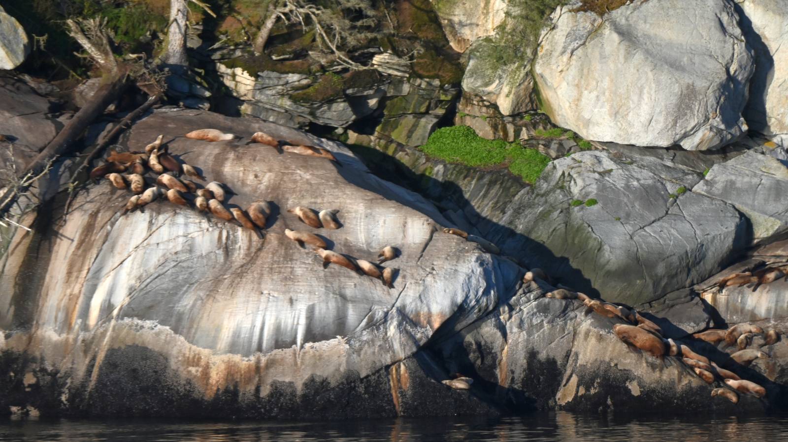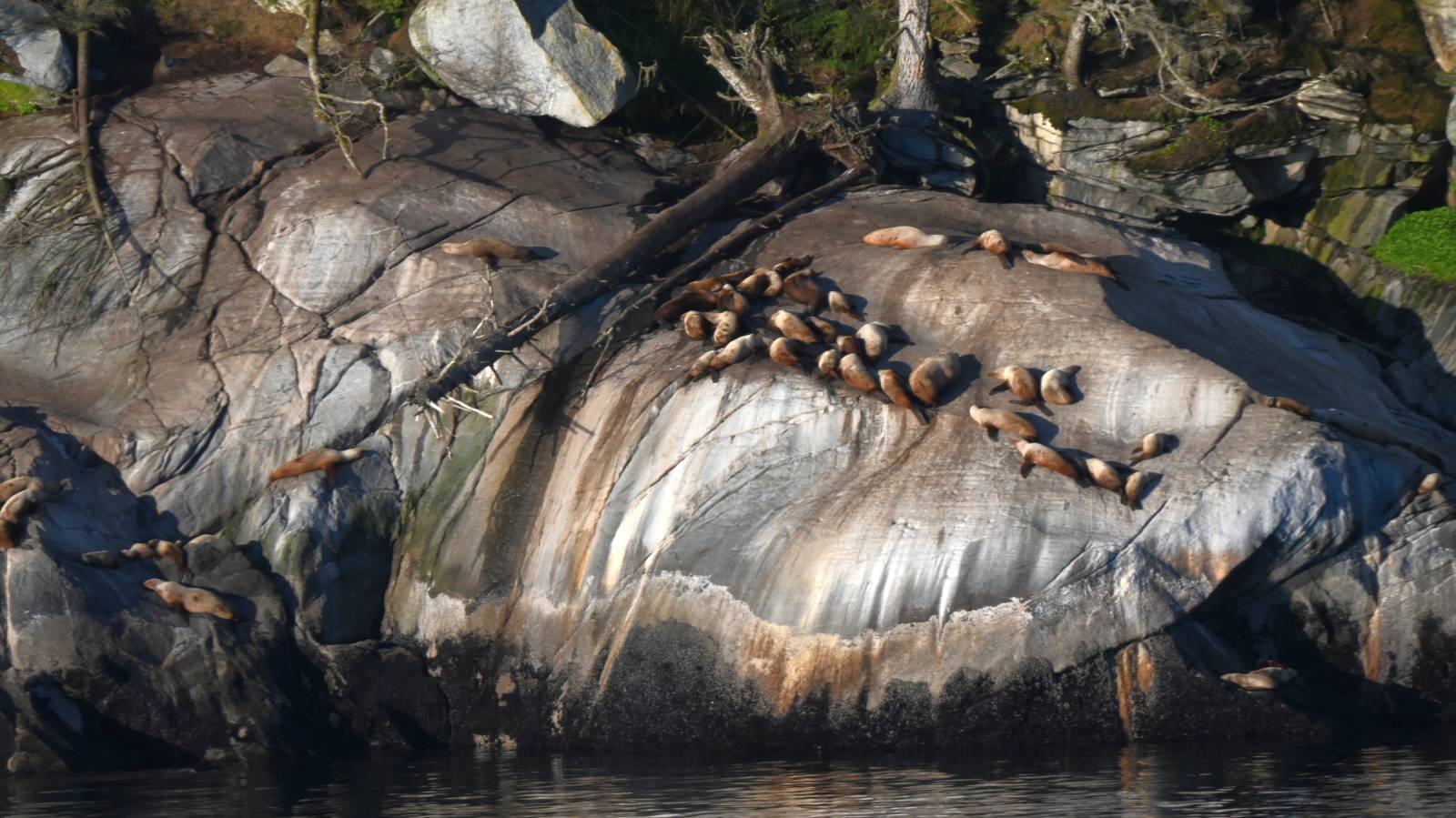Auf unserer Weiterfahrt sitzen wir am Panoramafenster der Explorer Lounge auf Deck 10. Eine sehr schöne Landschaft zieht an uns vorbei und auch ein Highlight: eine Seelöwenkolonie.