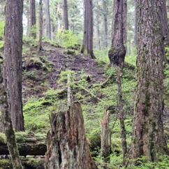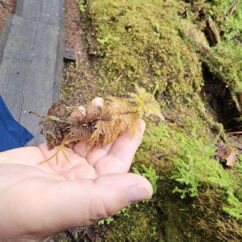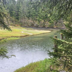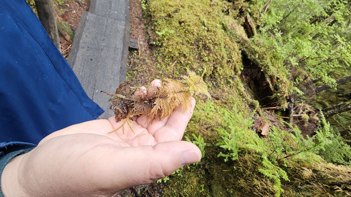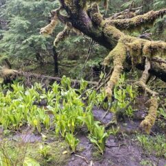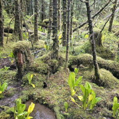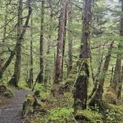 Mit Transferbooten werden wir heute im Hafen von Wrangell abgesetzt. Wir haben eine dreistündige Wanderung zu einem Wasserfall auf dem Wanderweg Rainbow gebucht. Über Holzstufen überwindet unsere Gruppe die 120 Meter Höhenunterschied, vorbei an Blaubeeren, Himbeeren, Wald-Erdbeeren, Farnen, Flechten und kleinen Pilzen. Ausschließlich sechs Baumarten sind hier zu finden.