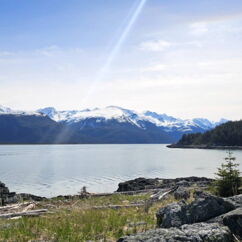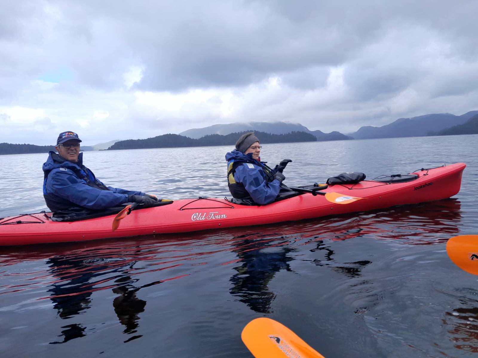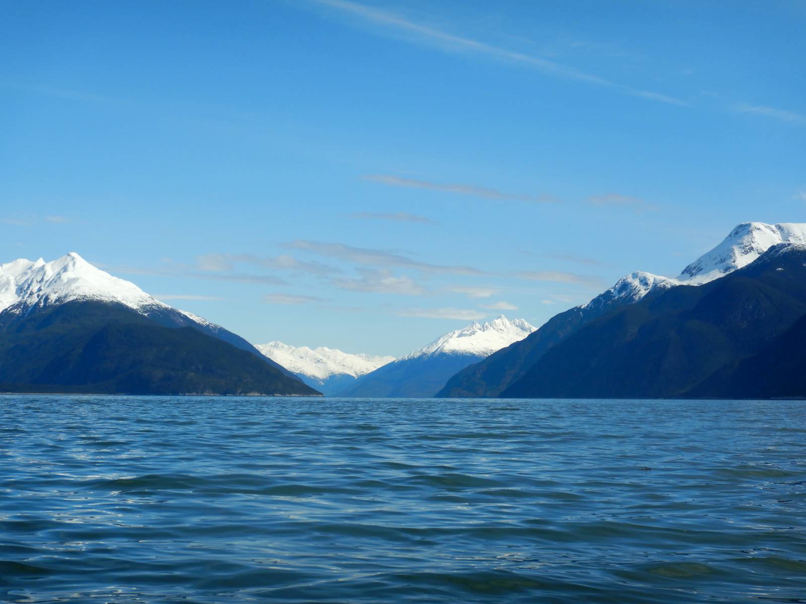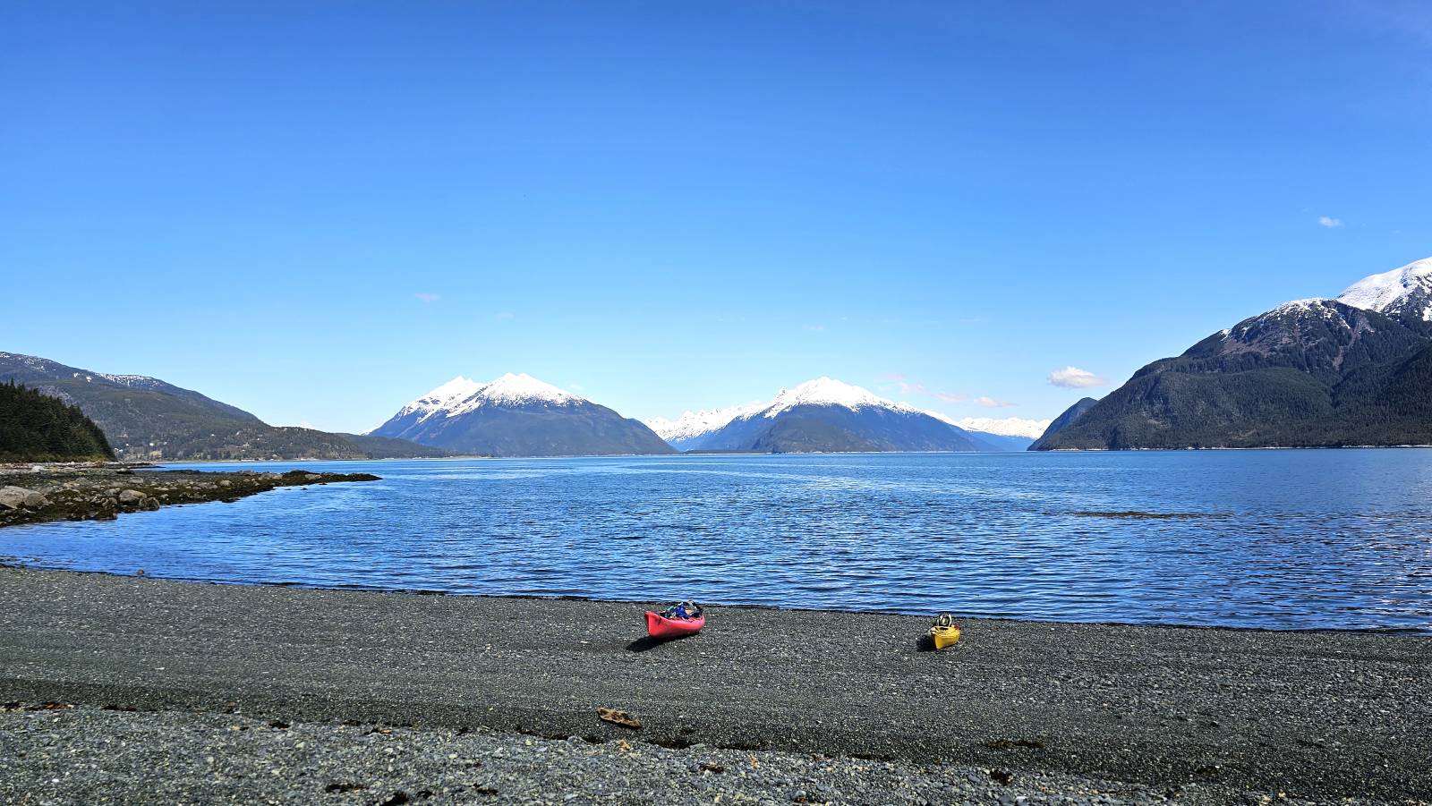 Bei stahlendem Sonnenschein starten wir unsere erste Kajaktour in Haines. Die zwei Guides betreuen nur unser und ein weiteres Doppelkajaks, so dass wir ziemlich relaxt den Fjord hinunterpaddeln. Wir treffen auf einen Seehund und sehen später noch einen Adler über den Ort kreisen.
