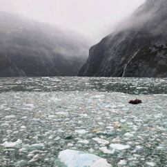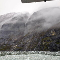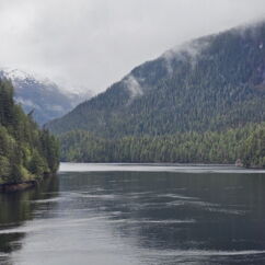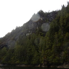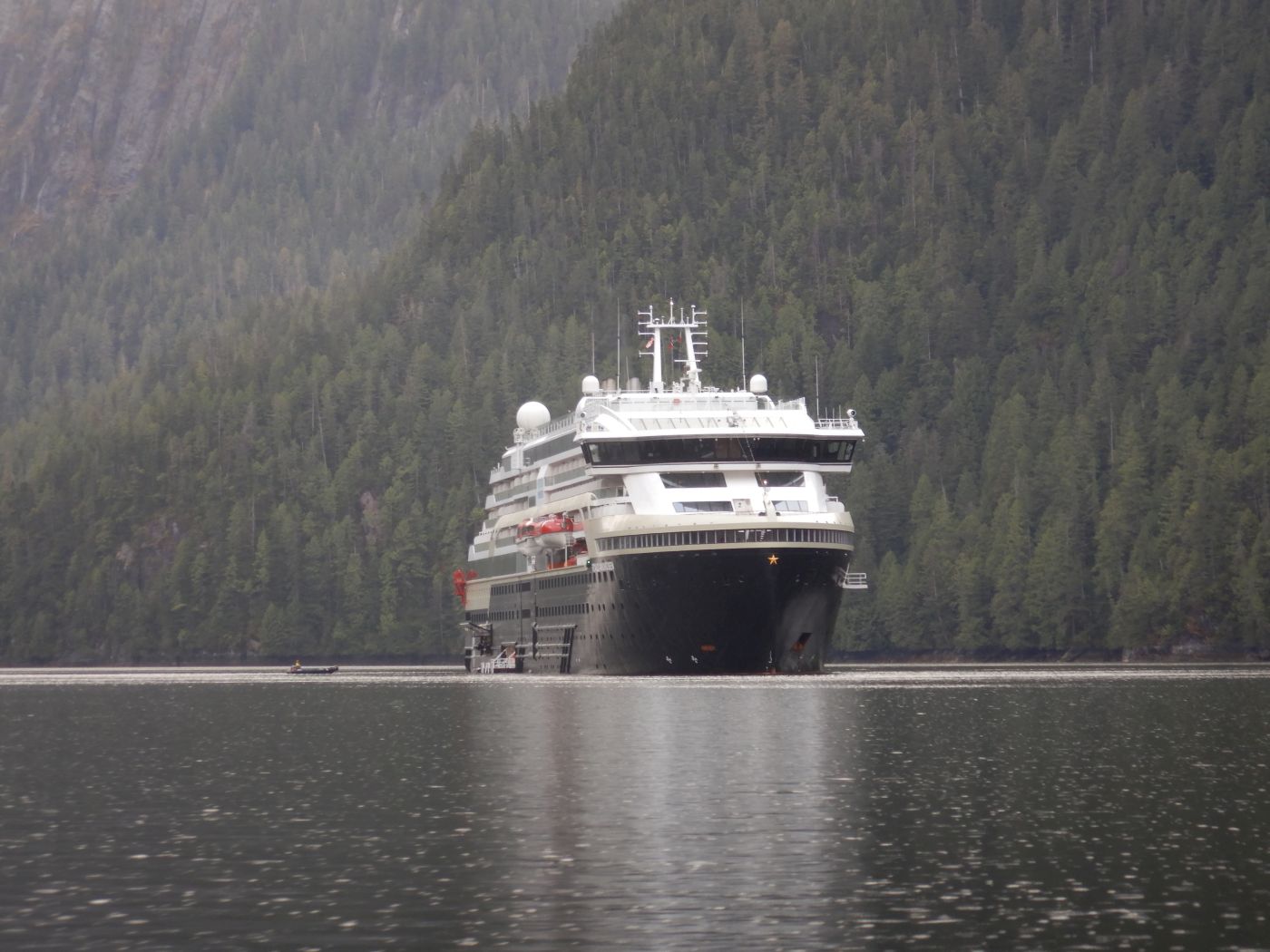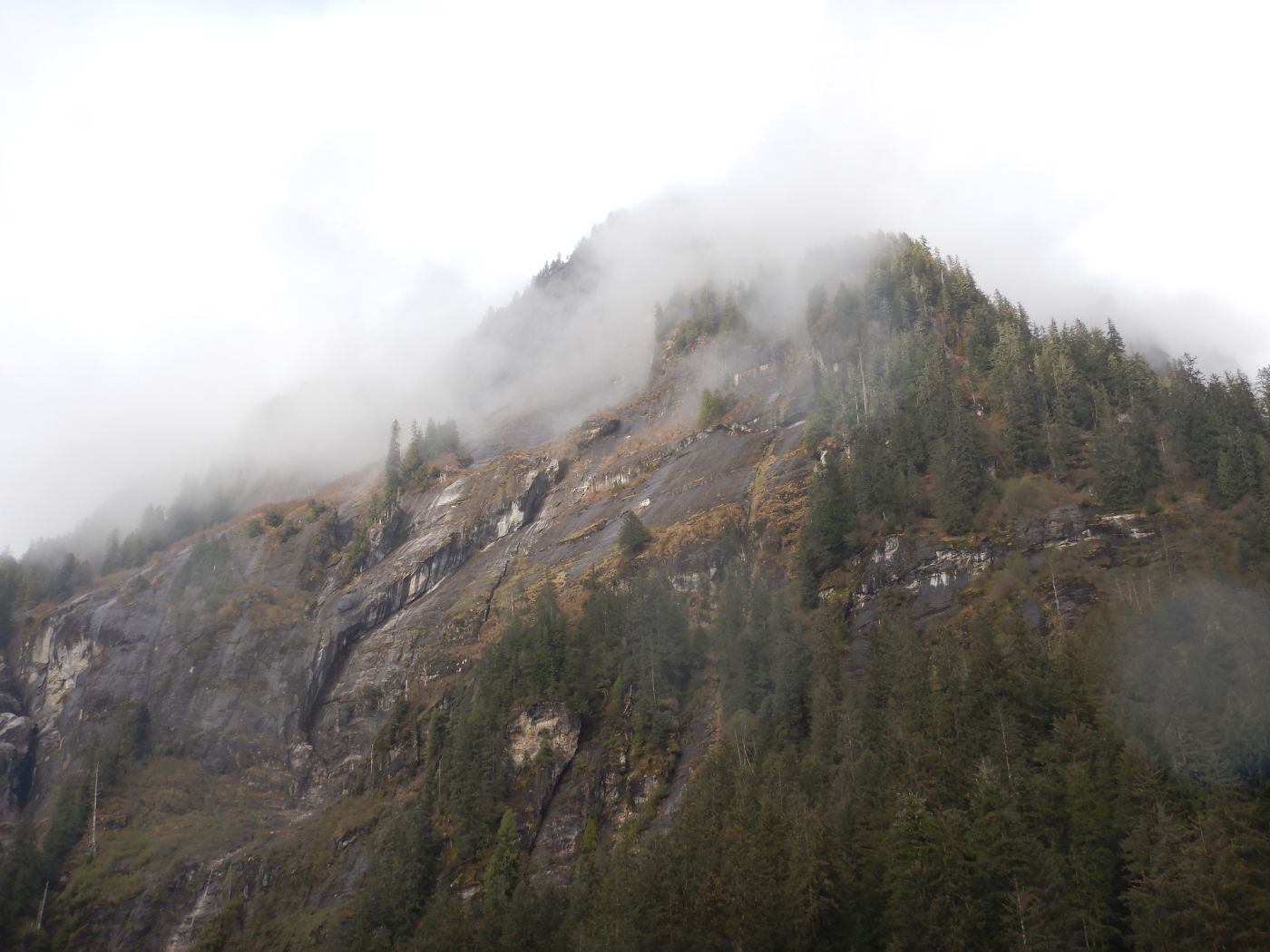 Der erste Ausflug in den Zodiaks führt in den Misty-Fjord. Das Wetter wechselt hier schnell von sonnig zu neblig oder Regen. Als unsere Gruppe unterwegs ist, bietet das Wetter keine Sonne. Die Felsformationen sind eindrucksvoll und auch die vier Baumarten, die sich ohne viel Erde auf den Felsen festkrallen. Tiere fehlen, wir treffen lediglich auf zwei kleine Enten.