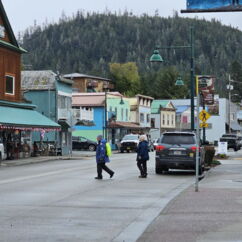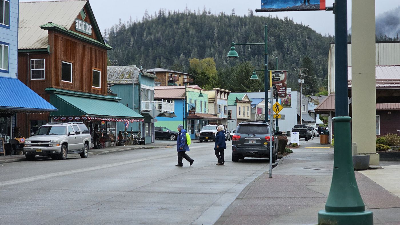 Nach dem Paddeln wandern wir durch den netten Ort, der so ganz anders wirkt als Wrangell. Es kommt uns hier sehr westernmäßig/sehr amerikanisch vor. In einem kleinen Souvenierladen finden wir zwei schöne Glückwunschkarten, einen anderen verlassen wir, nachdem wir das Trumpf-Konterfei im A3-Format im Flur hängen sehen. Das errinnert uns an vergangene deutsche Zeiten.