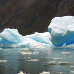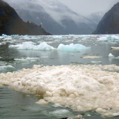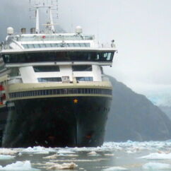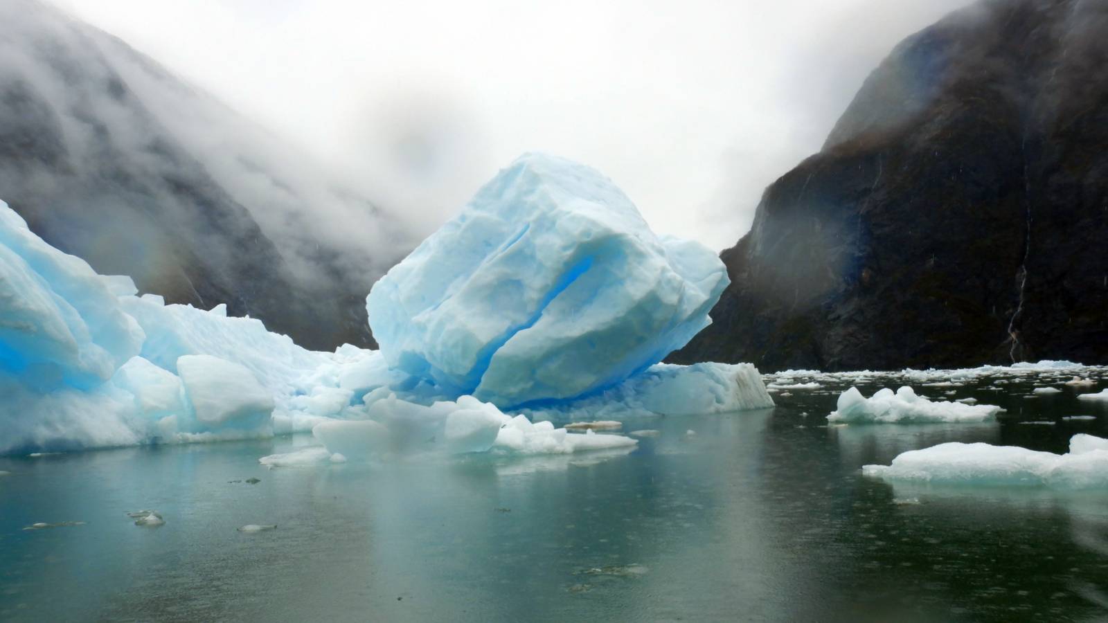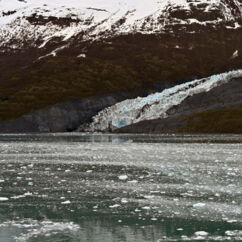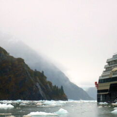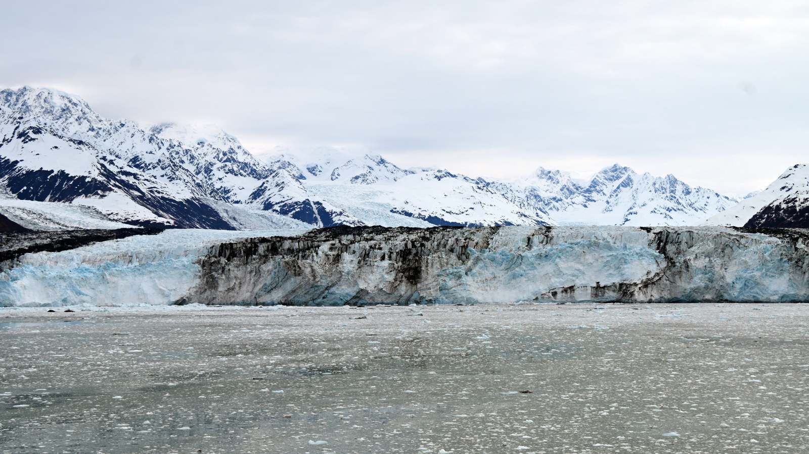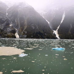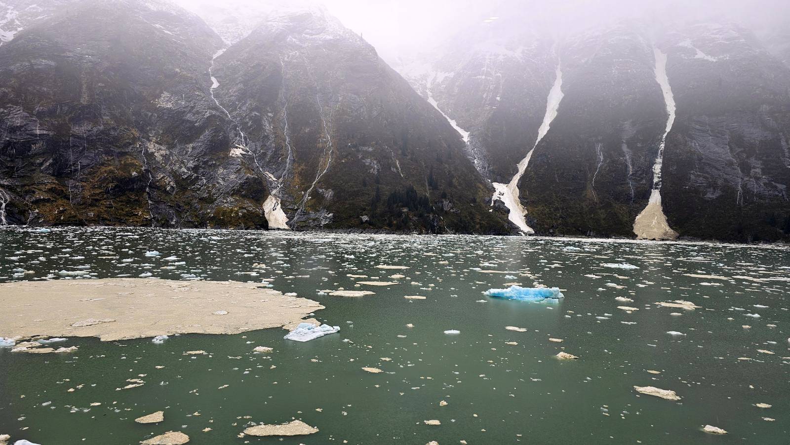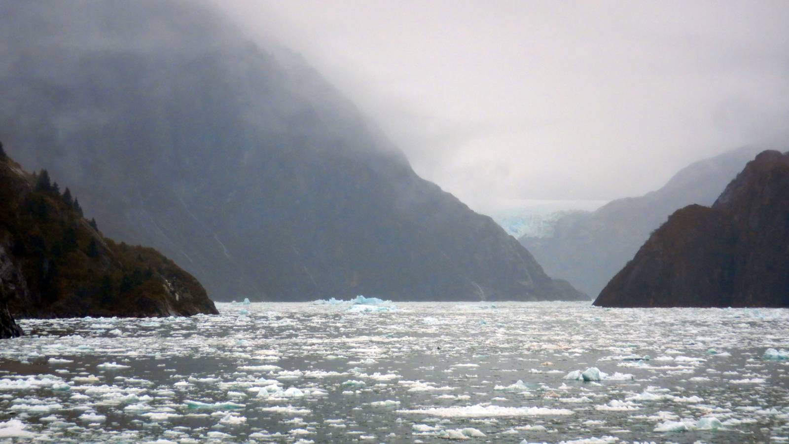 Auf dem Weg zum Gletscher Tracy Arms ist die Roald Amundsen langsam durch den Fjord geglitten, beiderseits ragen hohe Felsberge steil in die Höhe. Die Gipfel sind meist im Nebel versteckt, es regnet meistens und die Anzahl von Eisbrocken und -feldern nimmt stetig zu. Zuerst beim Frühstück und anschließend in der Explorer Lounge schauen wir dem Treiben des Eises zu. Das Grau hat etwas Magisches und wir können ihm durchaus etwas abgewinnen.