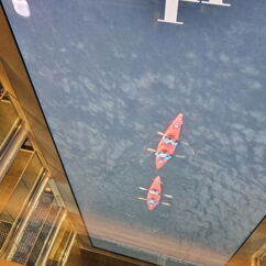 Fährt man mit dem gläsernen Fahrstuhl zwischen den 10 Decks rauf und runter, schaut man auf ein 17 Meter hohes LED-Display, das schöne Bilder vergangener Hurtigruten-Fahrten zeigt. Bären, Pinguine, Eisberge, Kajaks, einsame Fjorde und natürlich die Roald Amundsen. Es ist unmöglich, das Display im Ganzen zu fotografieren.