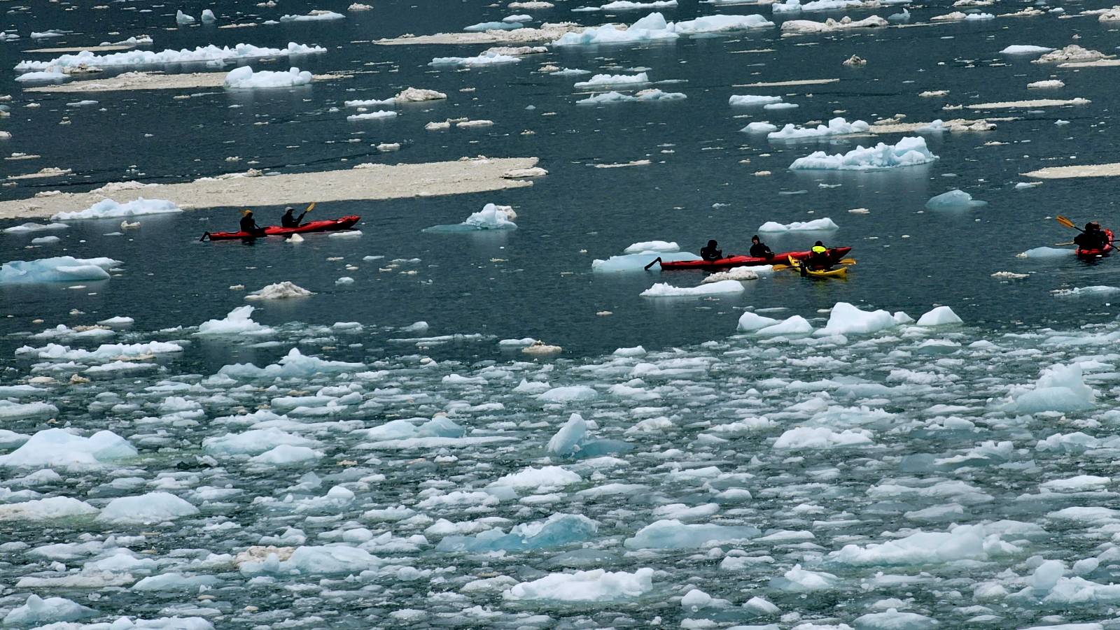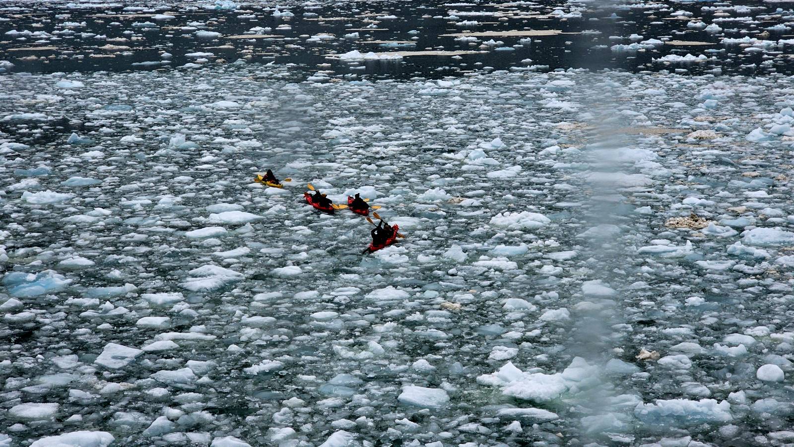 Auf der Schiffseite des Anlegers, bzw. des Ausstiegs hat sich das Eis rasch zu einer großen Fläche zusammengeschoben. Die Zodiaks kommen anfangs kaum zum offenen Wasser durch und am schlimmsten sind die vier Kajaks dran. Sie liegen teilweise auf dem Eis auf und sind oft knapp vor dem Kentern. Erst nachdem die Roald Amundsen sich etwas dreht, löst sich die Eisformation und damit auch das Problem.