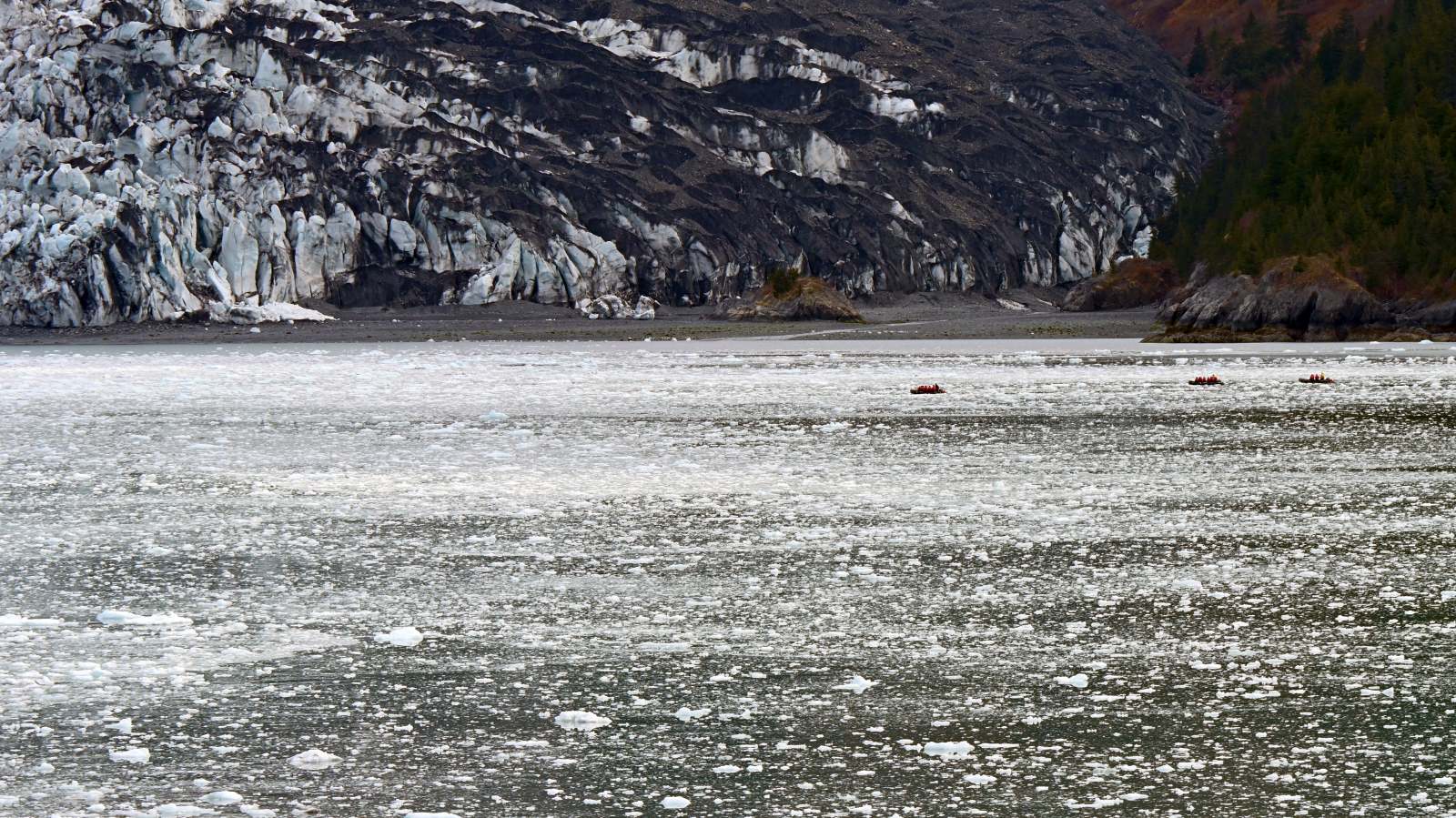 Die Zodiaks kurven ungefähr eine Stunde mit uns an Bord umher und bringen uns dem beeindruckenden Gletscher noch etwas näher. Doch auch von Deck 11 ist die Ansicht bewegend.