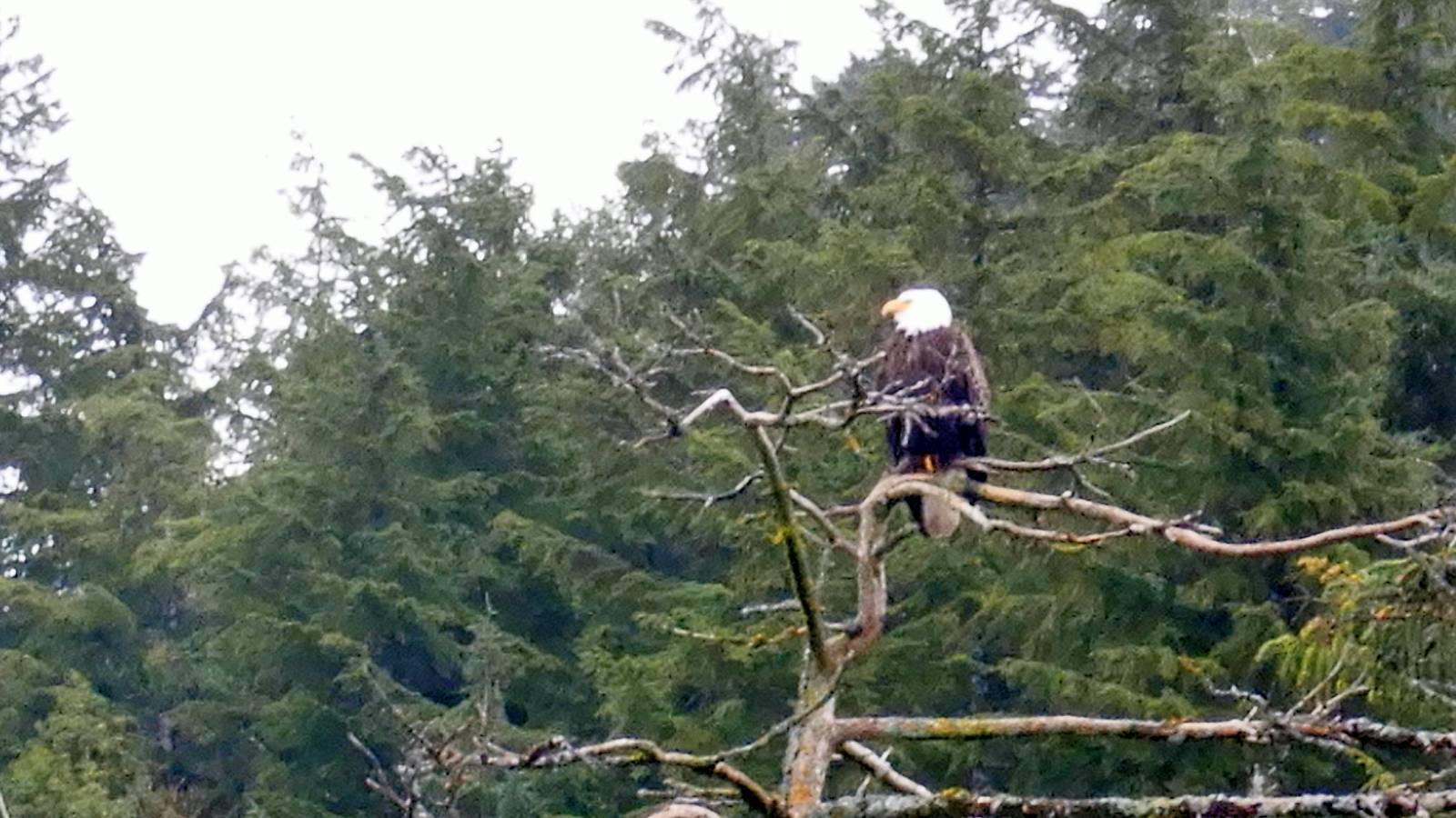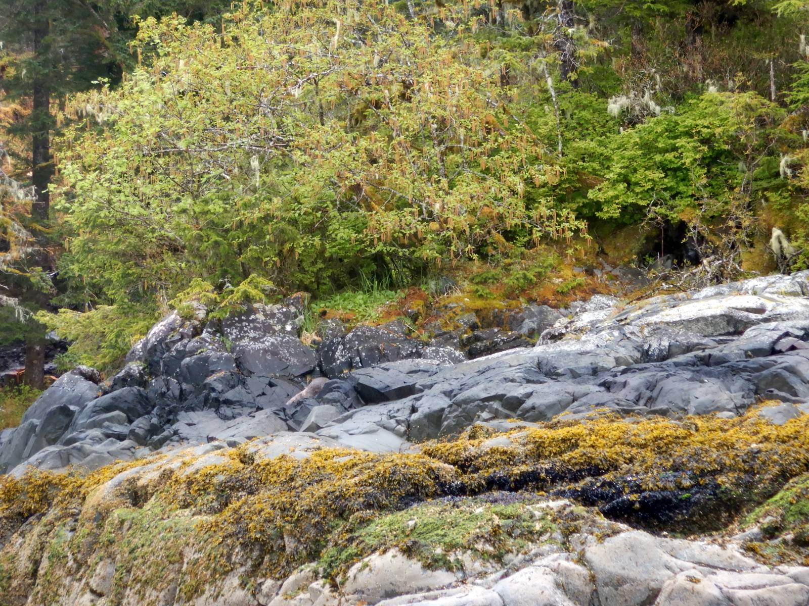 Trotz Touristenmoloch gleich hinter unserem Rücken, können wir nach wenigen Metern einen Weißkopfseeadler betrachten, der über uns in einem Baum sitzt. Auch ein Seeotter ist bald danach zu entdecken, er huscht über einen Felsen. Die Guides zeigen uns große Seesteerne, die an den Felsen kleben, essbaren Seetang - schmeckt sehr gut- und erzählen einiges Beeindruckendes über den Tongass Nationalpark. Allein, dass die Bäume hier nur 1 mm pro Jahr wachsen, gibt jedem Baum eine besondere Wertigkeit.