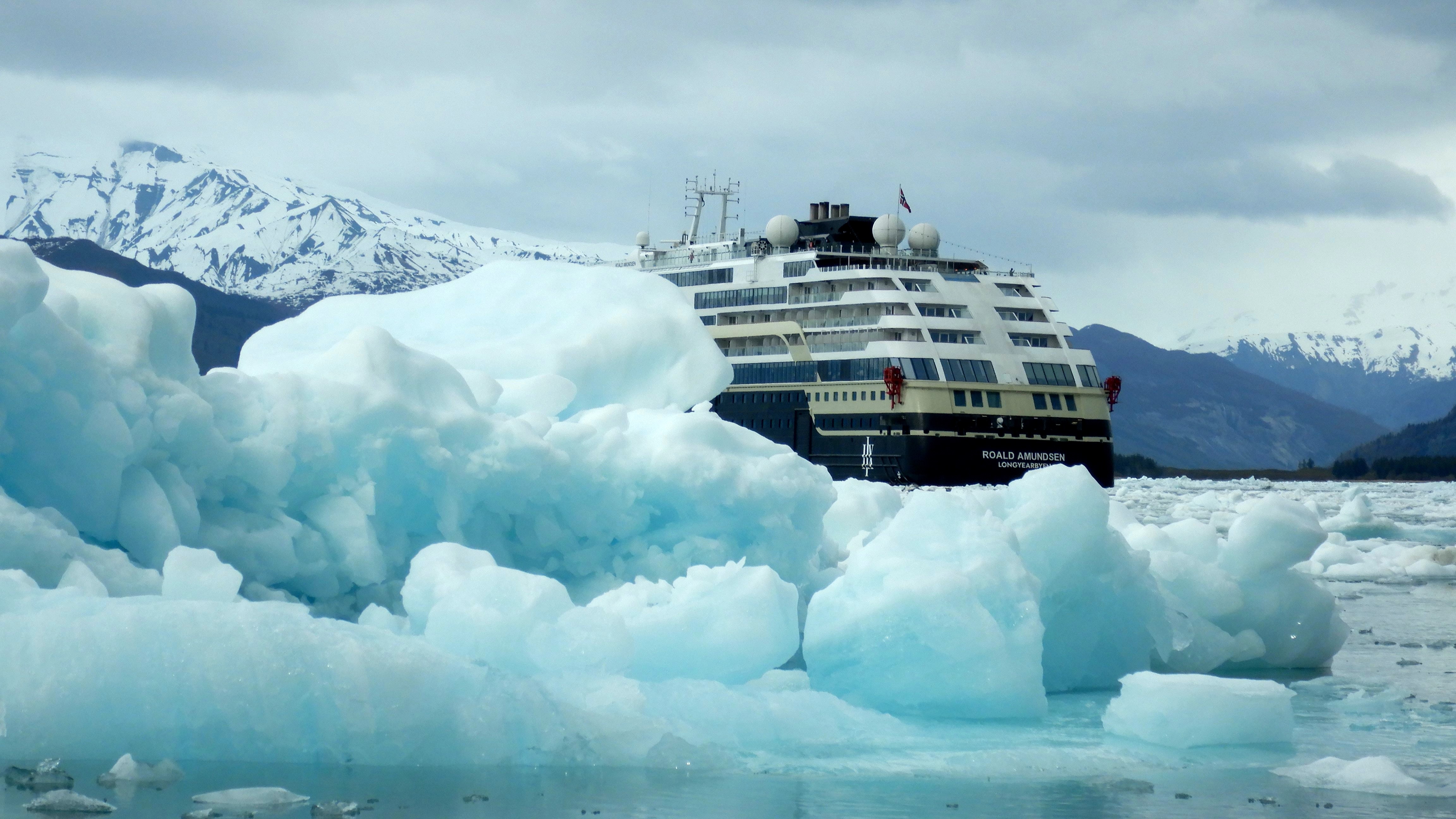 Leider ist soviel Eis unterwegs, dass die Roald Amundsen in angemessener Entfernung stoppen muss und wir den Gletscher nur in der Ferne sehen.