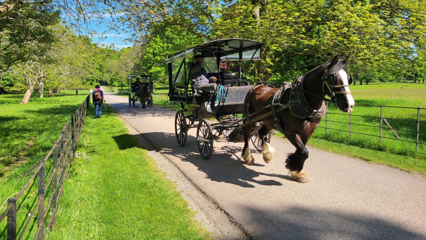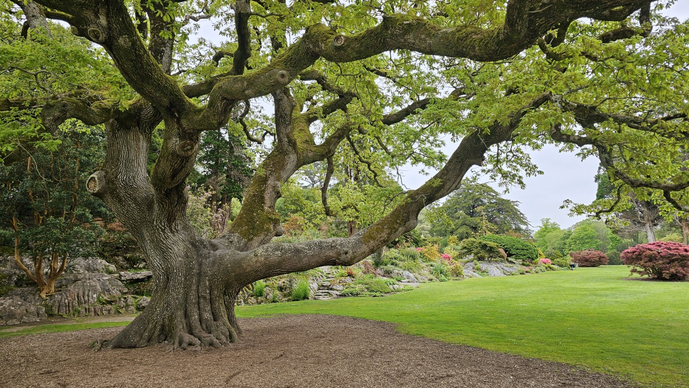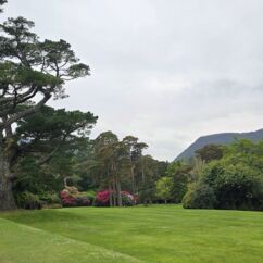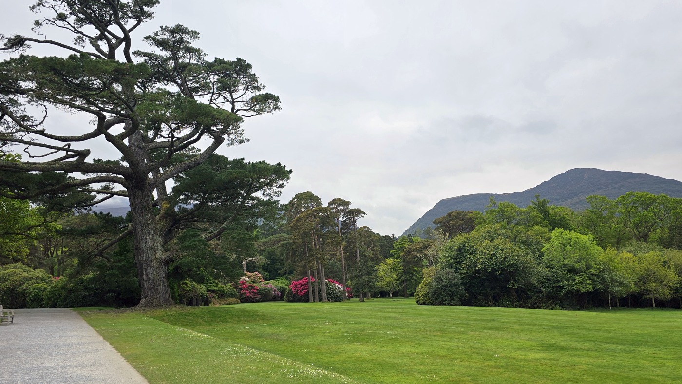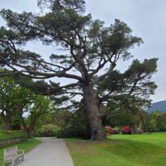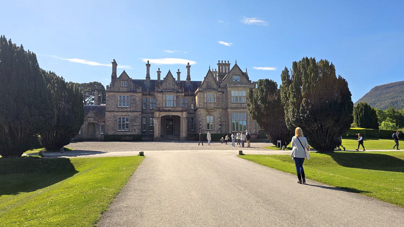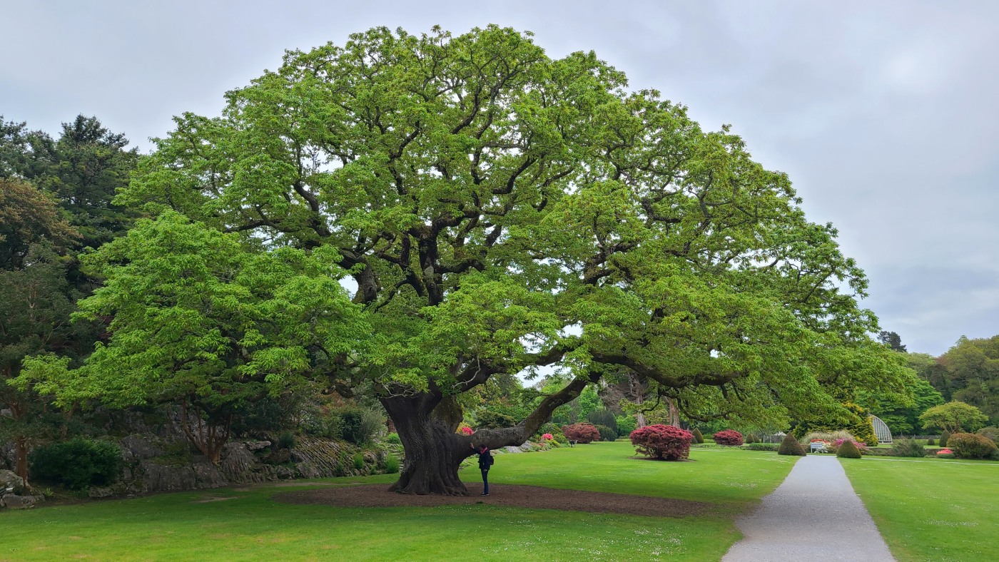 Da wir meinten, weniger Verkehr in der anderen Richtung zu haben, starten wir entgegengesetzt und fahren zuerst durch den Killarney Nationalpark. Unser erster Stopp ist bei Muckross House & Garden, einem Herrenhaus aus dem Mittelalter mit einem herrschaftlichen Park und finden Baumriesen und Rhododendren in einer Größe vor, wie wir sie selten gesehen haben.