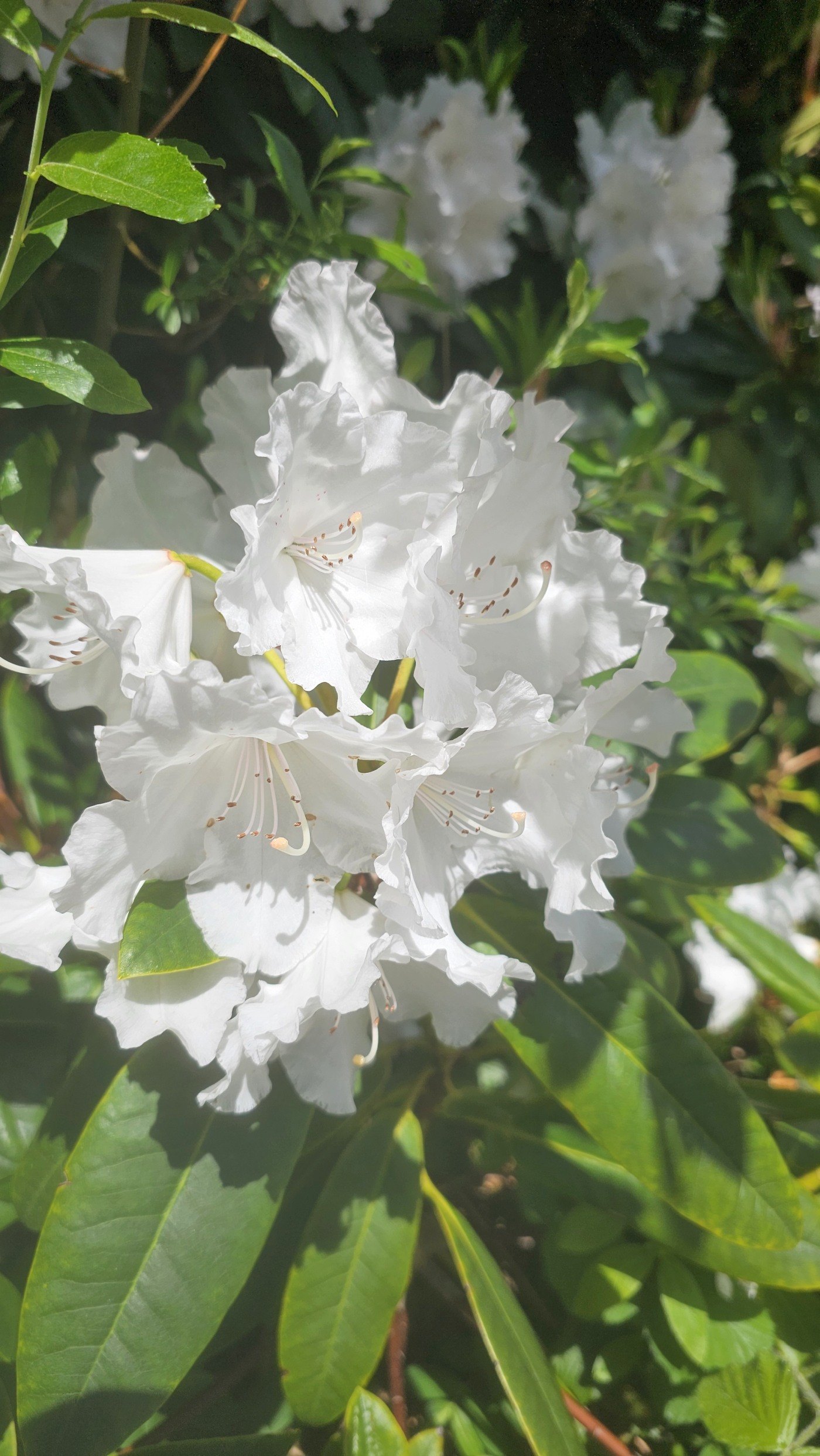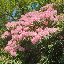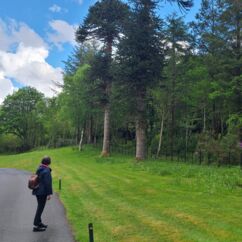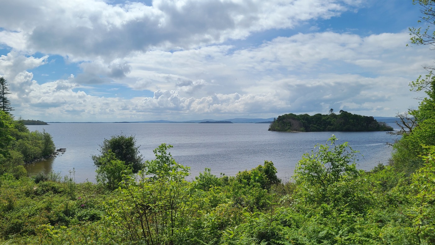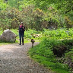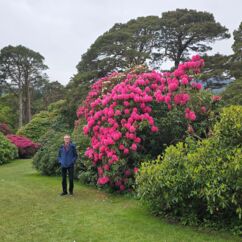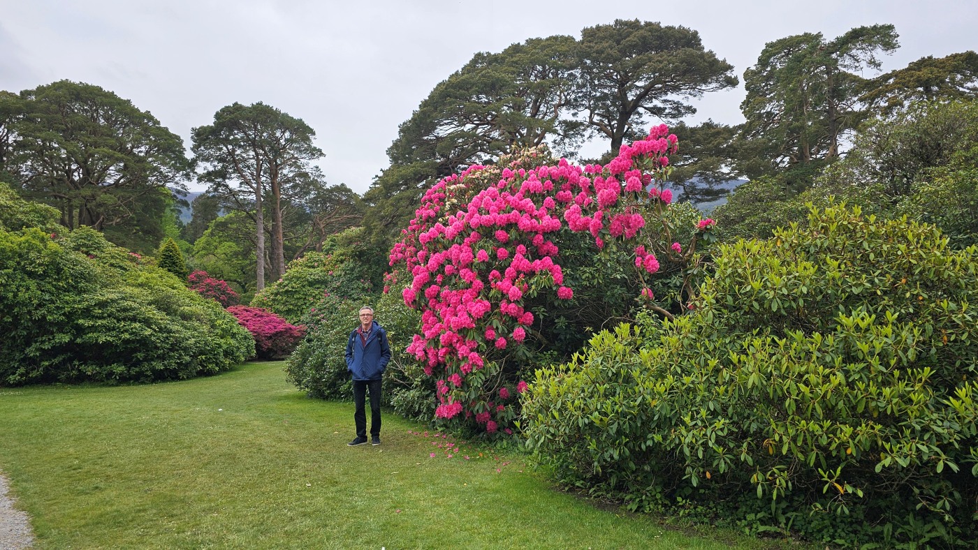 Heute starten wir beim Muckross House im Killarney National Park und wandern zehn Kilometer um den See herum. Ein Großteil des Weges führt durch den Wald mit Baumriesen von Kiefern, Eichen, Ilex, Lebensbäumen und Eiben, dazwischen wild wachsenden lila Rhododendren. Nach der Hälfte des Weges kommen wir an einem Cottage vorbei mit einem großen Kamelienbaum und Rhodendren in vielen verschiedenen Farben.