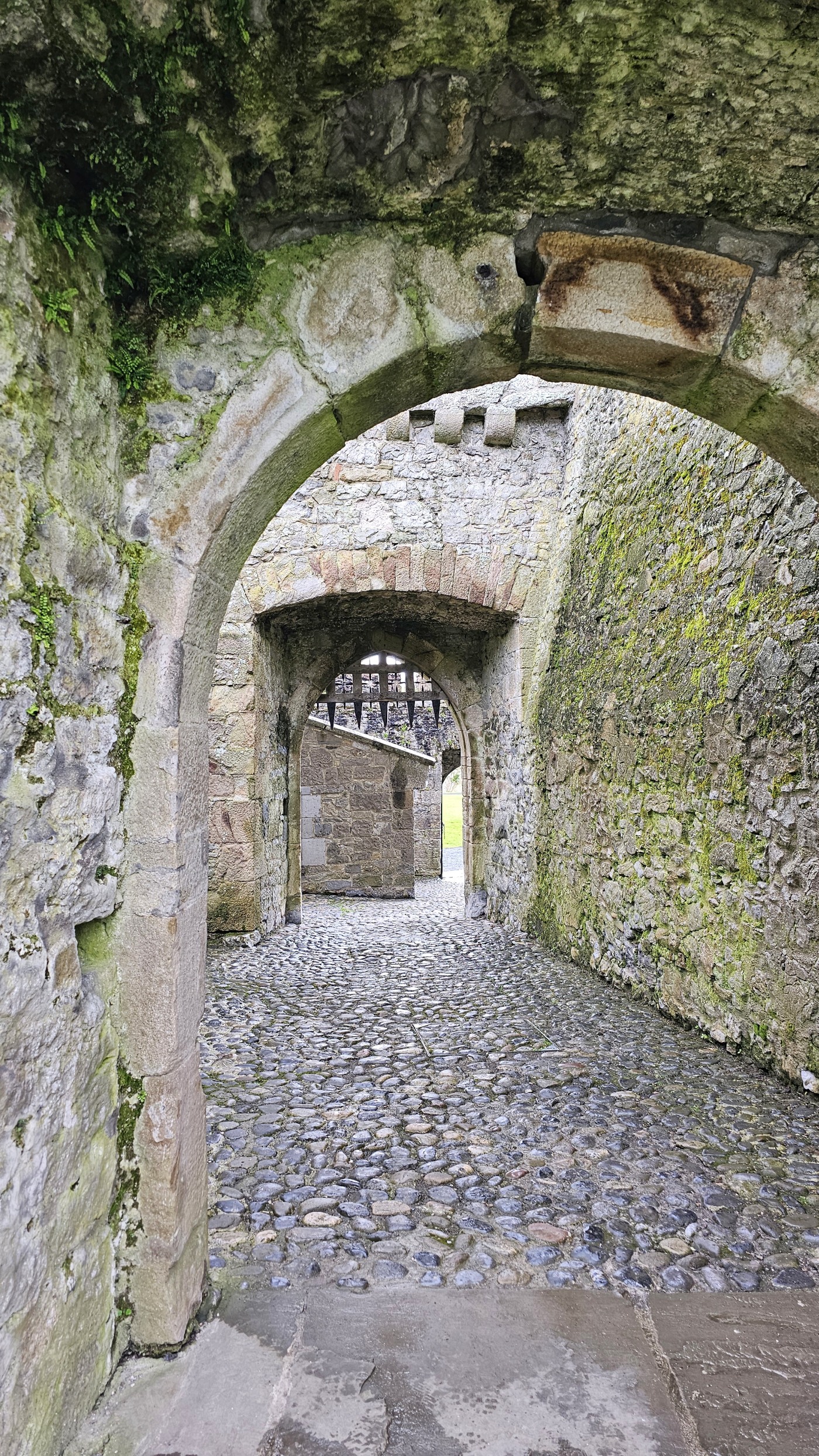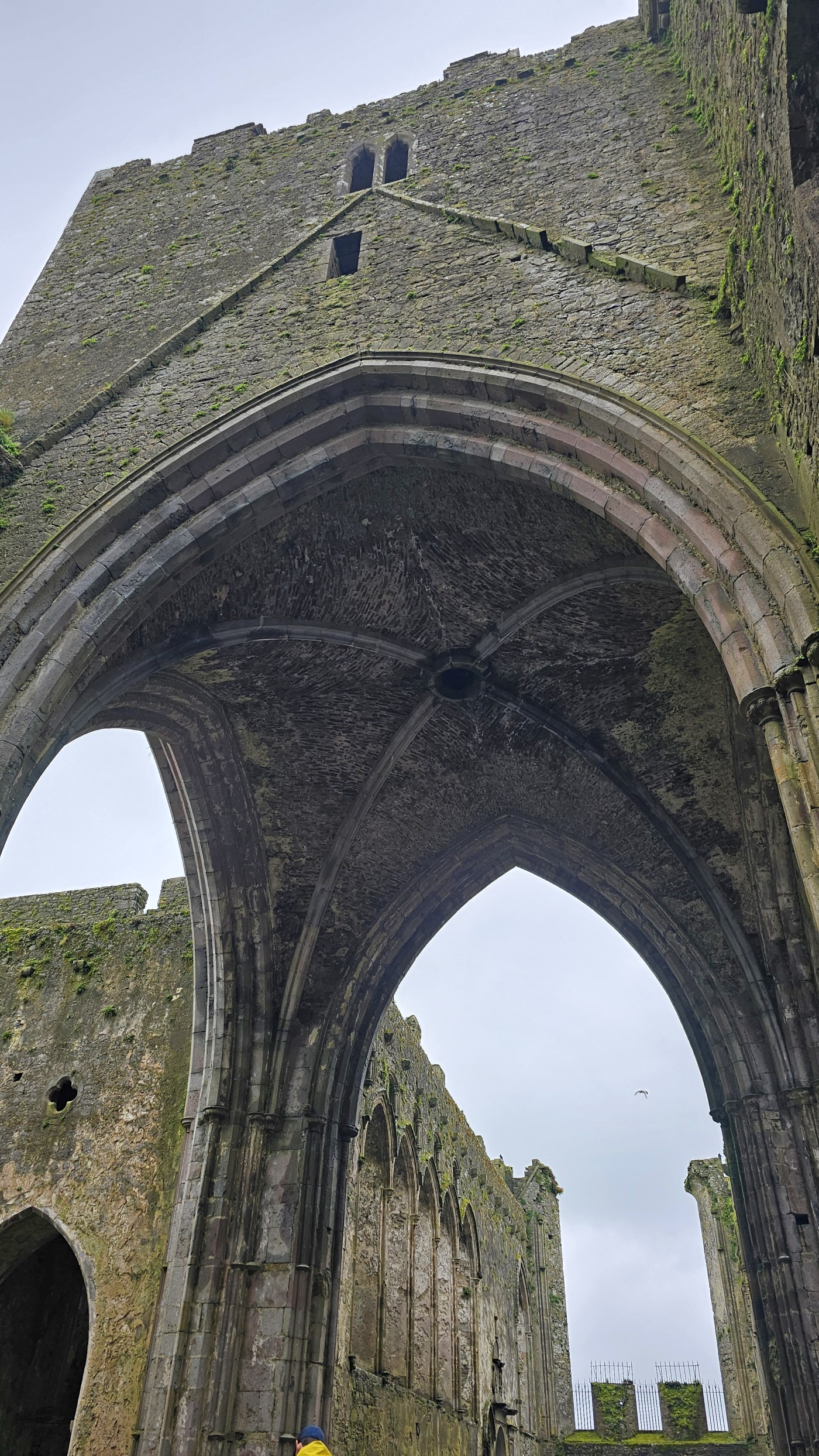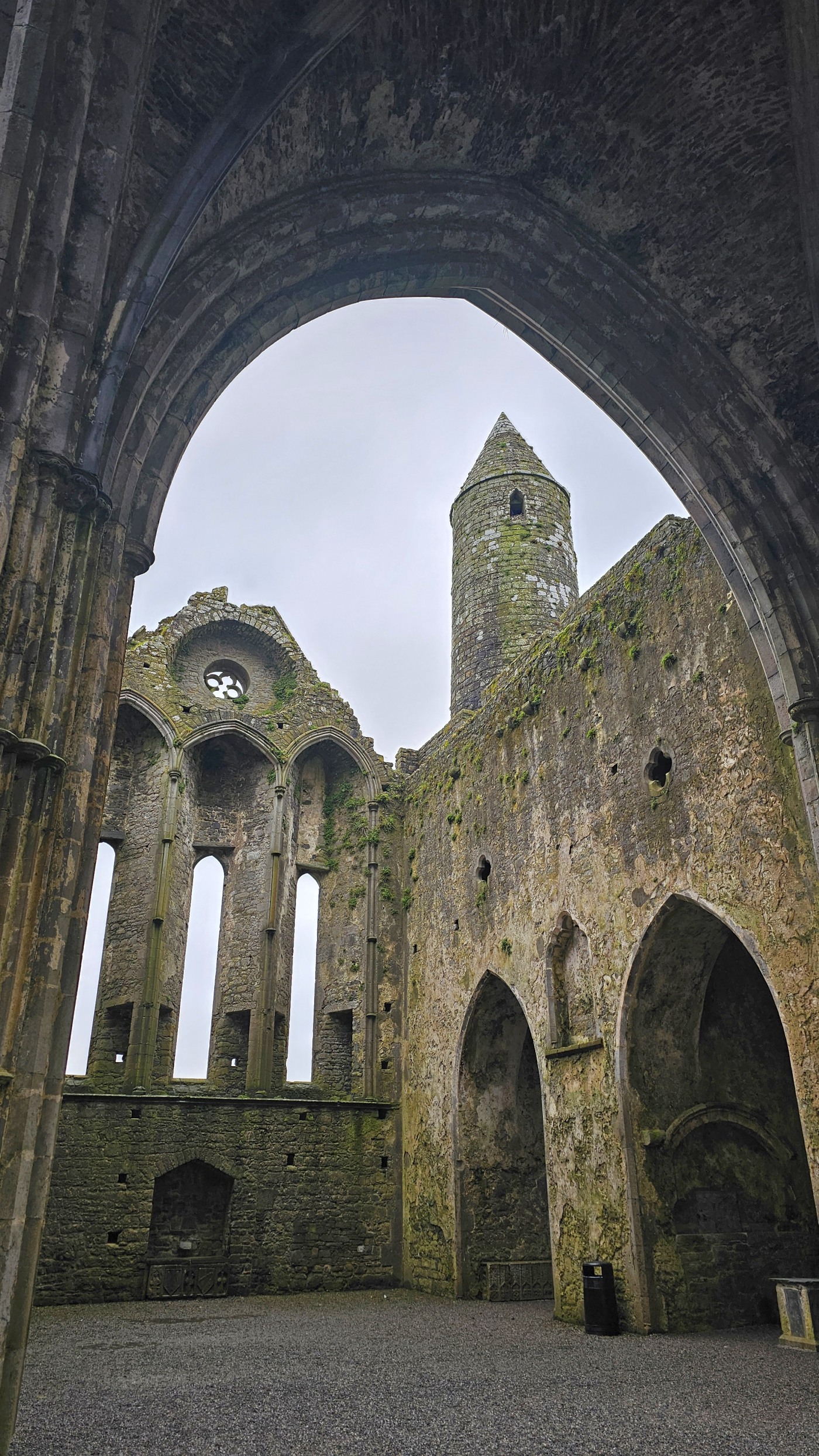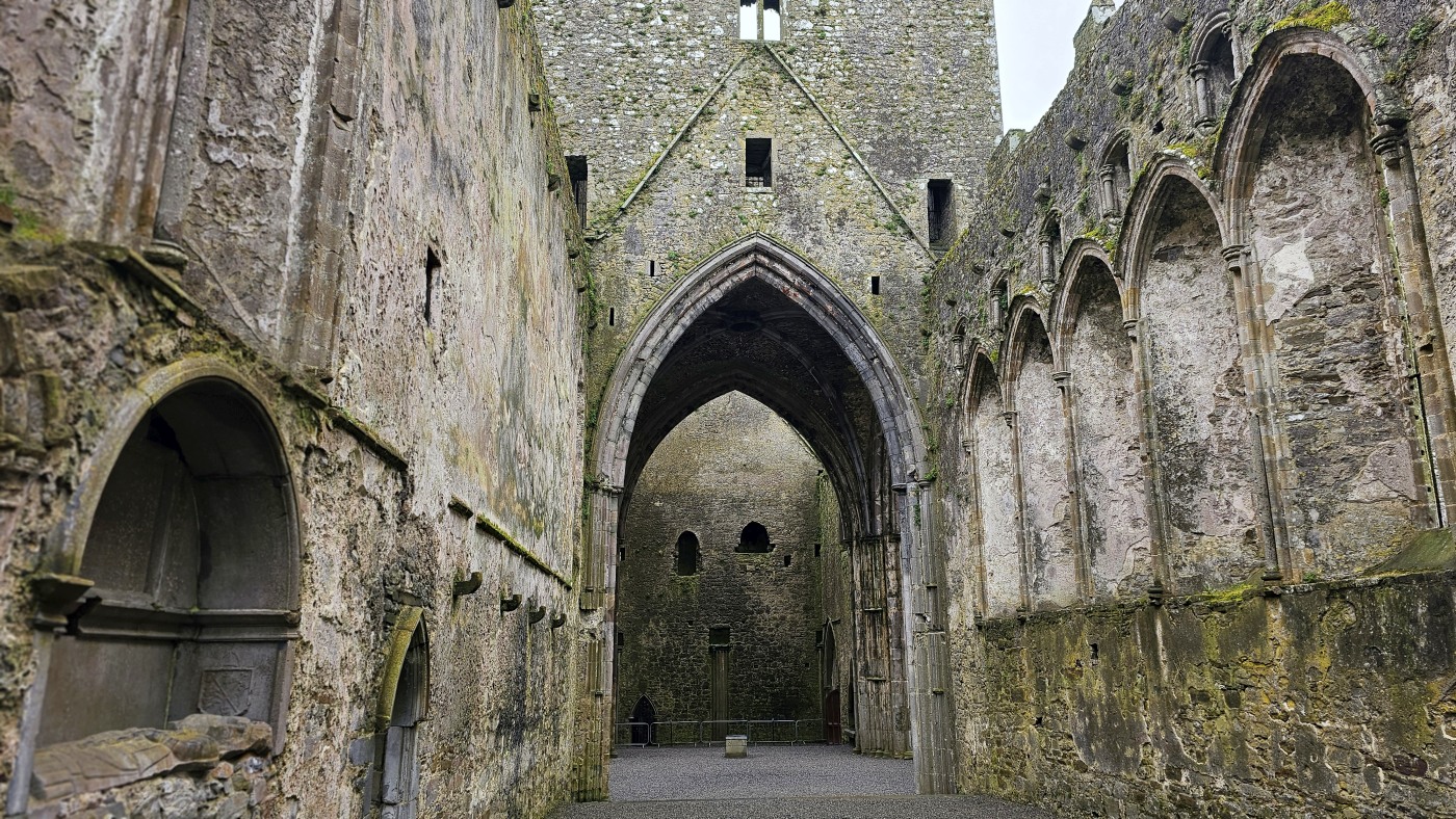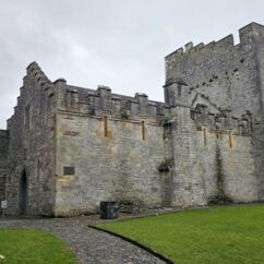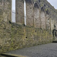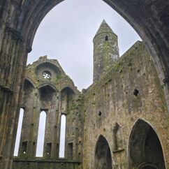 Die Burg auf dem Rock of Cashel ist älter und in weniger gut erhaltenem Zustand. Innenräume sind nicht zu besichtigen, doch die Ruine ist um ein Vielfaches höher und auch größer. Ein beeindruckendes Monument mit vielen Grabplatten, einem großen Friedhof und Krähen, die ihre Nester in den Wänden angelegt haben. Sie kreisen bei dem Nieselwetter über der Ruine und das sieht schon ein wenig gruselig aus.