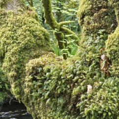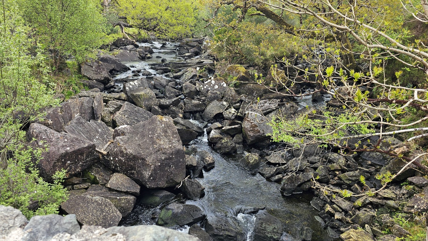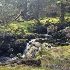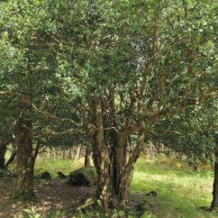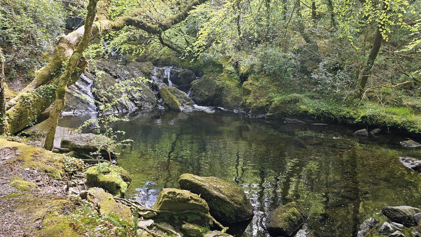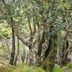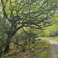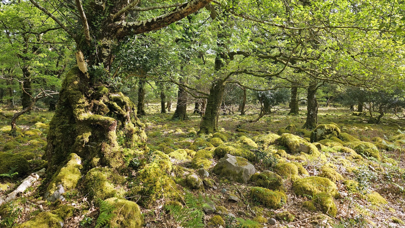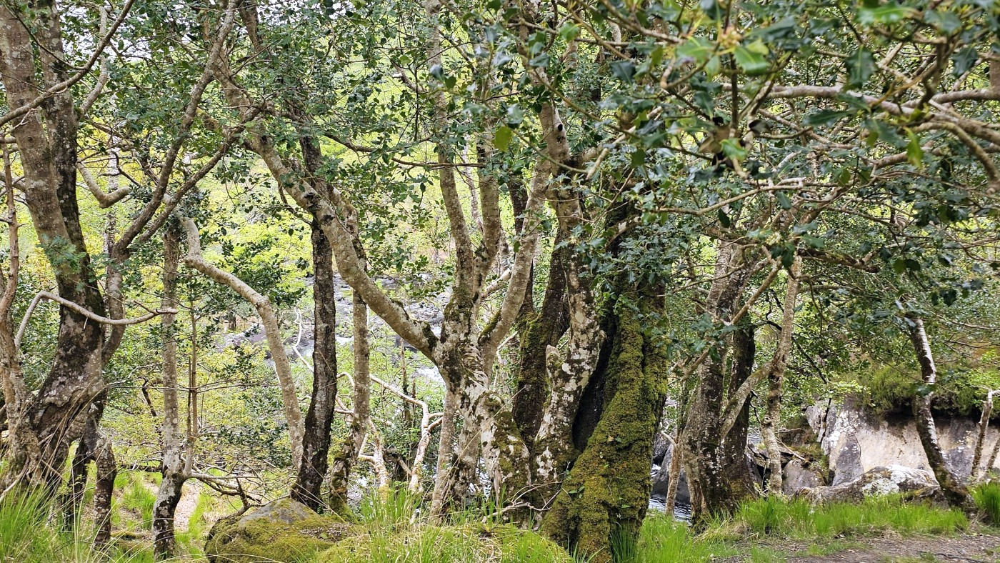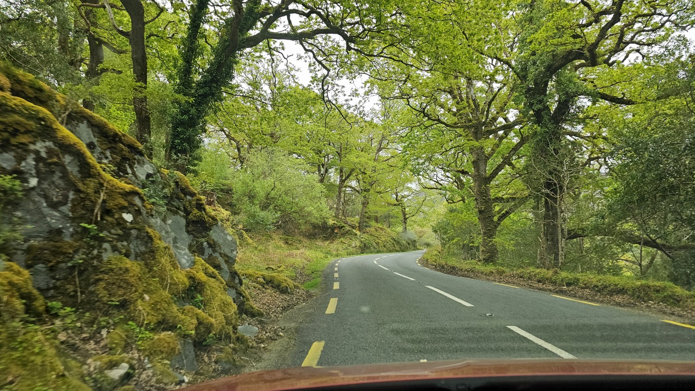 Der Waldboden und viele Bäume sind mit Moos bewachsen - das sieht sehr verwunschen aus. Ähnliches kennen wir nur aus Schweden oder Island und wir fragen uns, ob die Iren auch an märchenhafte Trolle glauben. Vorstellbar wäre es... Viele uralte Ilex wachsen hier und ihr Blätterdach bildet die erste Ebene vor dem darüberliegenden Blätterdach der knorrigen alten Eichen und anderen Bäume.