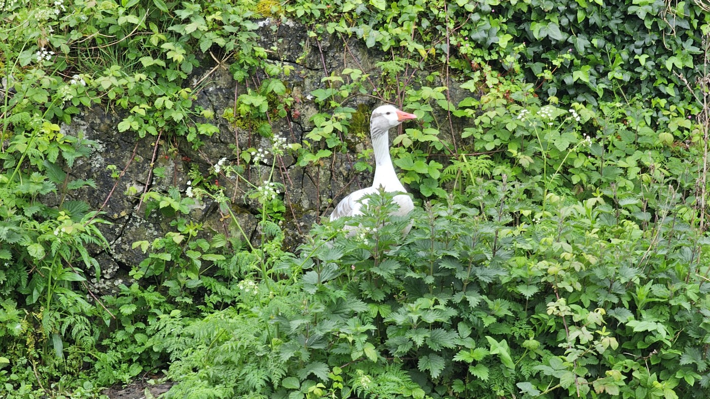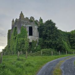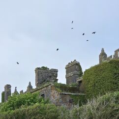 Abends machen wir einen Spaziergang zu einer verfallenen Burgruine, die wir von unserem Häuschen aus in der Ferne sehen. Leider verbietet ein Schild das Betreten des Geländes. Und so sehen wir nur von der Straße auf die kreisenden Krähen und Mauerreste, die vom Efeu fast überwuchert sind. Würde es hier spuken - es würde uns nicht wundern ;)
