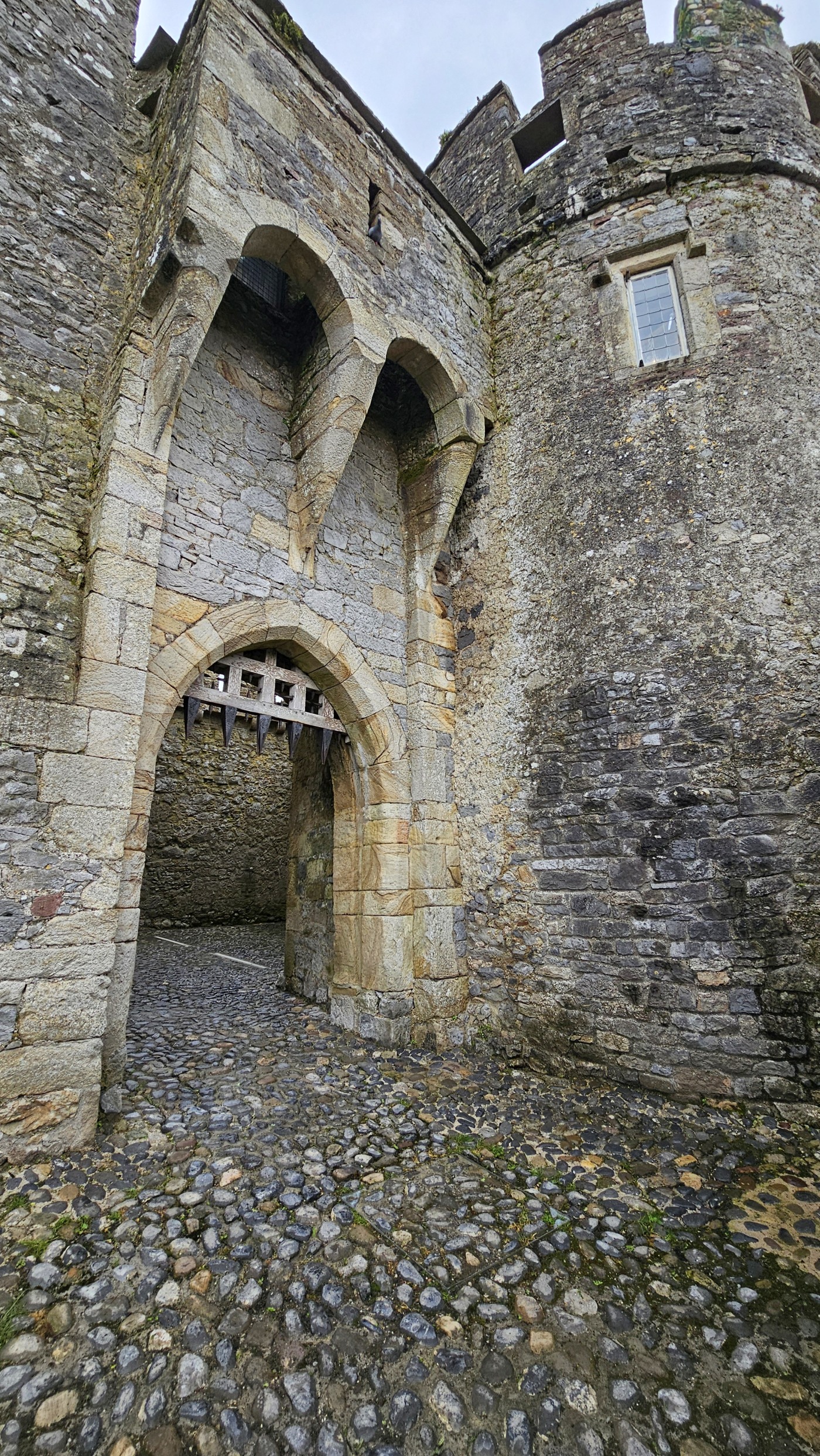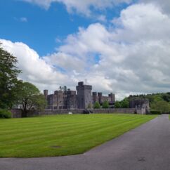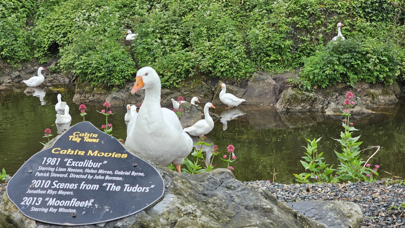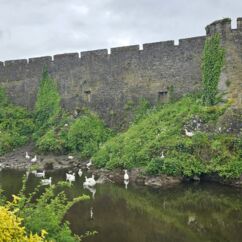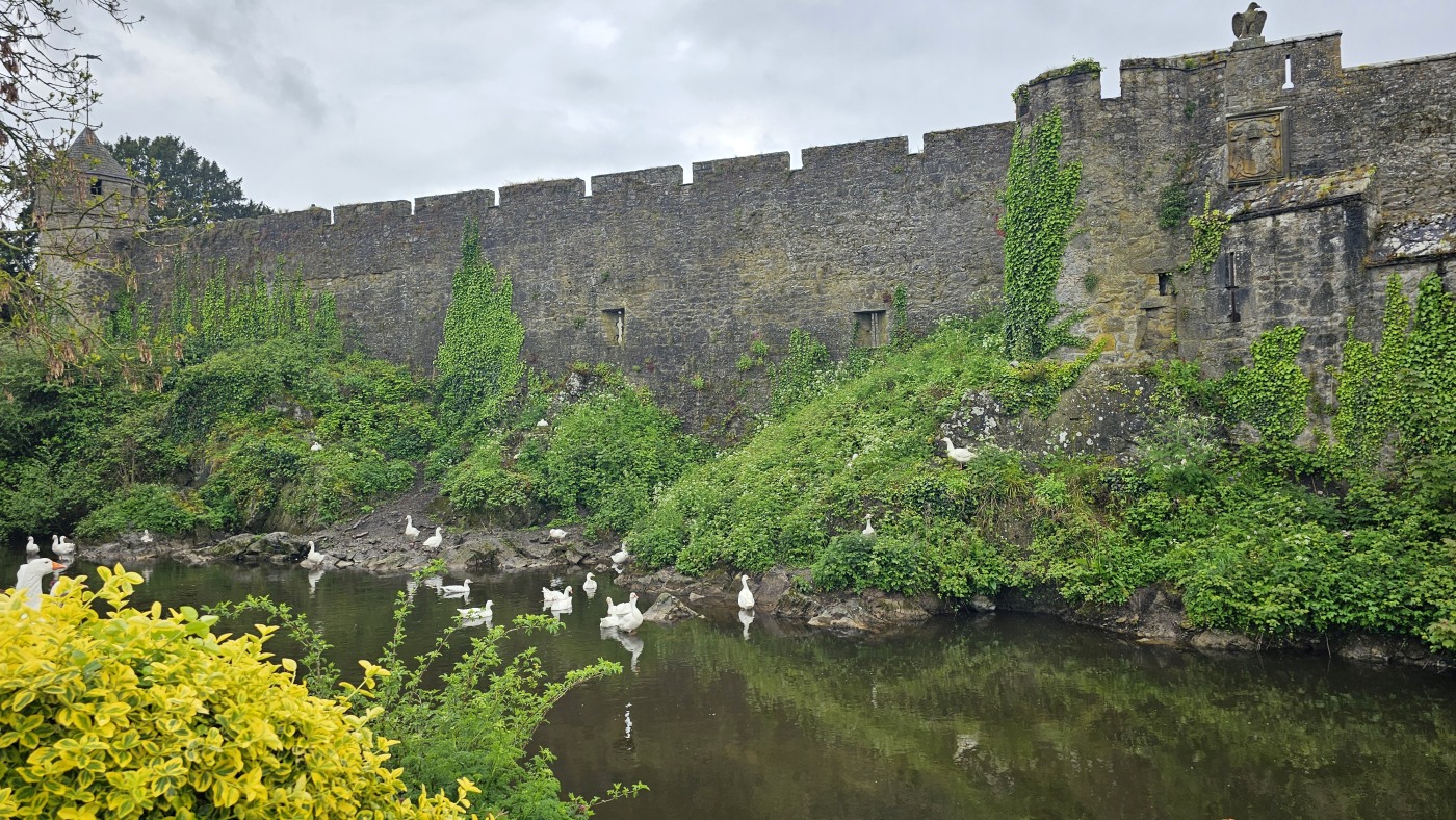 Cahir Castle ist nur 45 Minuten Fahrtzeit von Waterford entfernt. Bereits vom Parkplatz aus beeindrucken die hohen Mauern hinter dem Wassergraben. Die Wände sind hoch bewachsen und Gänse brüten dort im Efeudickicht. An einer kleinen Brücke zum Festungsgarten stehen zwei uralte riesige Bäume. Der eine ist mir völlig unbekannt. Kleine Blätter wie ein Rhododendron, ist aber keiner.