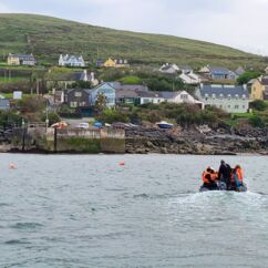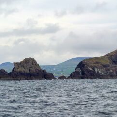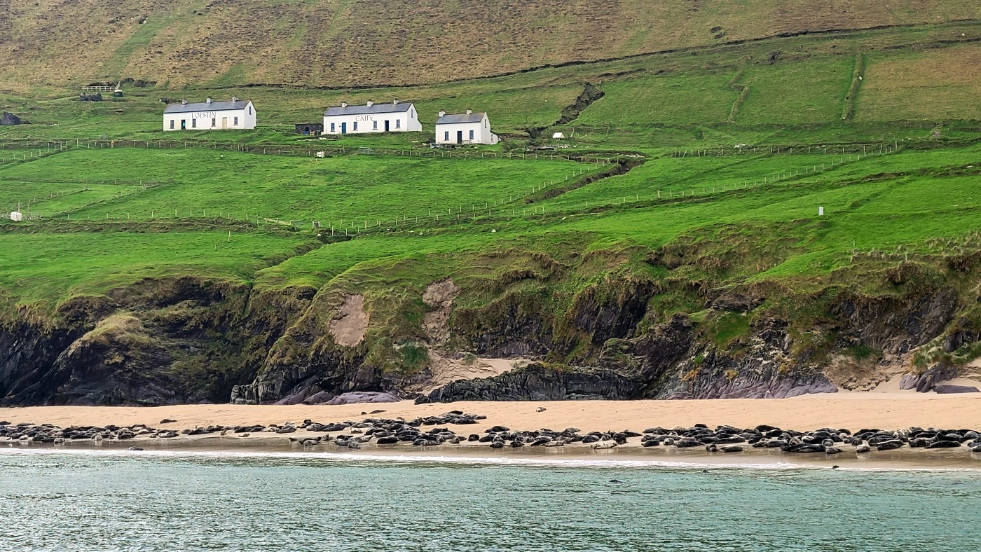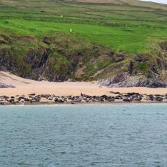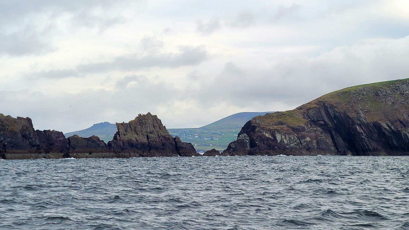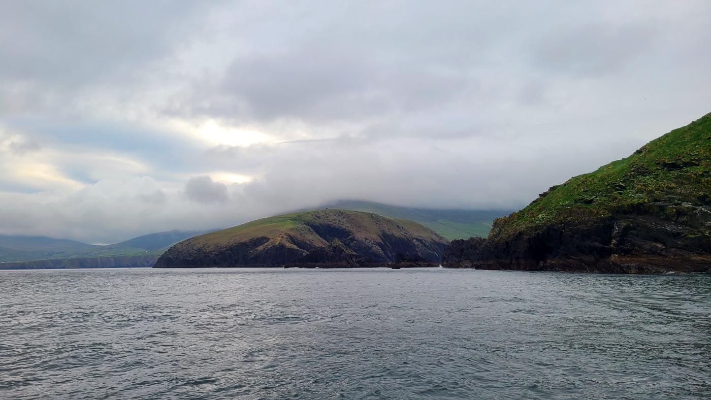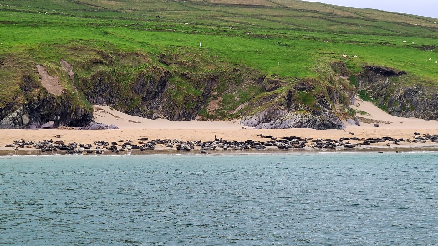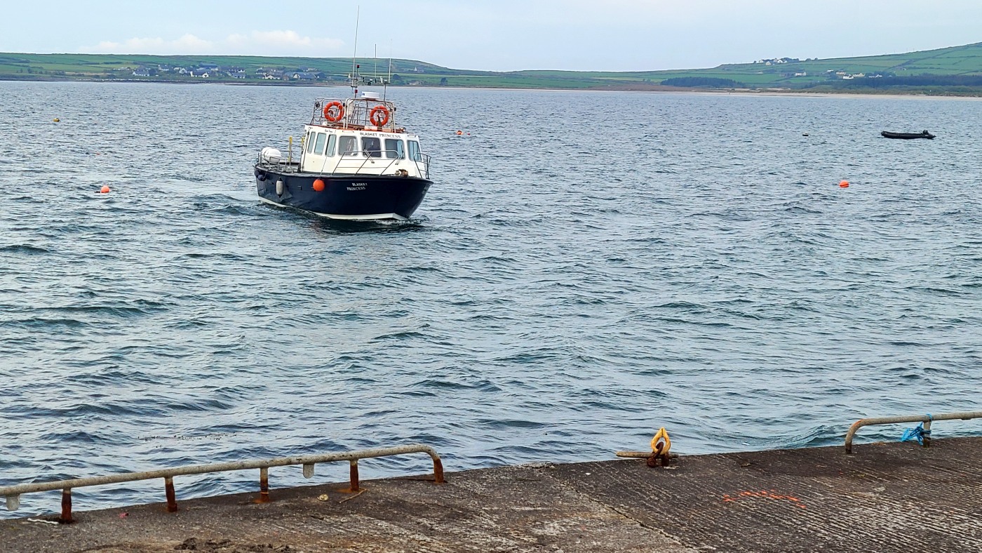 Wir fahren eineinhalb Stunden bis zum Ablegepier in Ventry - das ist fast am Ende der Halbinsel Dingle und steigen mit knapp zwanzig weiteren Passagieren in ein kleines Boot. Der spätere Ausstieg wird etwas umständlicher werden, denn ca 5 Meter abfließendes Tidenwasser während der Fahrt macht das Umsteigen in ein kleines Beiboot erforderlich, um an Land zu gelangen.