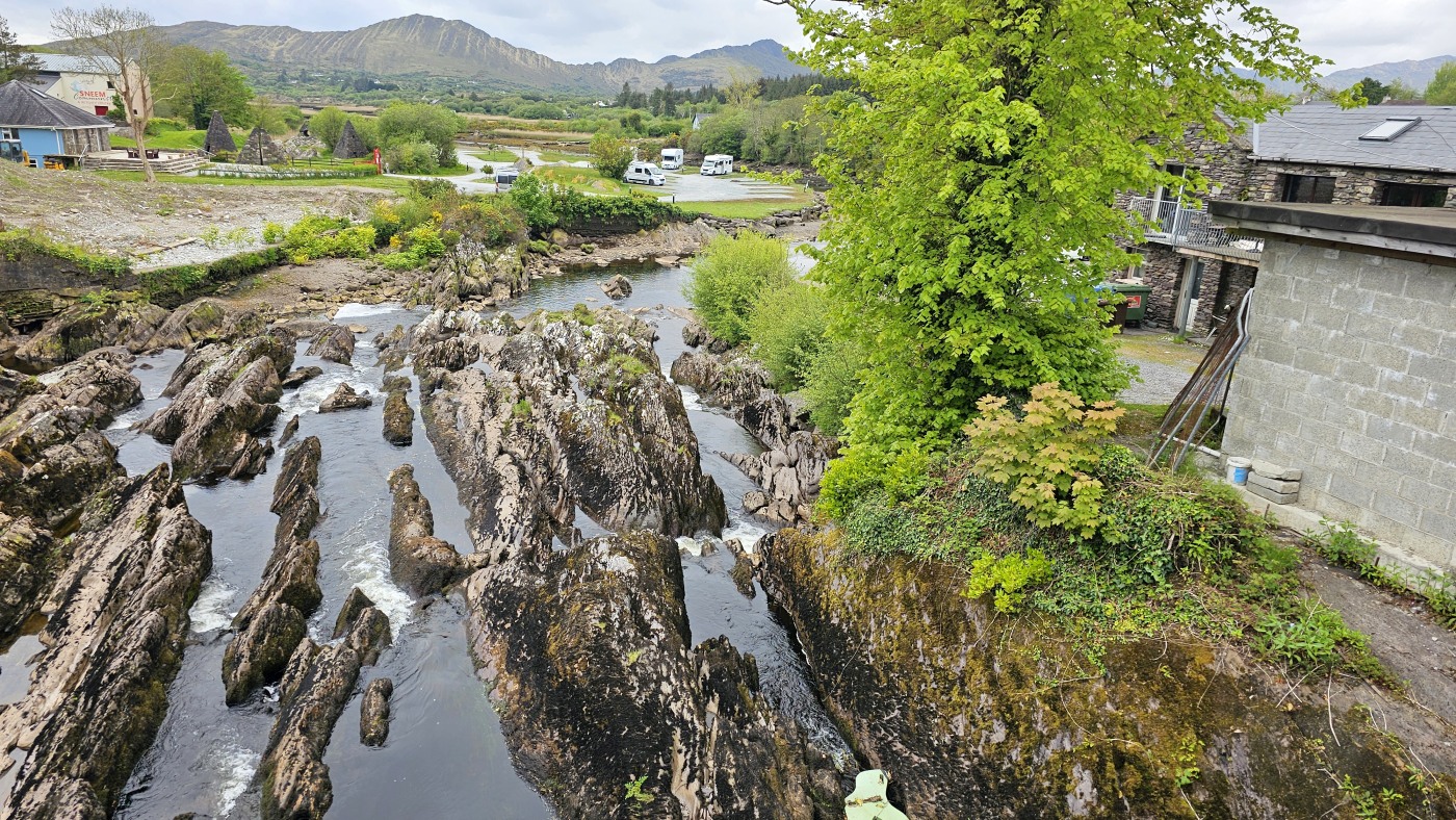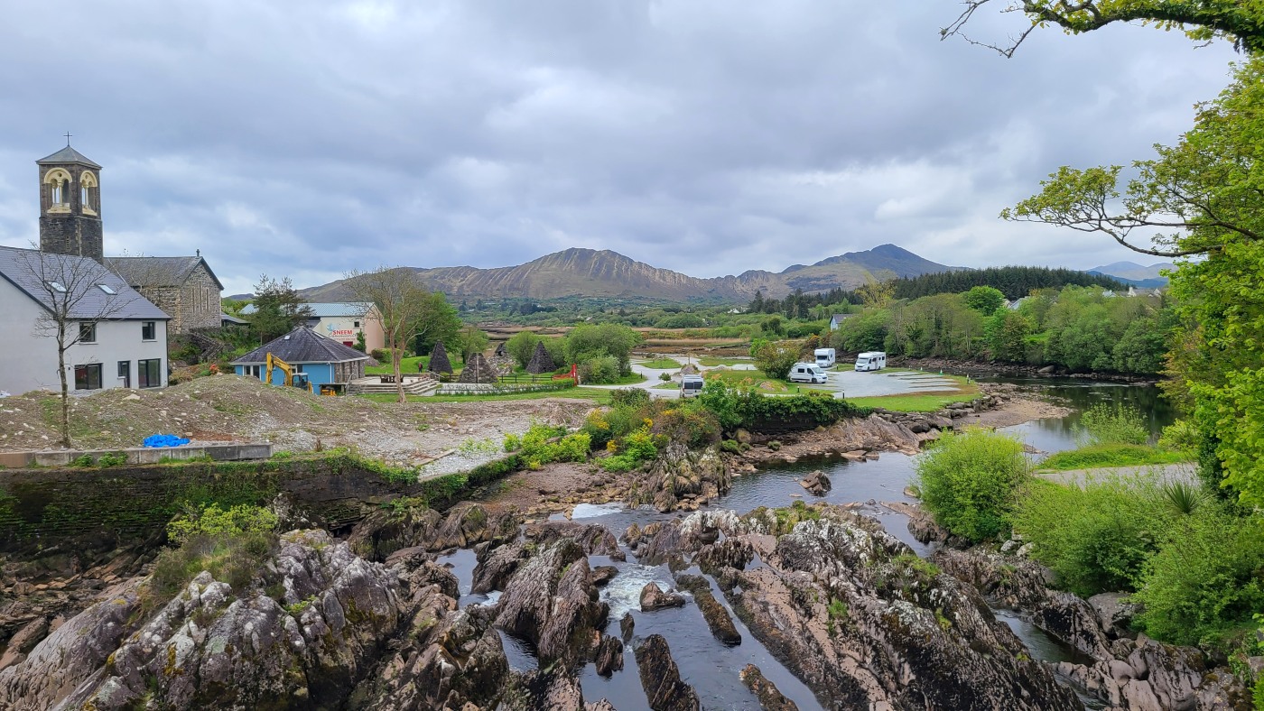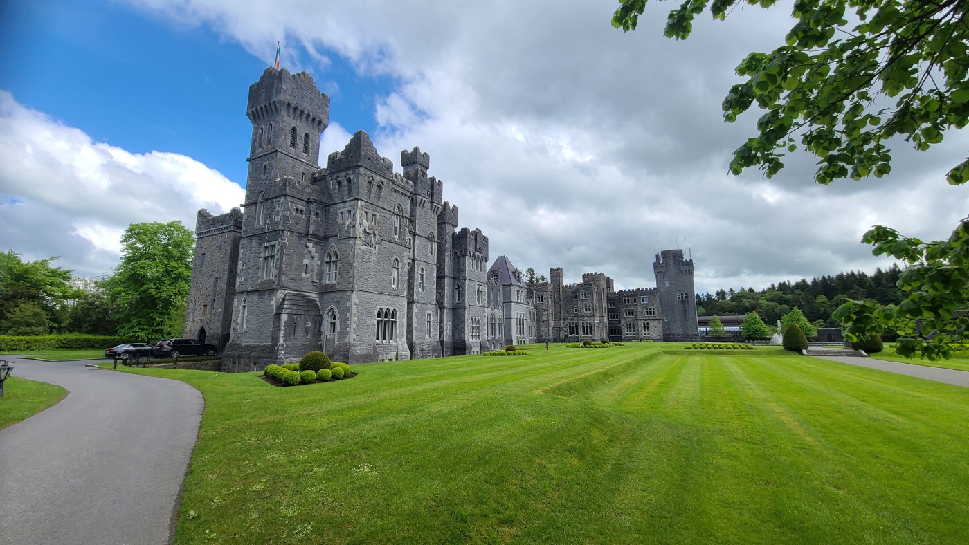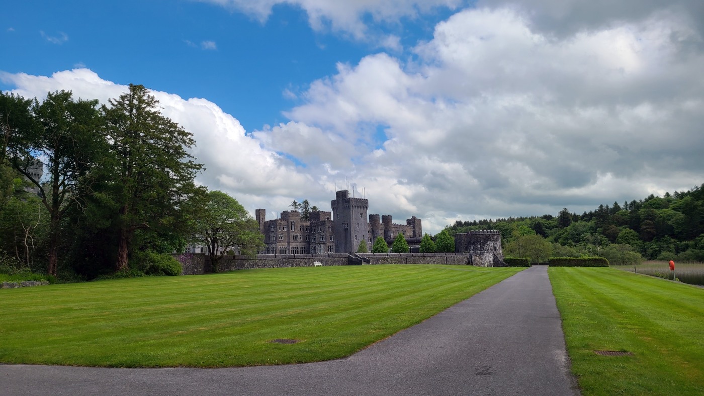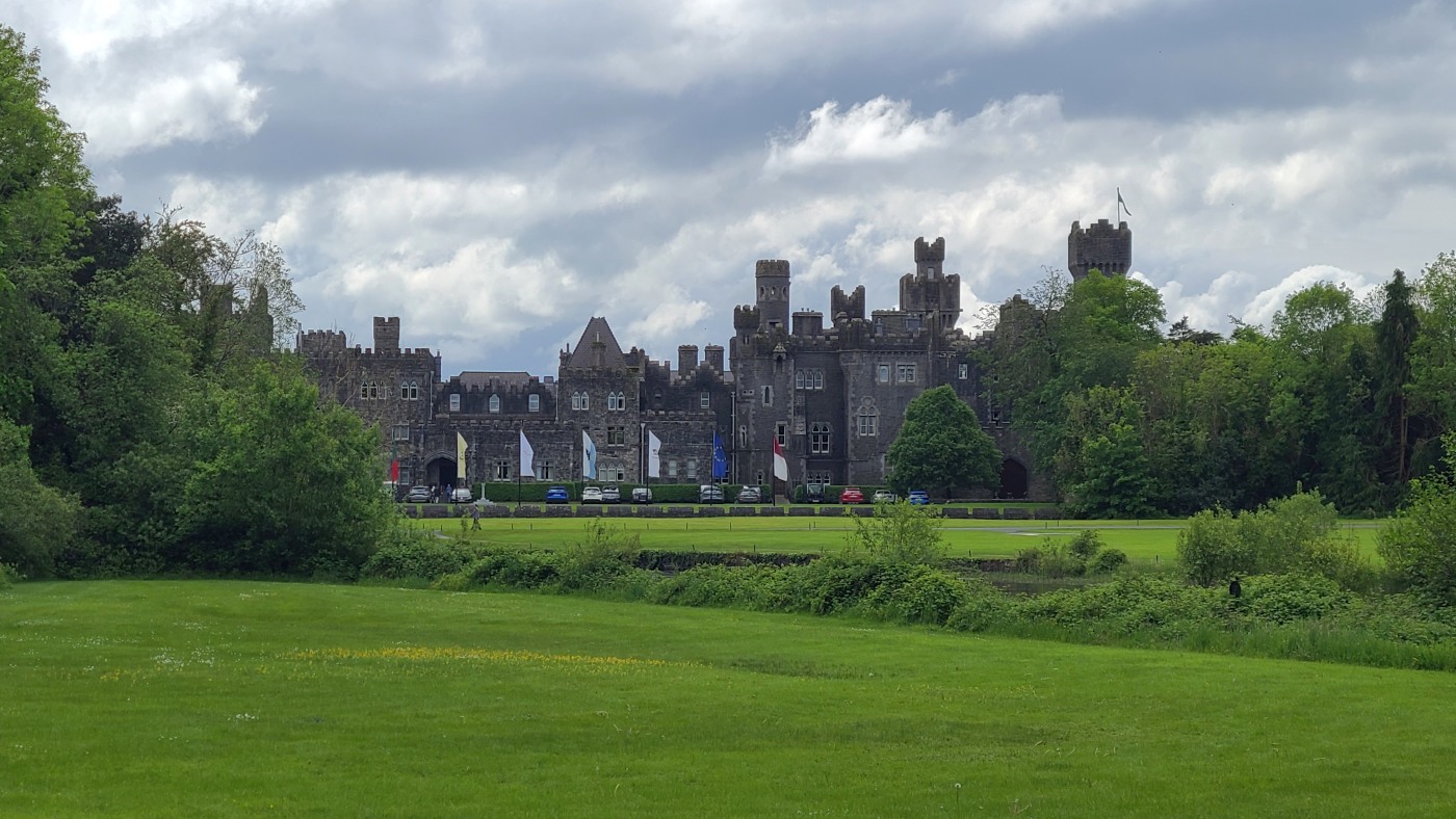 Die Ortschaft Cong liegt an einem See inmitten eines großen Waldgebietes und wir hatten uns vorgestern über Komoot eine neun Kilometer lange Runde ausgesucht. Eine Überraschung gab´s am Ende. Ein elegantes Schild mit Wappen wies darauf hin, dass man nun Privatbesitz betreten würde. Hunde müssten an die Leine, Hinterlassenschaften mitgenommen werden, Wild dürfe nicht gefüttert werden, Müll nicht liegenlassen, usw. Die Liste war lang und enthielt sogar die Aufforderung, angemessene Kleidung zu tragen. Der Weg führte uns uns dann irgendwann aus dem Wald heraus, kamen an zwei Tennisplätzen vorbei und wir landeten im unfassbar großen Schlossparkgelände des Hotels Ashford Castle. Vor dem Eingang Diener in Livree, vor dem Schlossgraben und den zwei Eingangsrundbögen an den Enden der Brücke Bedienstete, ein Hubschrauberlandeplatz und eine gepflegte Rasen- und Gartenanlage, die sicherlich ein Heer von Gärtnern benötigt. Eine Übernachtung mit Frühstück inkl. vorgewärmten Handtüchern, Bettwäsche aus ägyptischer Baumwolle mit Schlosswappen, Obstkorb, Rundumservice und was man sonst so im Leben braucht, kostet hier nur 985 €. Bei dem Ambiente sicherlich ein Schnäppchenpreis ;)