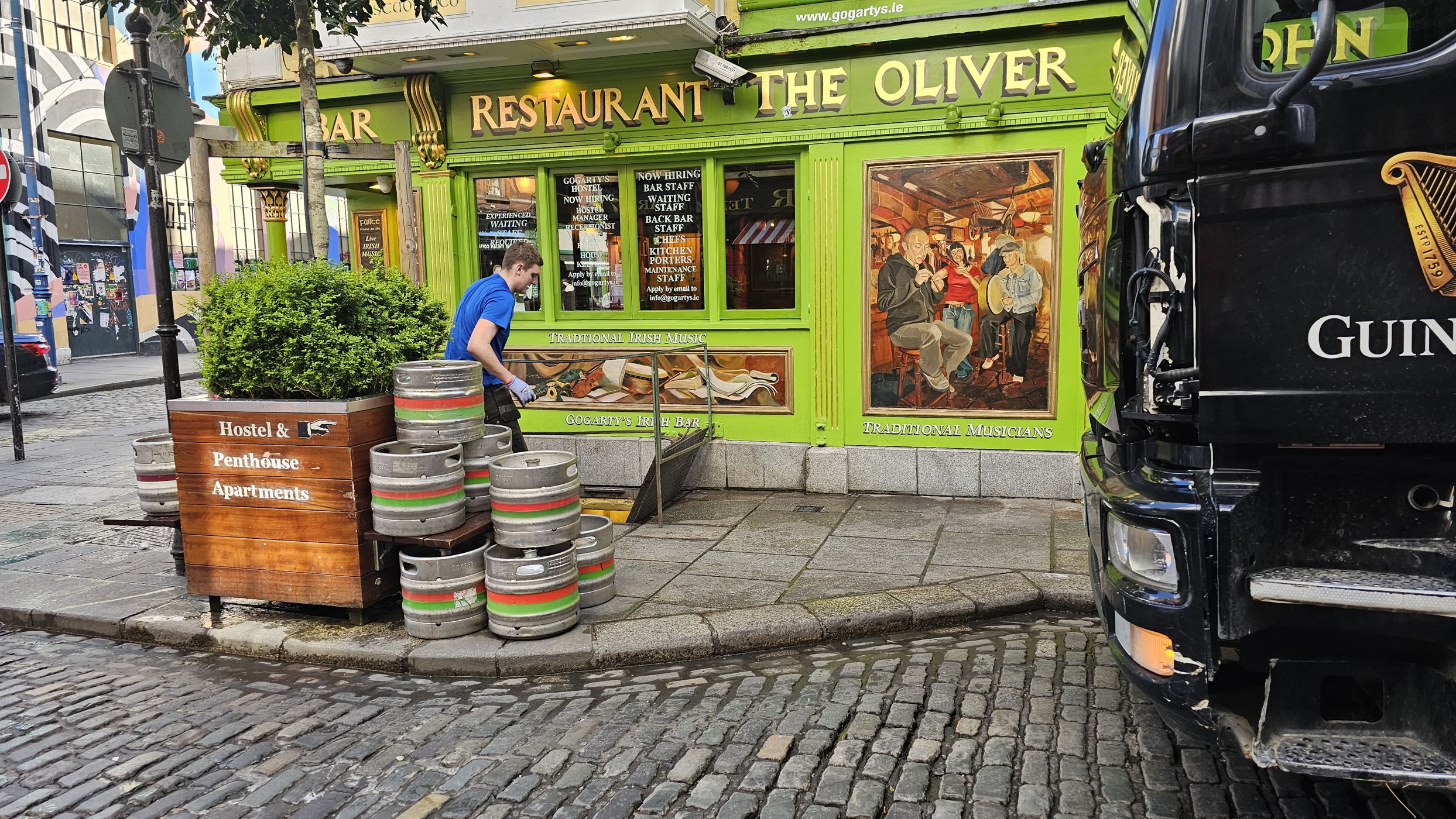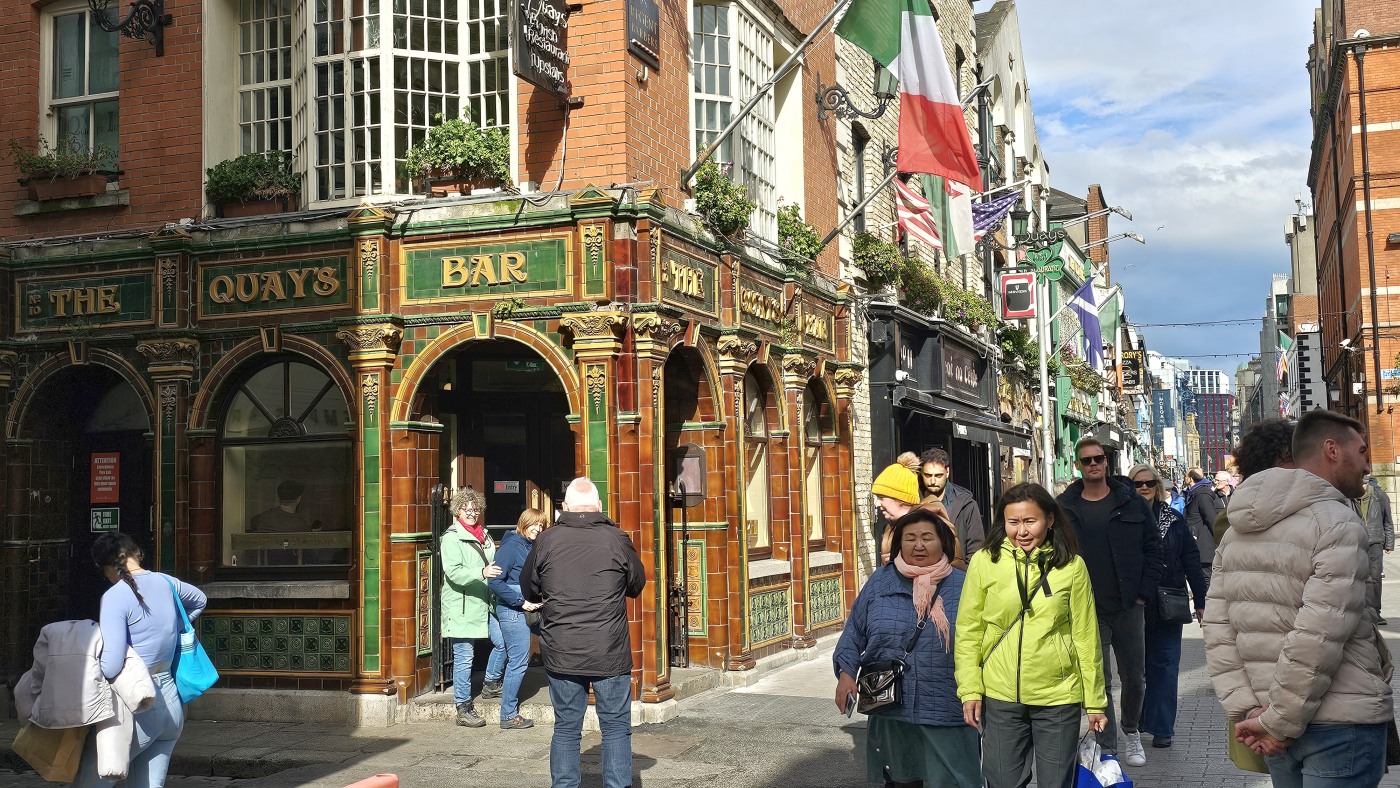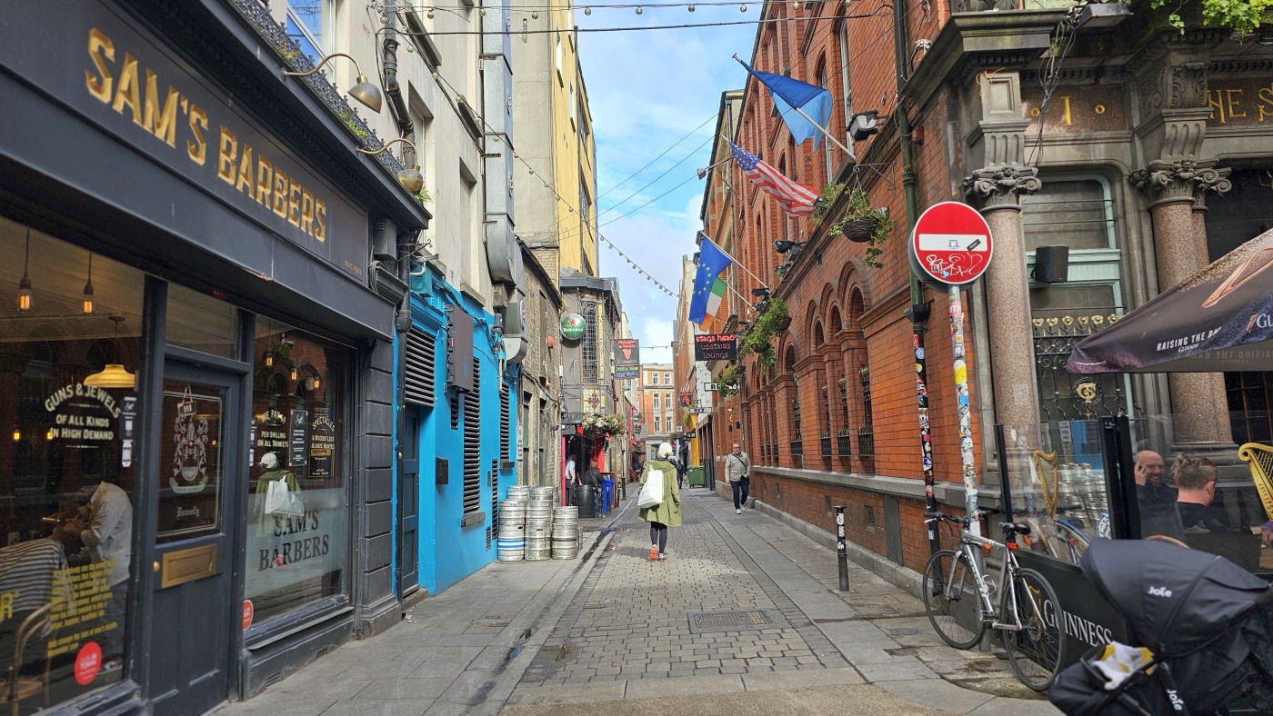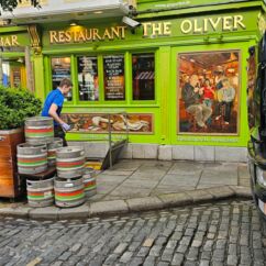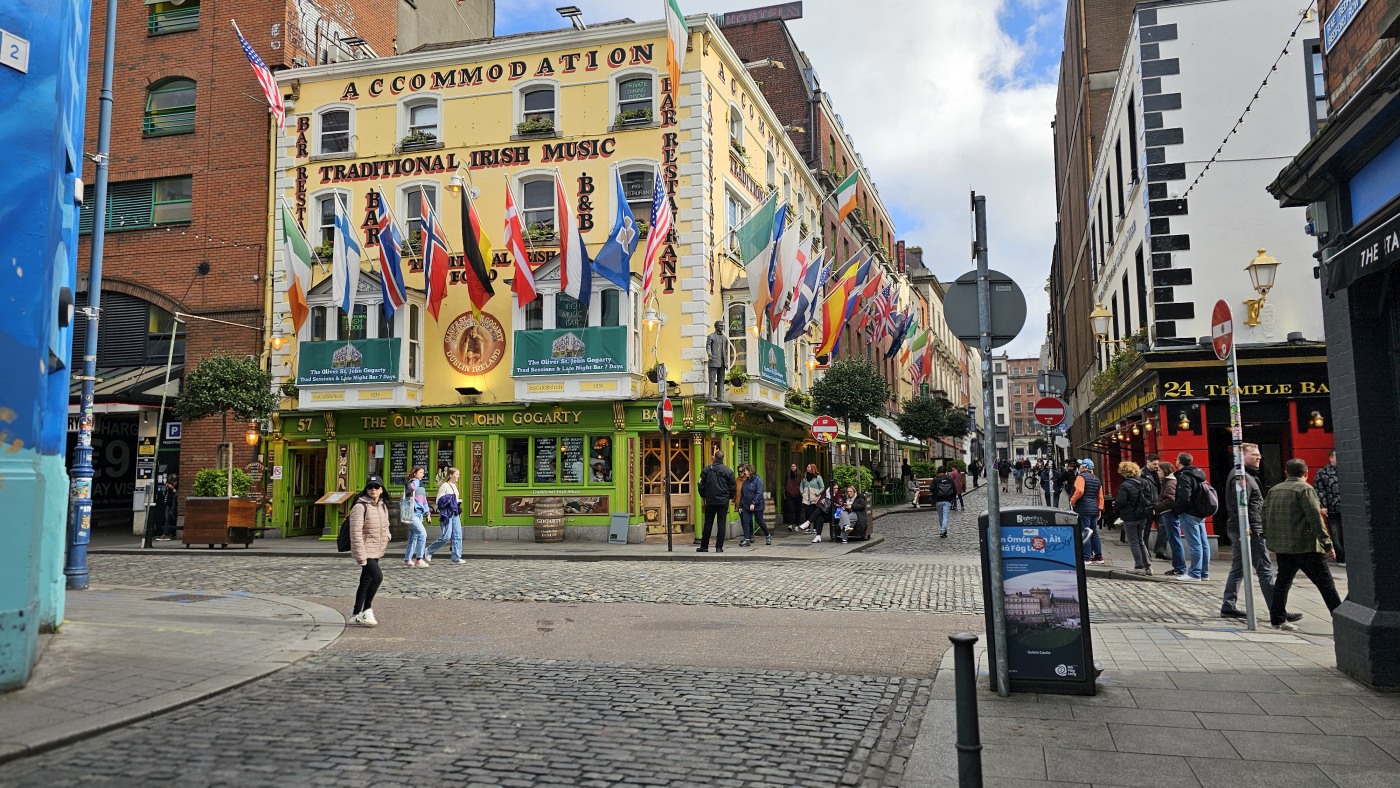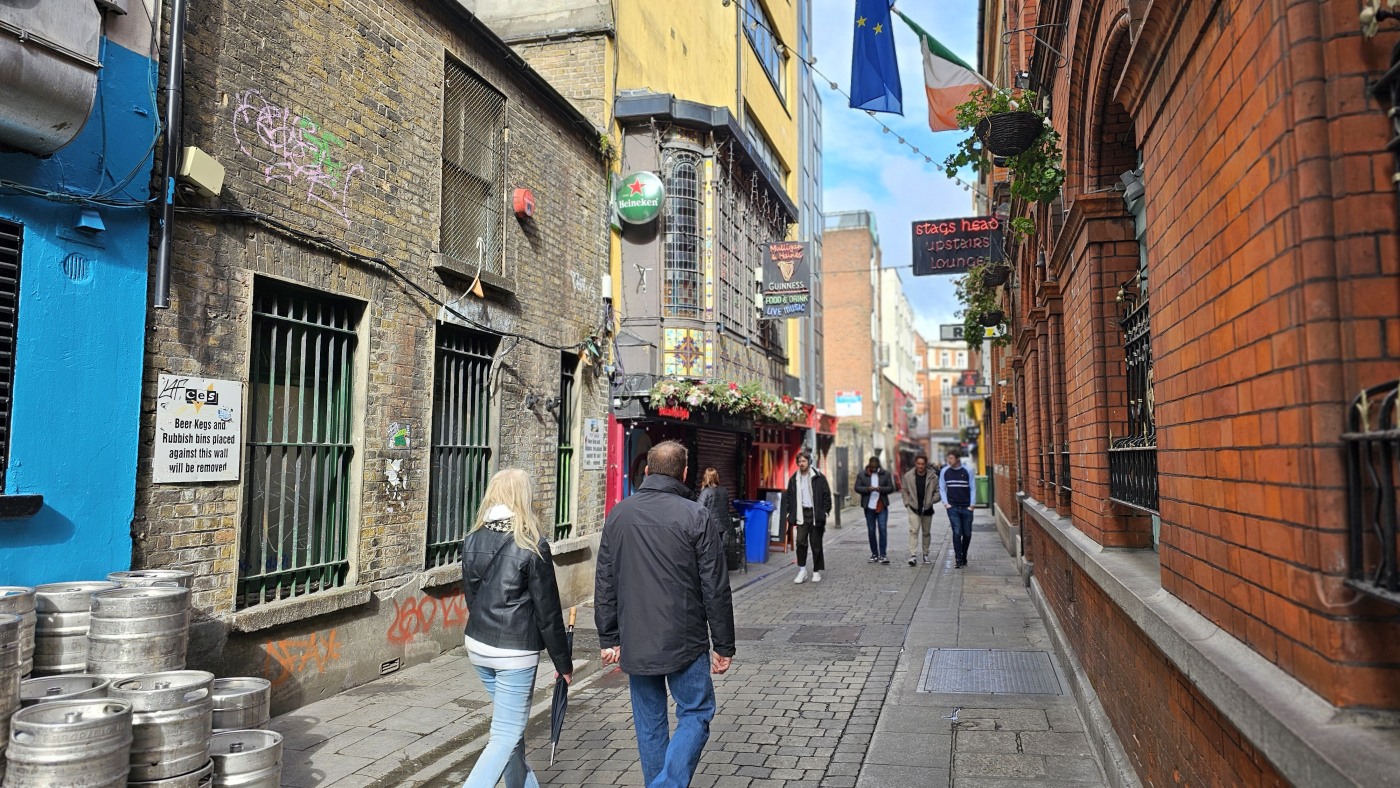 Ganz Tempel Bar ist so charmant, dass alle Touristen magisch davon angezogen werden. Hier reiht sich ein Pub an den nächsten, Musik an jeder Ecke. Die gute Stimmung wird nicht einmal durch Regenschauer getrübt und morbide Details erscheinen nicht hässlich, sie wirken charakterstark.