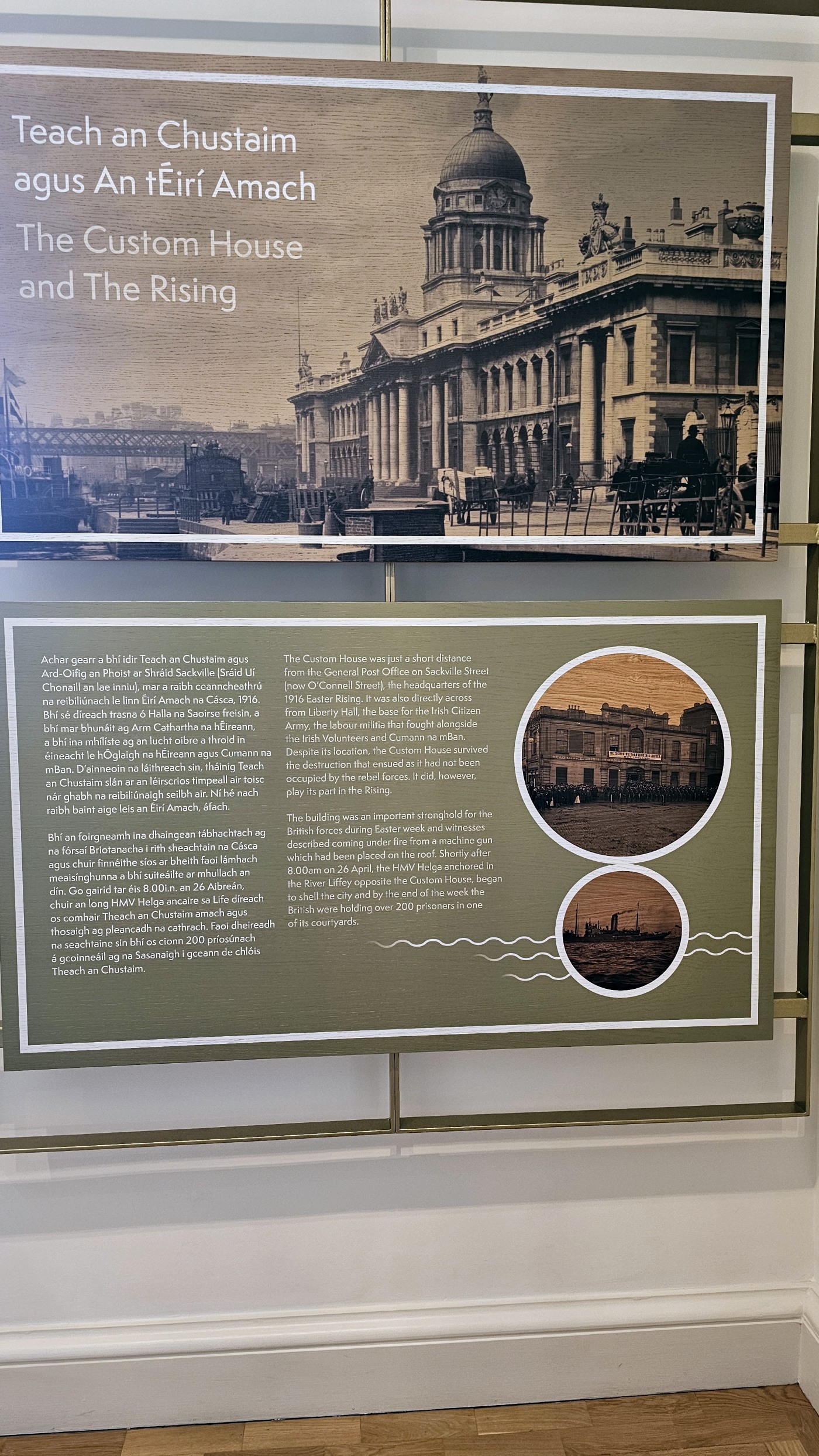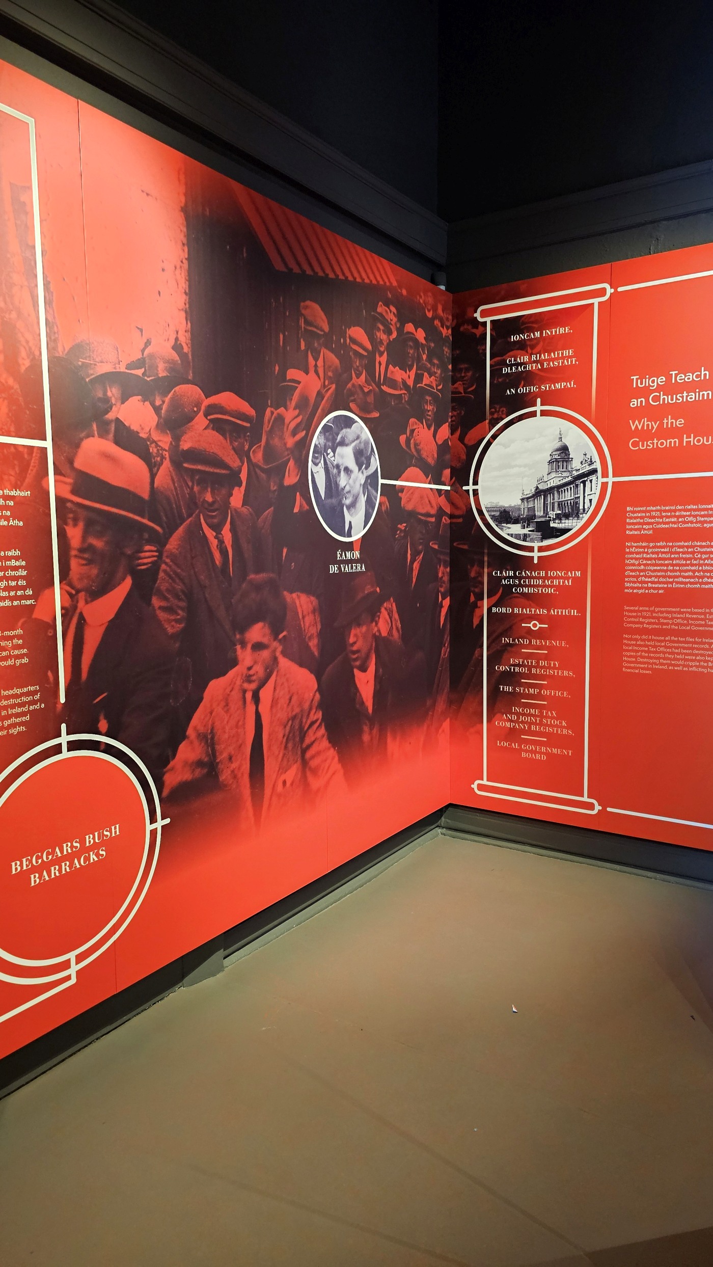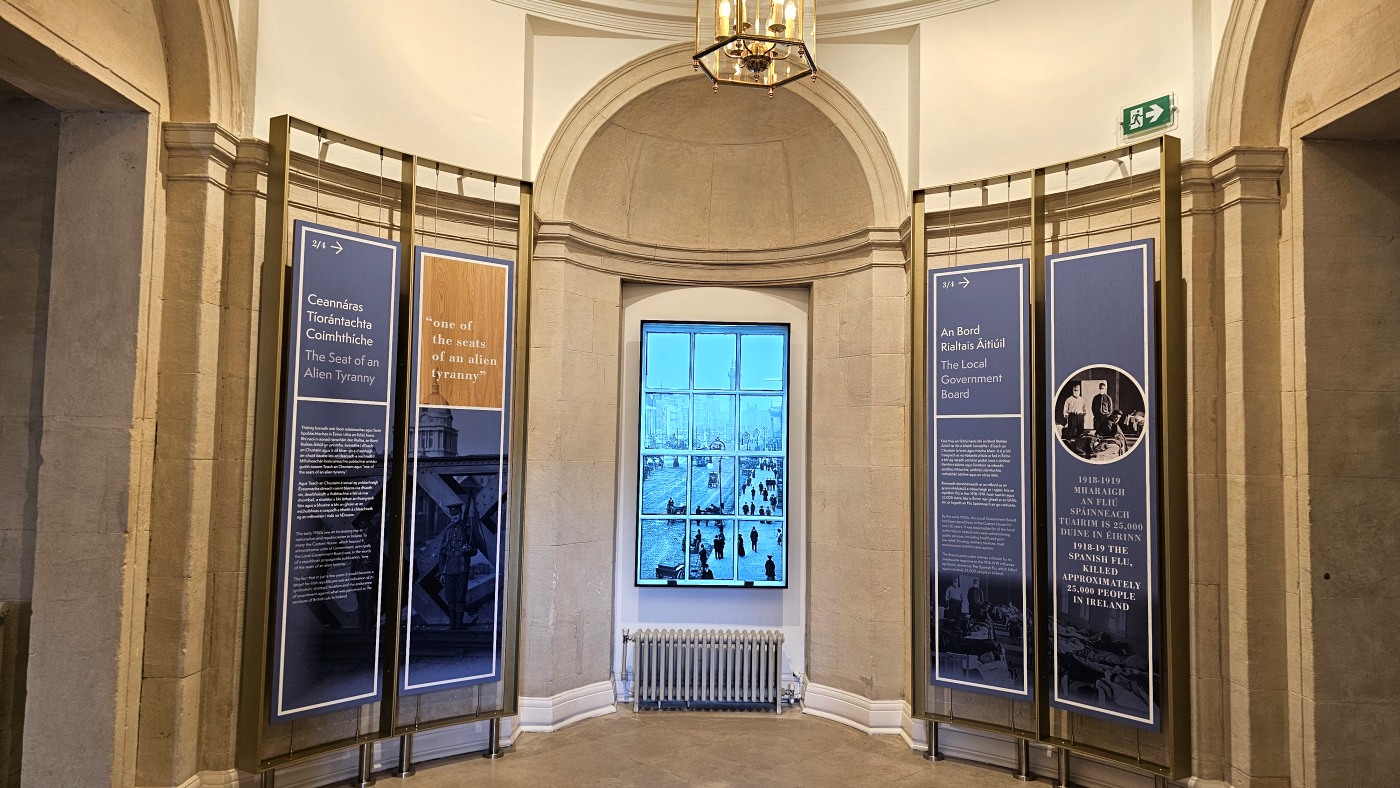 Das Gebäude wurde 1781/91 gebaut und diente viele Jahre als Zollamt, brannte 1921 nieder, wurde wieder aufgebaut und in den 1980er Jahren restauriert. Als Besucher erfahren wir etwas über die Architektur und Geschichte des Gebäudes am Hafen - dem Knotenpunkt des Handels und der Verwaltung. Alles ist sehr eng mit der Geschichte Irlands verknüpft, die hier sehr interessant und anschaulich dargestellt wird: Eine für den Großteil der Bevölkerung meist harte Zeit unter britischer Herrschaft, Osteraufstand 1916, 1919 Ausruf einer Republik, 1922 eine provisorische Regierung - ohne den Nordosten, dafür mit anschließenden Spannungen. Erst 1949 schied Irland nach drei Jahrhunderten britischer Herrschaft aus dem Commonwealth of Nations aus. Und erst 1998 machte das s.g. Karfreitagsabkommen den Spannungen zwischen Irland und Nordirland ein Ende.