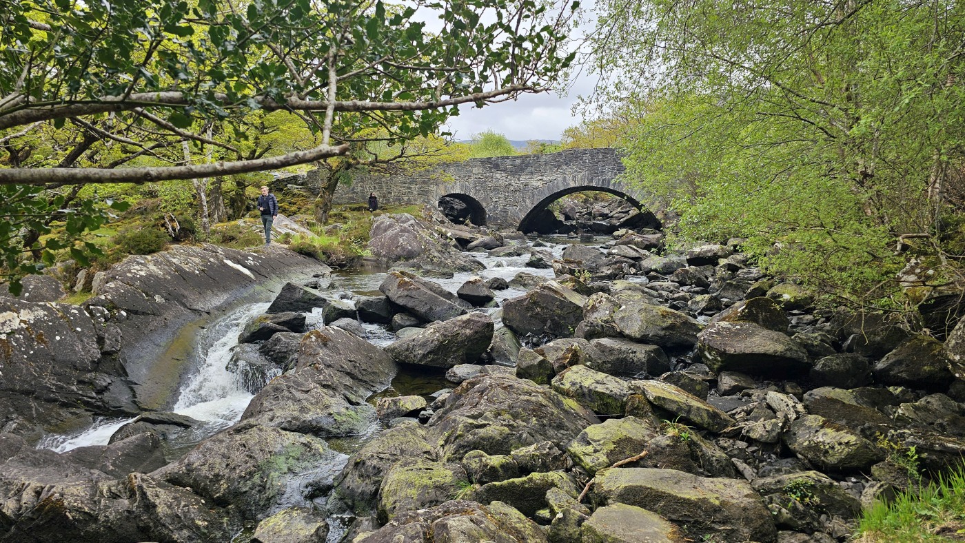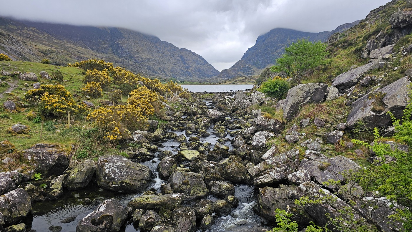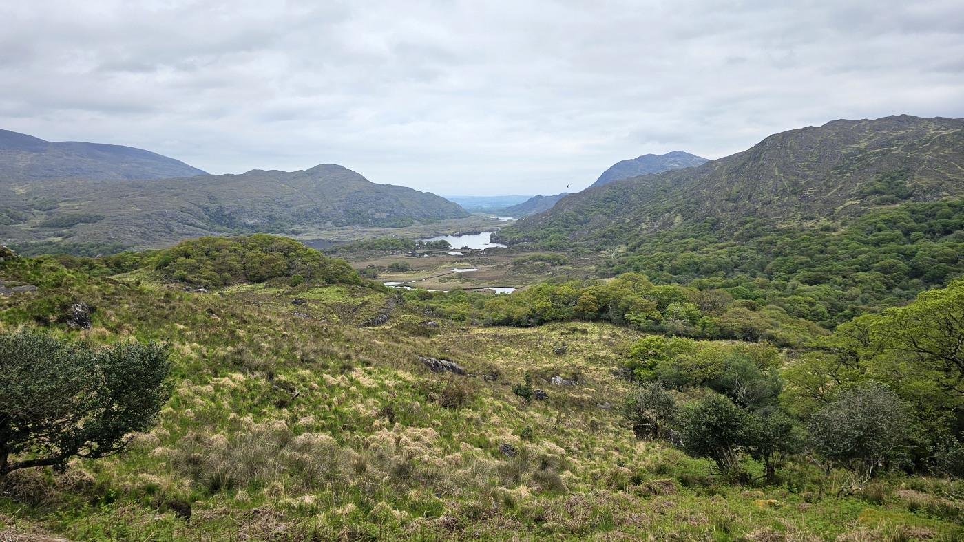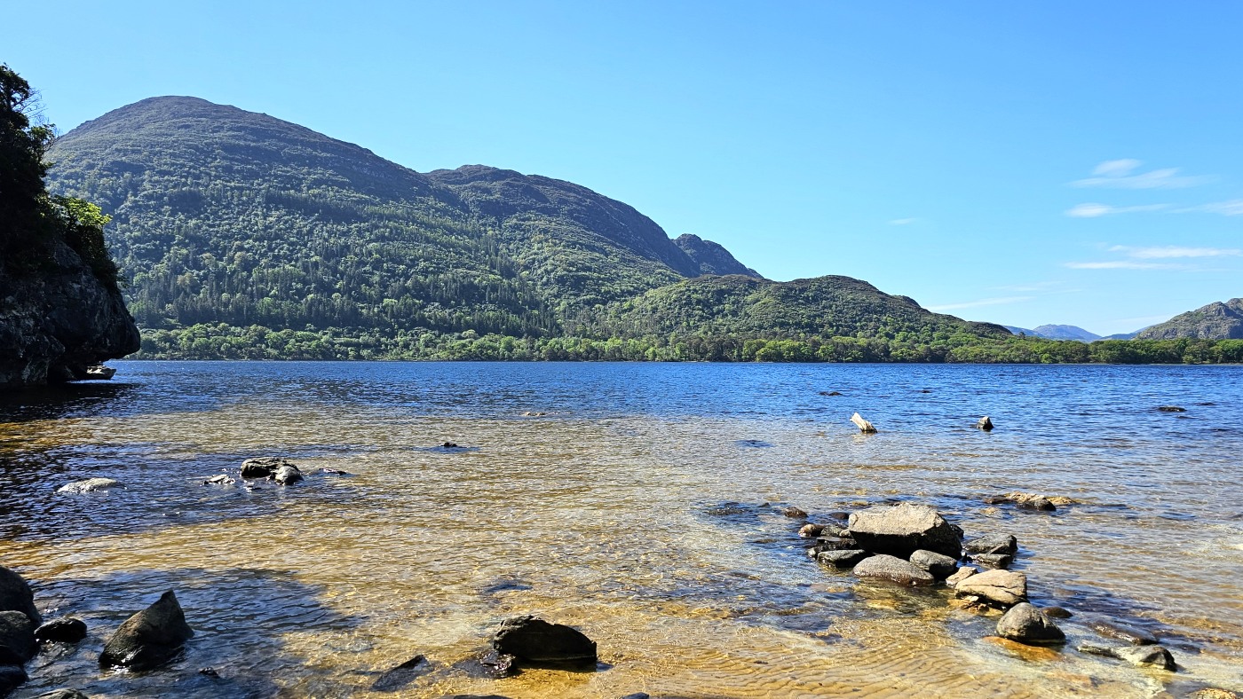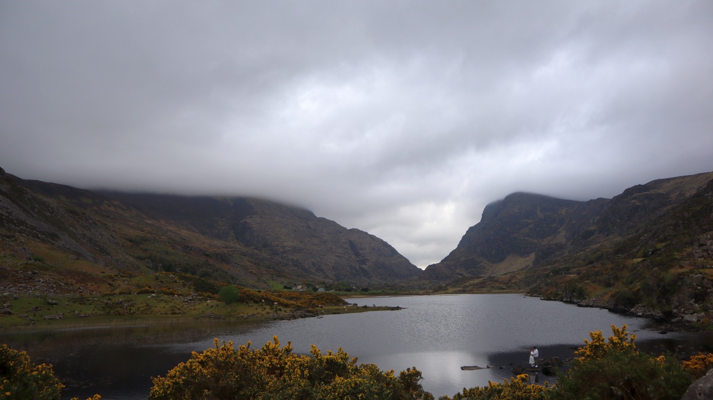 Ein Tipp von Ellie ist der Aussichtspunkt Gap of Dunloe, Startpunkt für mehrere Wanderrouten. Wir treffen dort auf dem Weg zu einem See einen Iren in Begleitung einer Polin, erhalten noch mehr gute Tipps und fotografieren die eindrucksvolle Landschaft, zuletzt mit einem Brautpaar in weiter Ferne, die als kleine weiße Punkte am Seeufer aus der Landschaft herausleuchten.