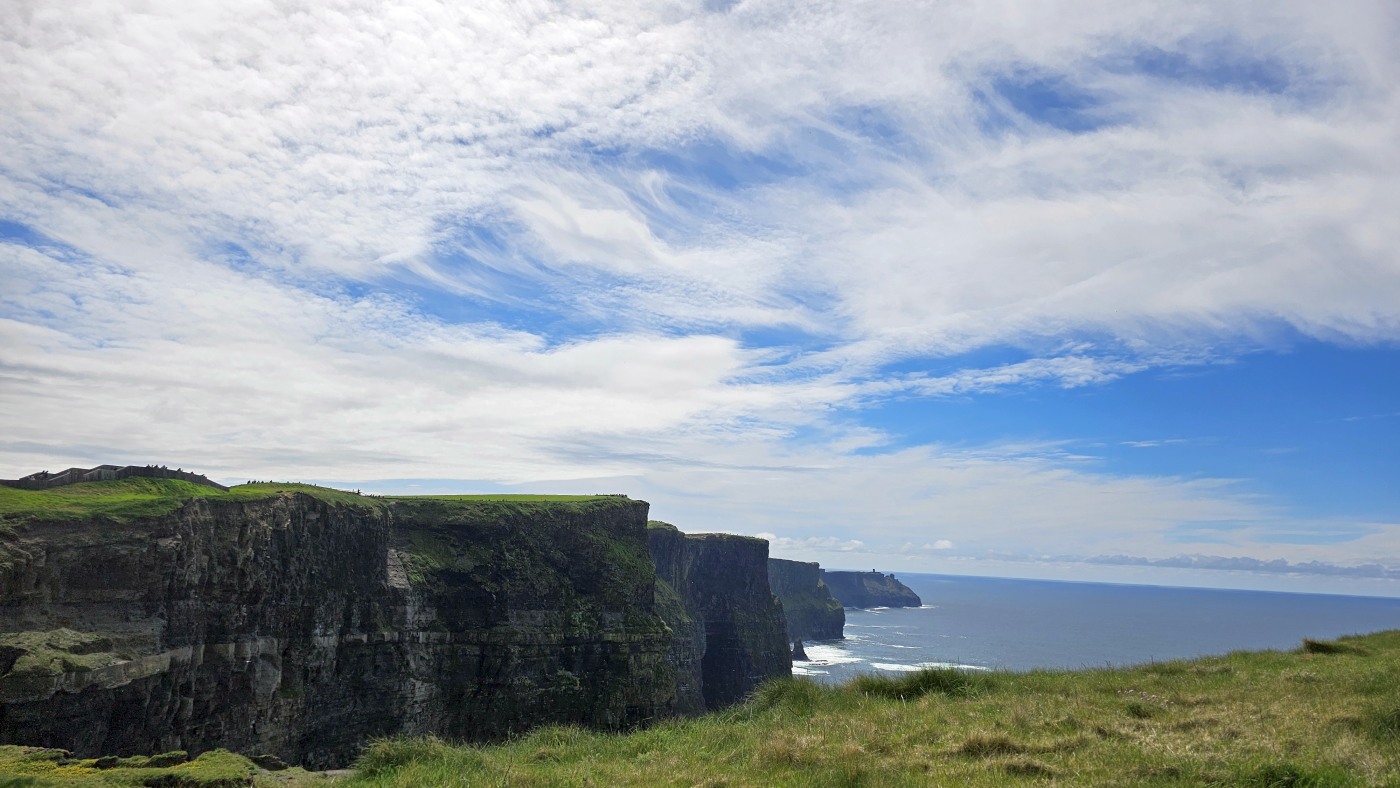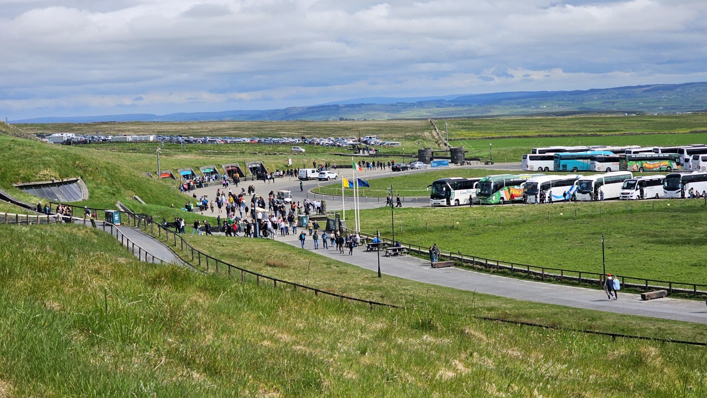 Waren es noch zwei oder drei Kilometer bis zum Ziel? Ich weiß es nicht mehr. Ich sah in der Ferne einen riesigen Fleck, der aus unzähligen Autos zu bestehen schien, vermutete ein Festival oder ähnliches und fragte: "Um Gottes Willen, was ist das denn? Der realistische Fritz grinste und antwortete: Cliffs of Moher und er hatte Recht.