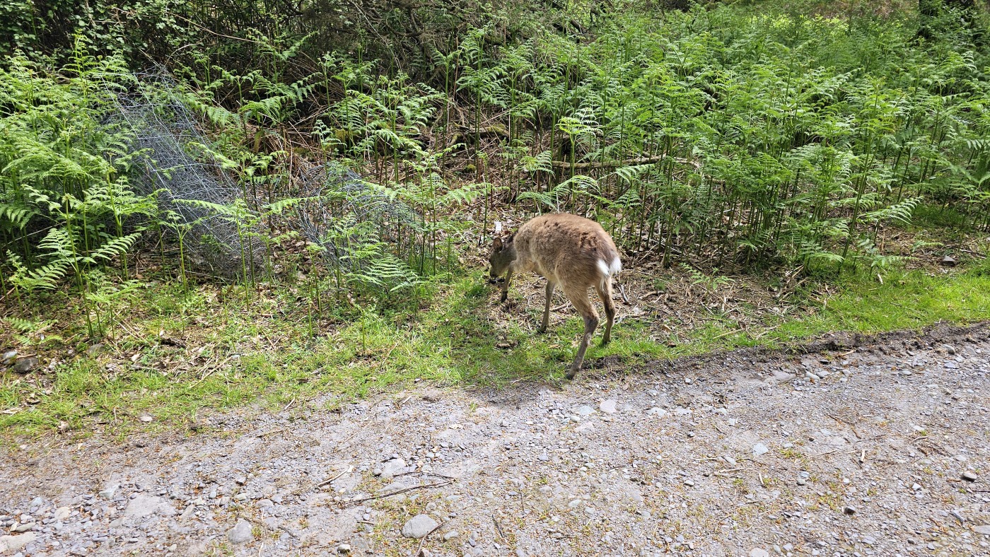 Zum Ende der Wanderung erleben wir nochmals eine sehr ungewöhnliche Begegnung mit einem jungen Reh. Zuerst stand es in der Ferne am Wegrand, dann konnten wir bis auf eineinhalb Meter herangehen, ohne dass es weglief und anschließend ging es sogar mit mir zusammen weiter den Weg hinunter.