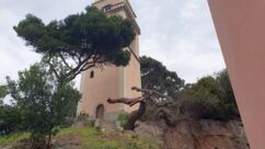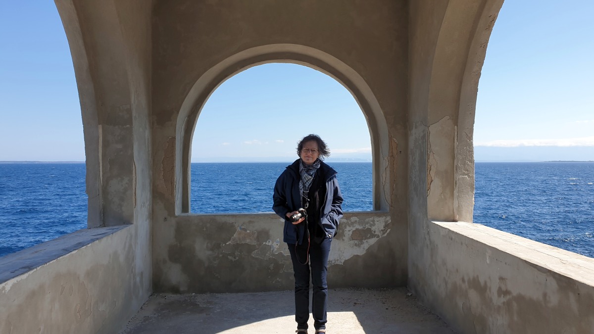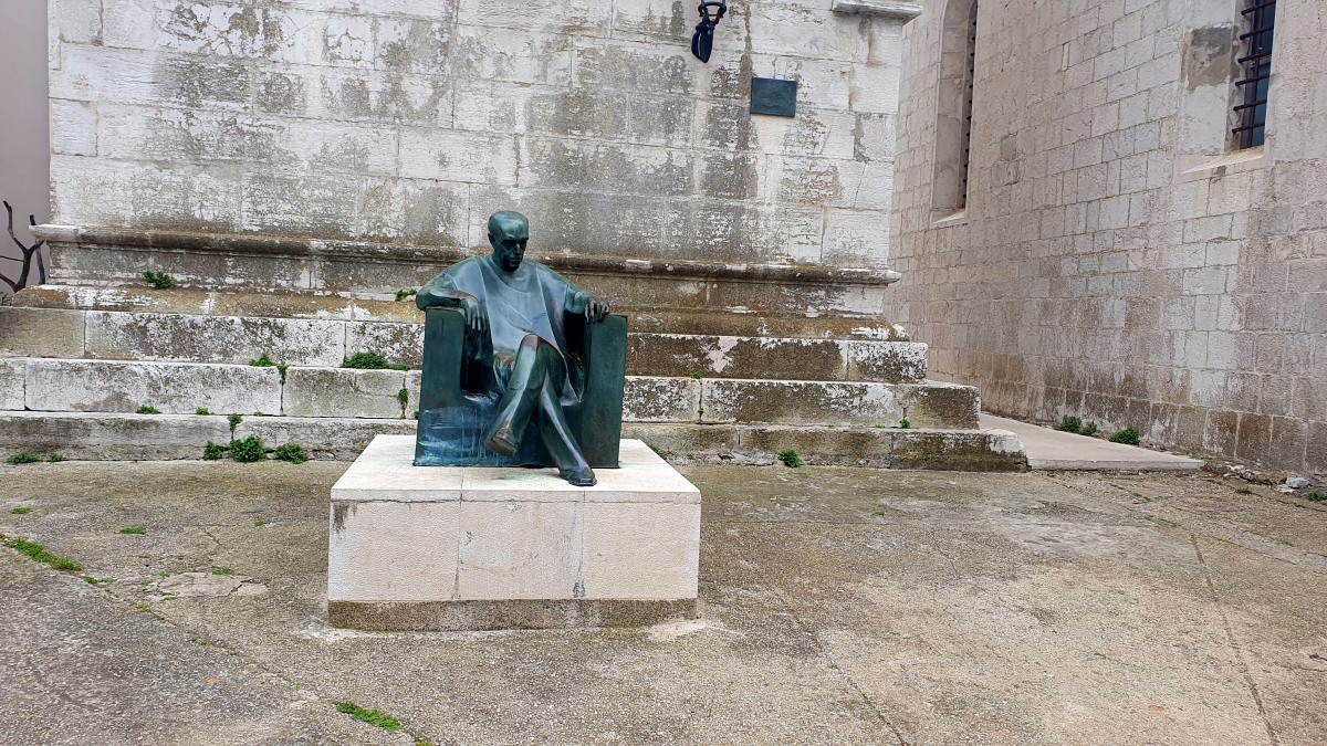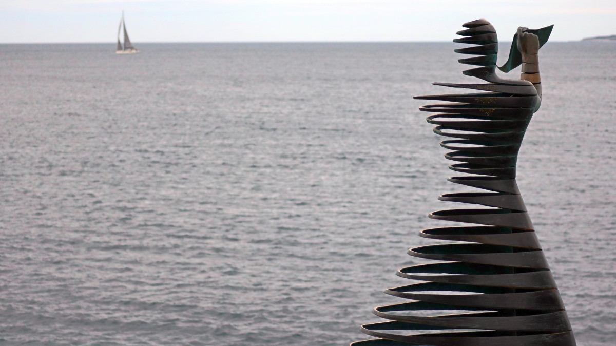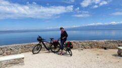 Heute waren zumindest die Wolken verschwunden, so dass wir den ganzen Tag mit dem Rad unterwegs sein konnten. Der starke Wind hat auf Ost gedreht, Mali Lošinj und Halbinsel Cikat waren also recht ruhig zu befahren. Wir fahren durch Pinienwälder, vorbei an einem großen Campingplatz, einer sehr beeindruckenden Skulptur, einfachen Strandbistros und Luxusvillen.
