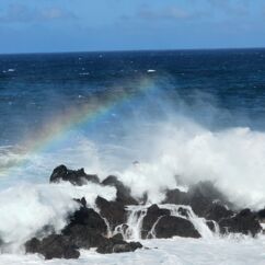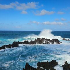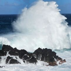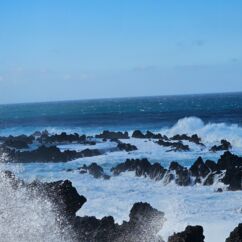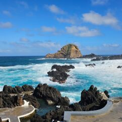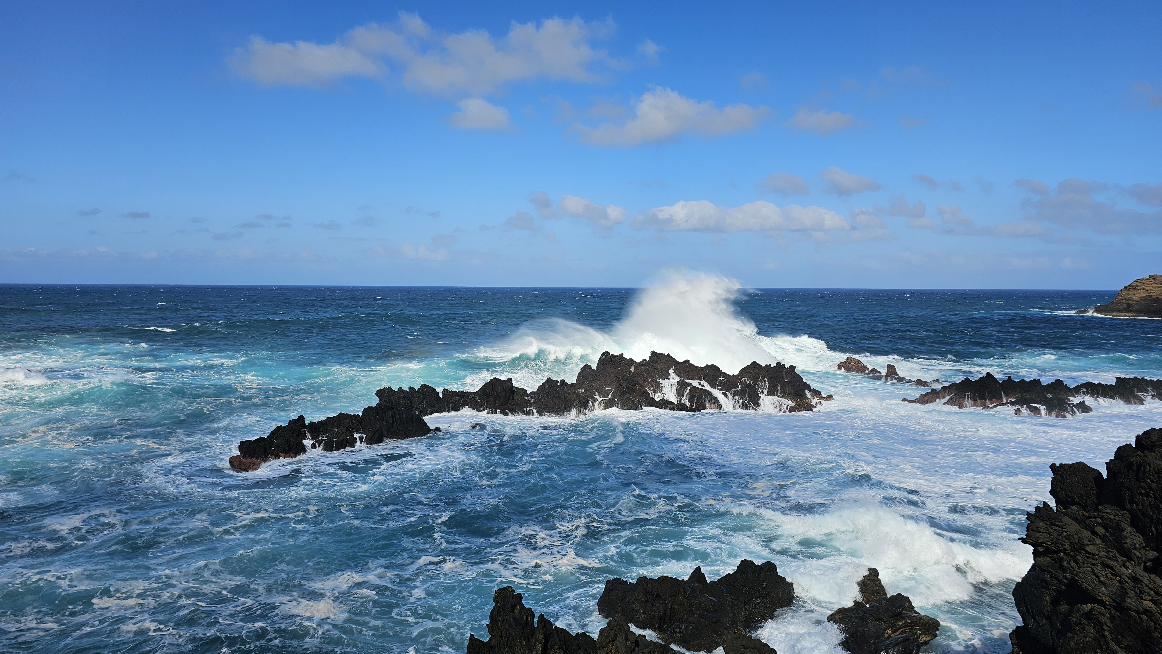 Und dann kommt Porto Moniz! Ein Highlight mit Felsformationen vor der Küste, Badebecken, die mit Meerwasser überflutet werden und tosenden Wellen, die beim Zurückfluten aufeinandertreffen und phantastische Wasser- und Gischtfontänen zaubern. Es fällt uns schwer, den Blick davon zu lösen.