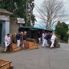 Anschließend schauen wir uns noch die traditionionellen Korbschlittenfahrten an. Was Mitte des 19ten Jahrhunderts als schnelles Transportmittel eingeführt wurde, ist heute ein heftiger Touri-Rummel. Zwei traditionell gekleidete Schlittenführer rasen mit Holzschlitten und zwei Touristen mit bis zu 48 km/h zwei Kilometer die Straßen abwärts. Allein die Gummisohlen ihrer Stiefel sind die Bremsen. Ich finde, die Schlittenführer schauen alles andere als glücklich aus.