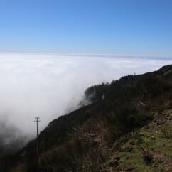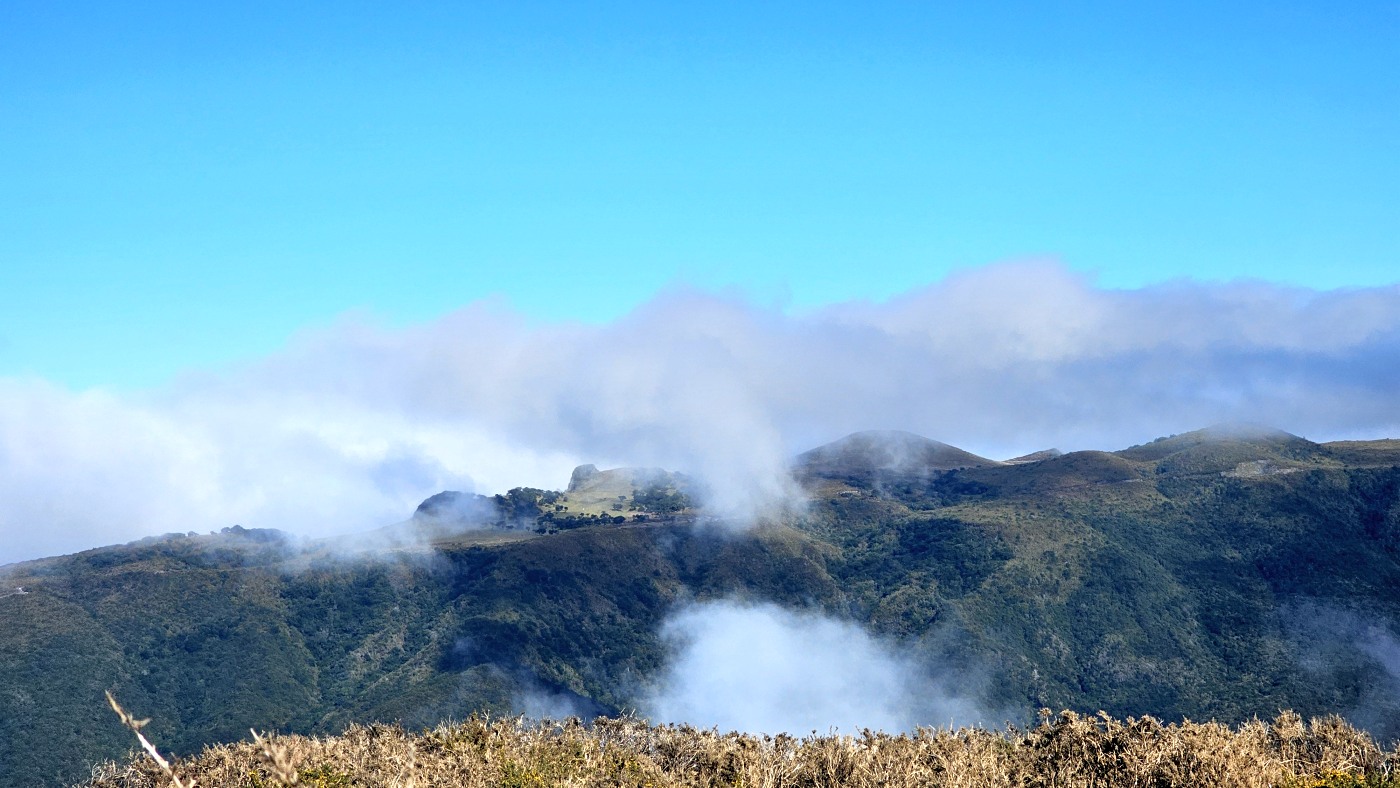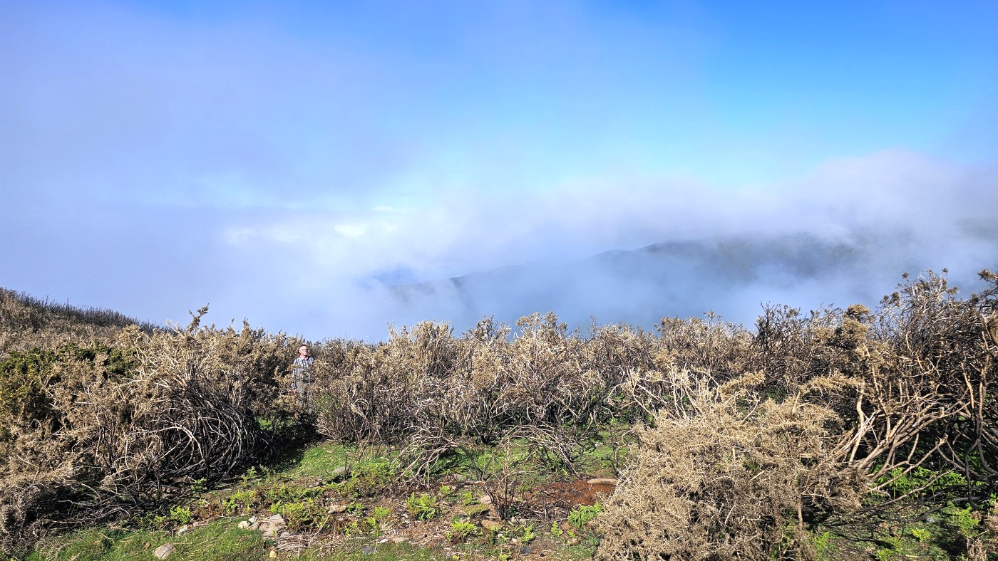 Der Rückweg führt über die Berge, die Wolken sind wieder unter uns und auf dem Weg nach unten fahren wir durch sie hindurch.