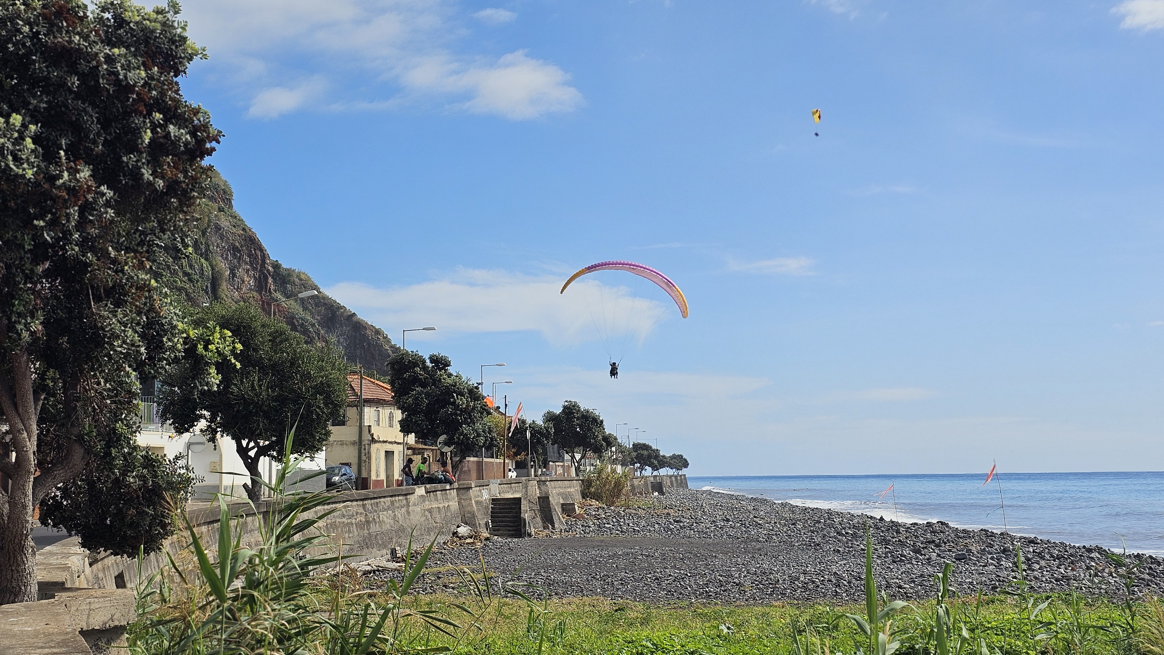 Über uns kreisen Paraglider, die ihre Passagiere sehr gezielt am sehr kleinen Landeplatz am Strand wieder zu Boden bringen.