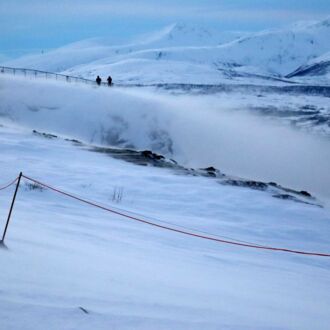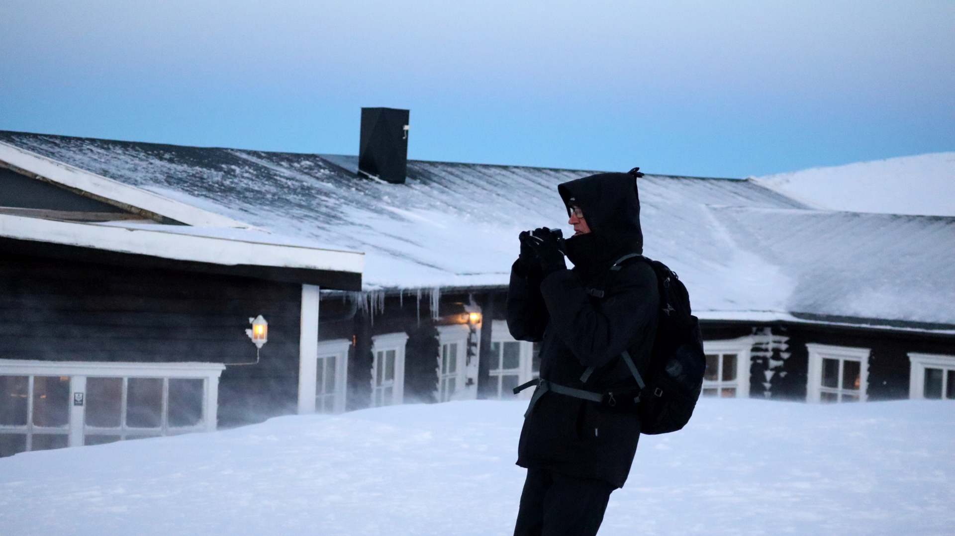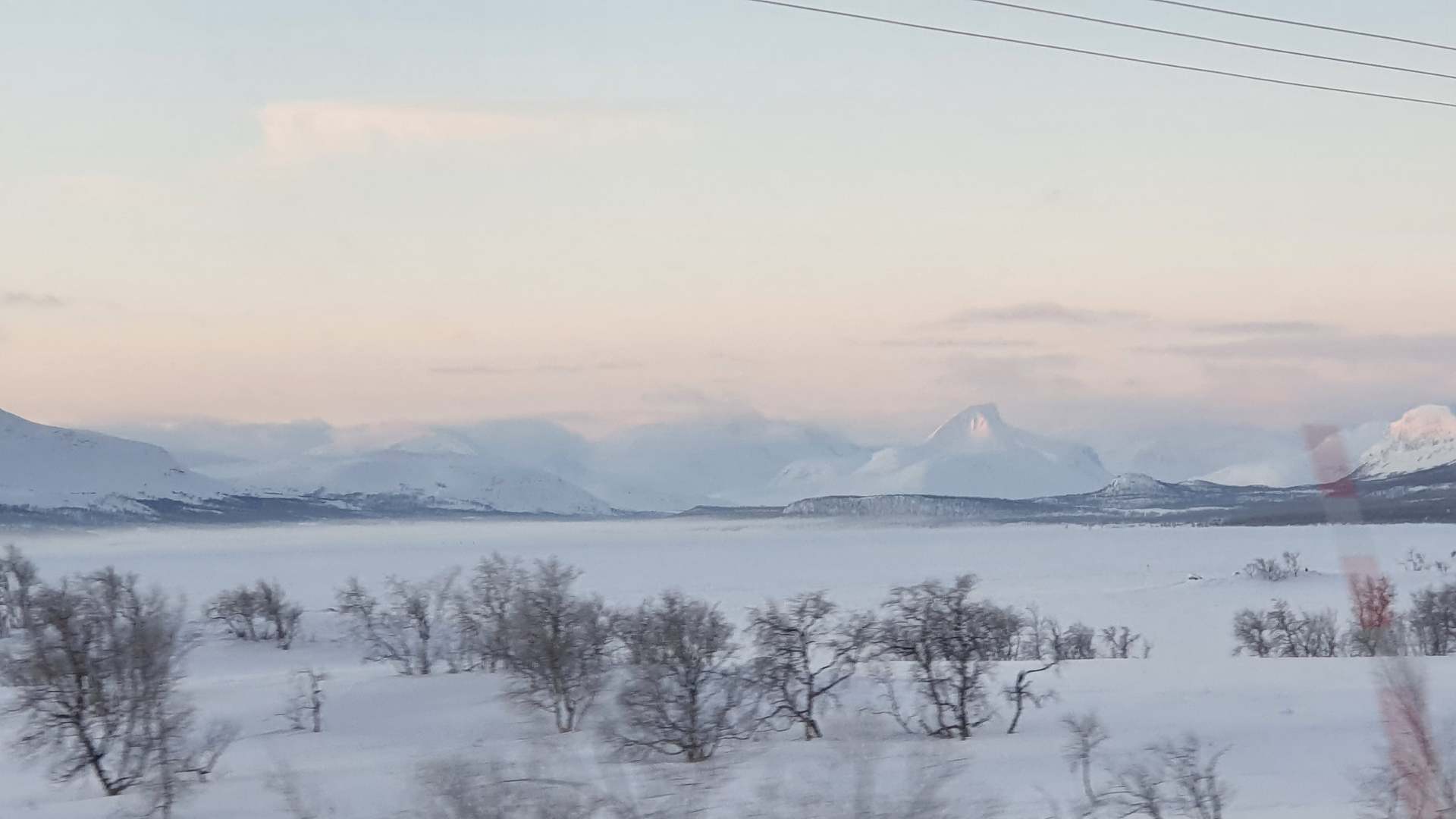 Die Sonne zaubert aber immer noch ihr wunderschönes pastelliges Licht über die Landschaft und so fahren wir zu Tromsøs Hausberg, dem Fjellheisen. Eine Gondelbahn fährt zur Fjellheisen-Station, insgesamt 420 Meter hoch über dem Meeresspiegel. Während im Tal Windstille herrscht, tobt dort oben ein eisiger Sturm. Lange halten wir den ins Gesicht peitschenden Eispartikeln nicht stand.