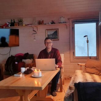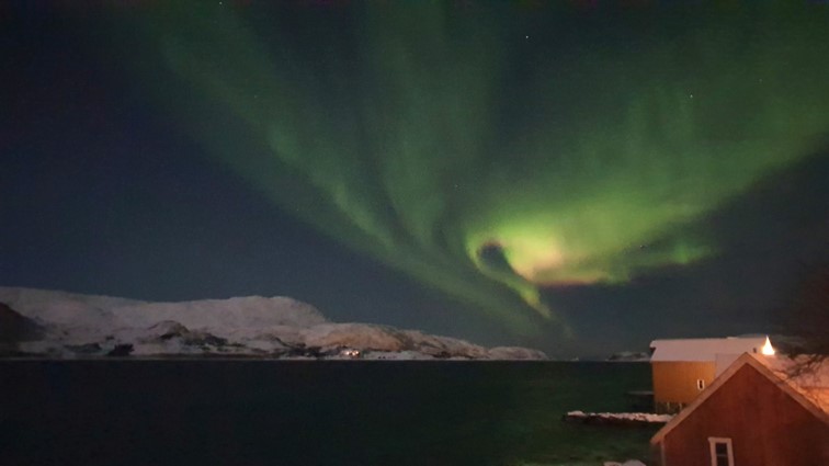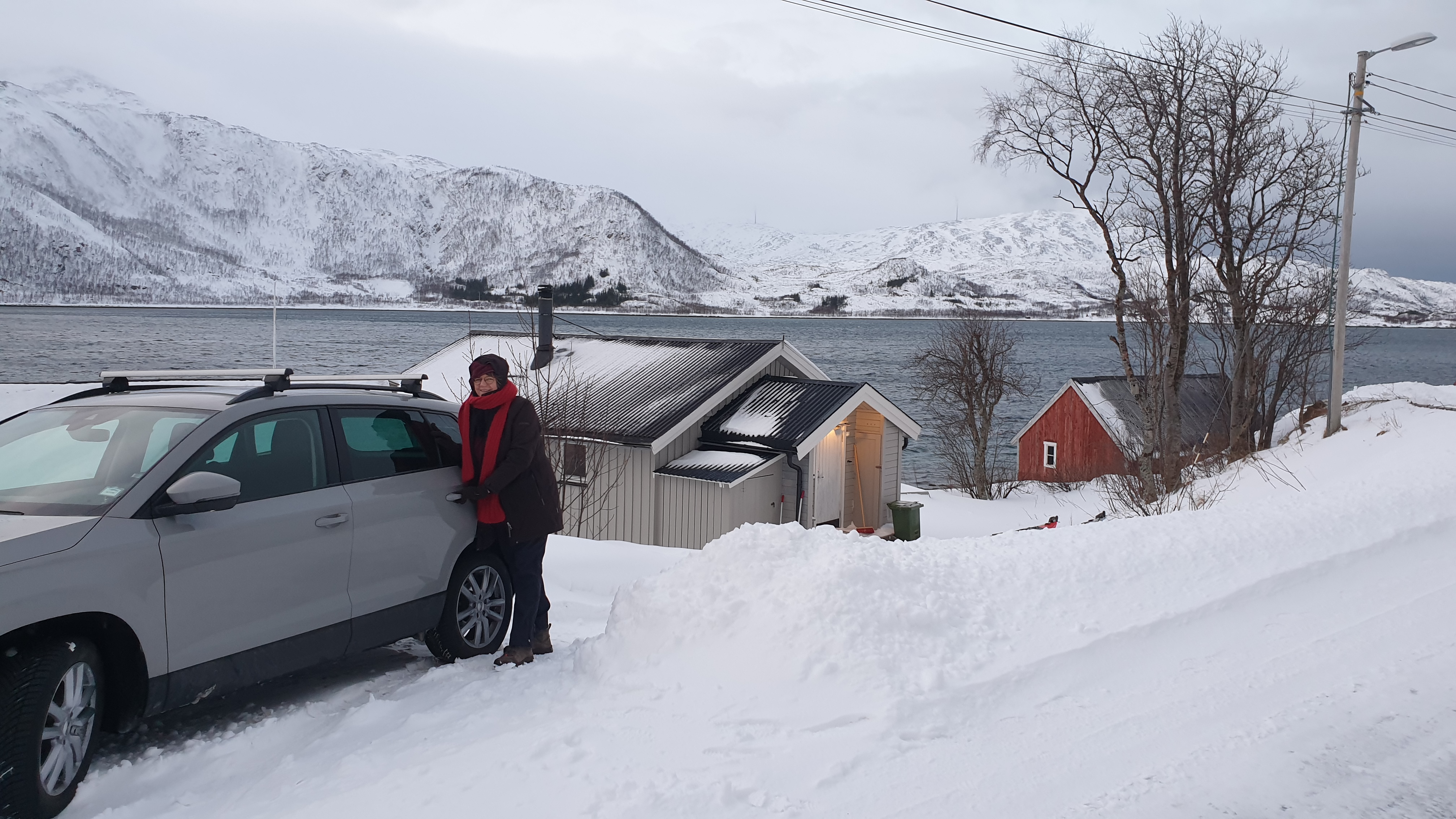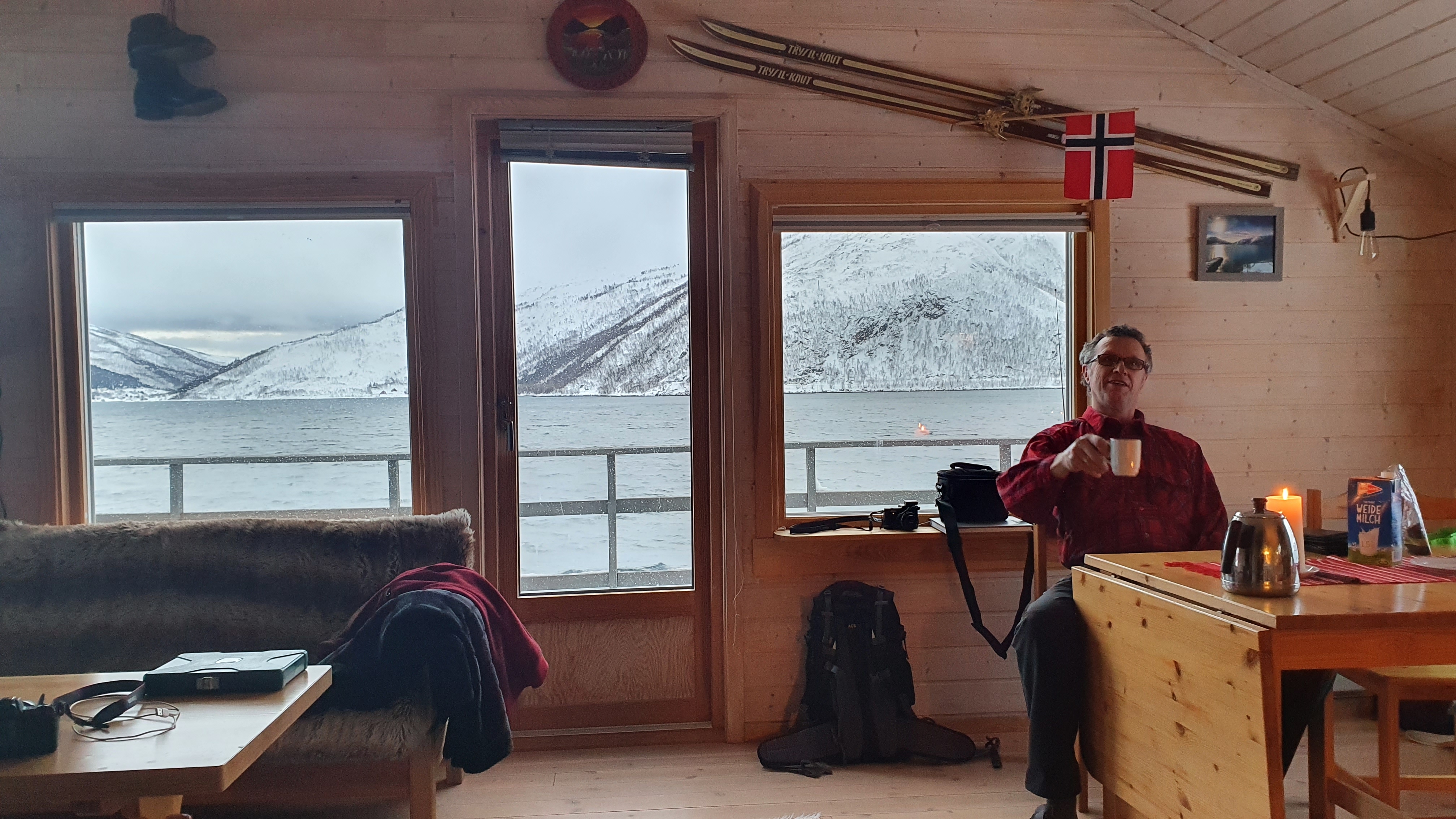 Die Rücktour im Bus zieht sich leider sehr in die Länge. Durch eine gesperrte Straße muss die Route geändert werden und wir sind erst um 19.30 Uhr wieder in Tromsø. Unsere anschließende Autofahrt zur Hütte ist abenteuerlich: Heftige Sturmböen, peitschender Schneeregen, halb aufgetaute Eisfelder auf der Fahrbahn, teils tiefe Wasserfurten in den Fahrbahnsenken. Auf der Brücke über den Fjord, der Tromsø teilt, wird bei Windstärke 10 ein Auto mit Anhänger auf unsere Gegenfahrbahn gedrückt. Kurzum: Wir sind froh, als wir unsere kuschelige Hütte mit Ofen erreichen, sammeln schnell noch den Mülleimer auf, der nun schon zum zweiten Mal in den Garten geweht wurde und begeben uns glücklich, aber todmüde in unsere kuschelige Koje.