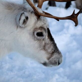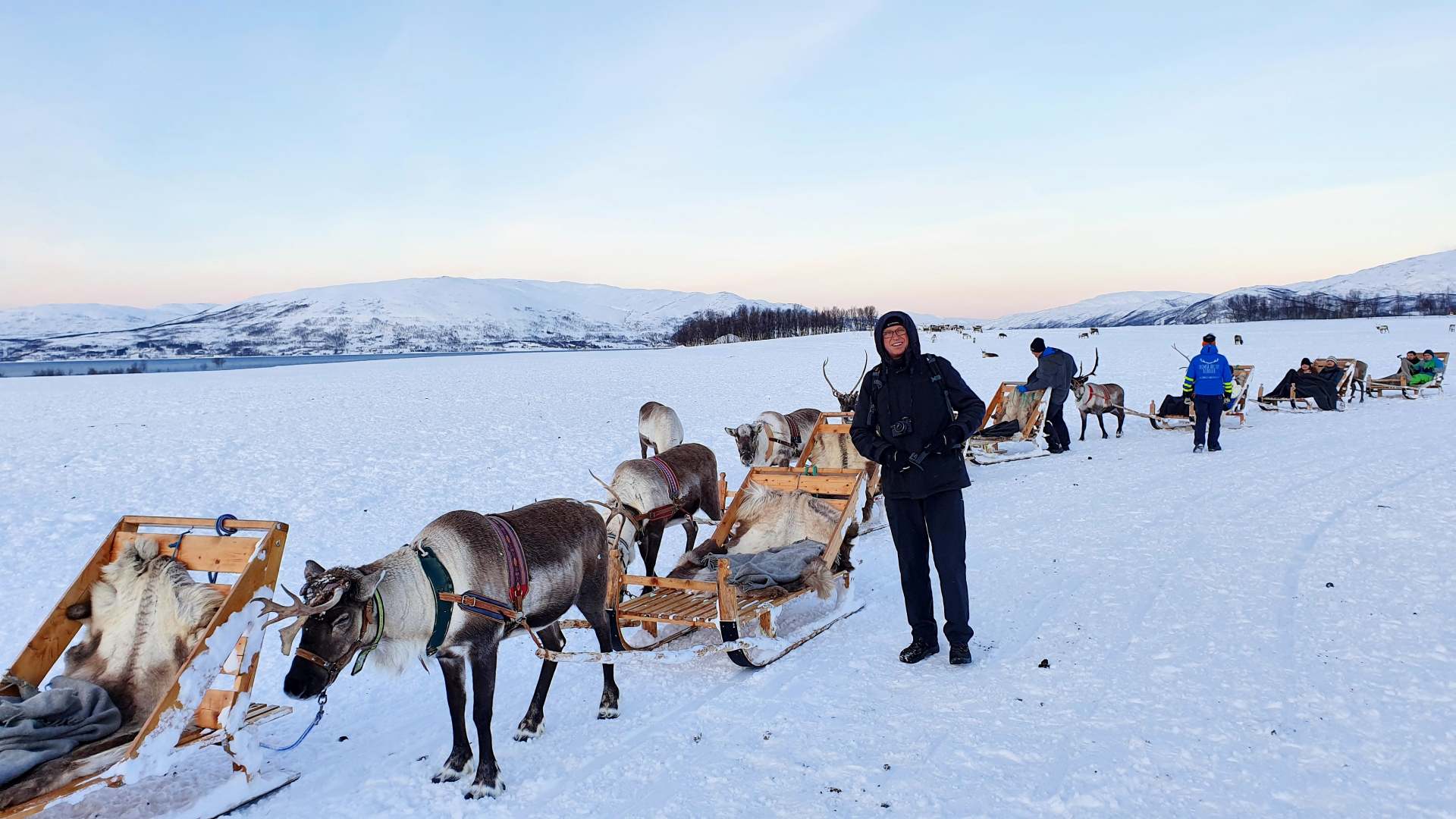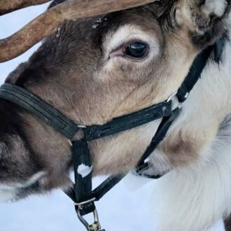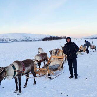 Vor unserem geistigen Auge hatten wir uns in einem Schlitten mit Rentier durch die verschneite sonnige Landschaft fahren gesehen. Die Realität im Sami-Touri-Camp sieht anders aus: Ein junger Same führt in dem eingezäunten Gelände das erste Rentier am Zaumzeug, ganz viele Schlitten nebst Zugtieren sind dahinter in einer Reihe miteinander verbunden und er geht mit der Touristenschlange hinter sich einmal um die große Koppel. Ähnlich wie Ponyreiten auf dem Jahrmarkt, nur dass die Runde viel größer ist und die schnelle Trabrunde ausfällt. Anschließend dürfen wir wie im Streichelzoo die Rentiere füttern und bekommen selbst eine traditionelle Rentier-Gulaschsuppe. Naja…