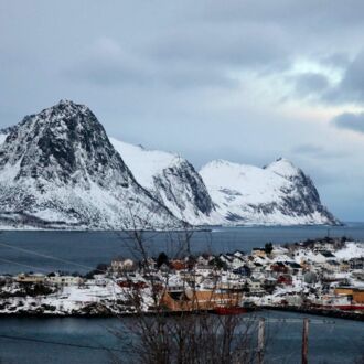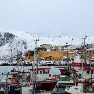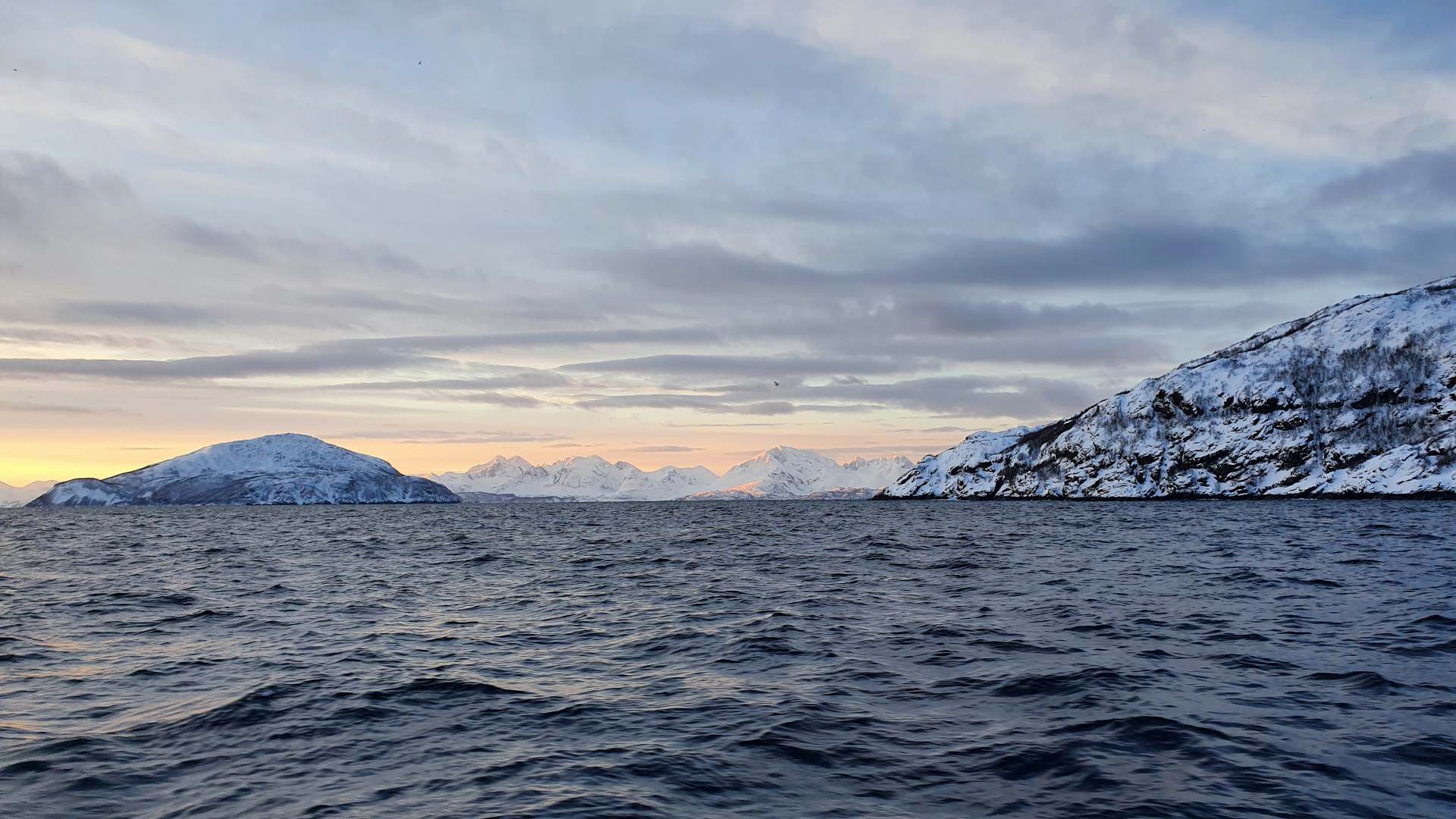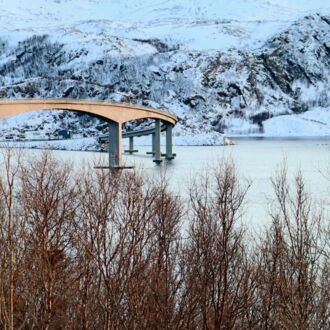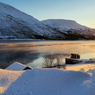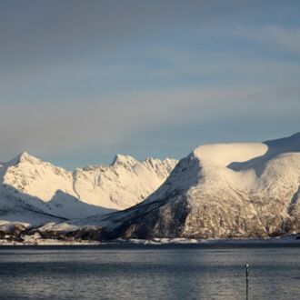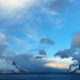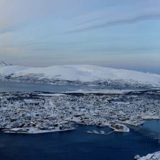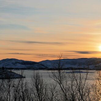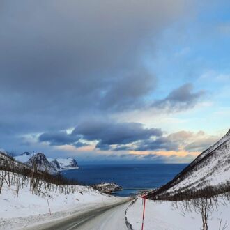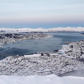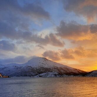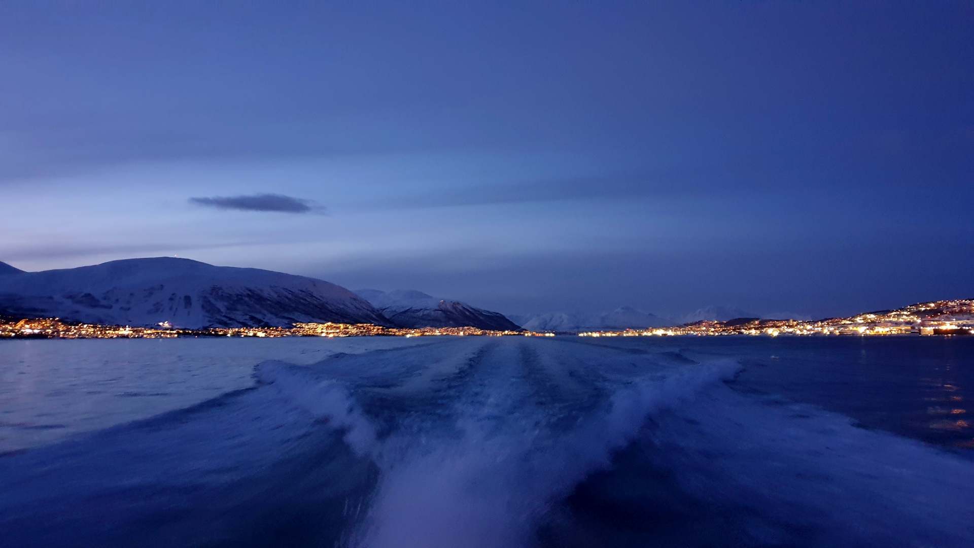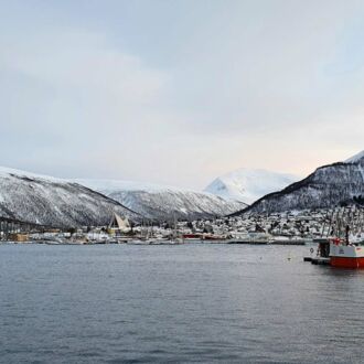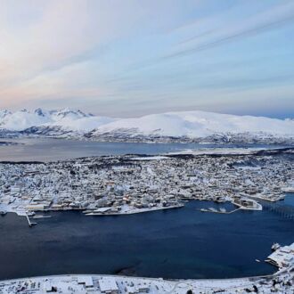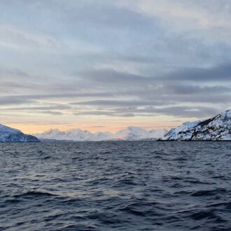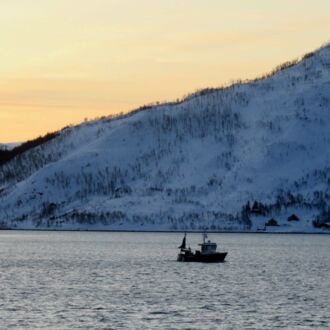 Die Farbe des Himmels wechselt gerade von Schwarz zu Blau und die Lichter Tromsøs leuchten in der Dunkelheit wie ein Schmuckstück, als wir um 8.00 Uhr Richtung Skjervøy starten.