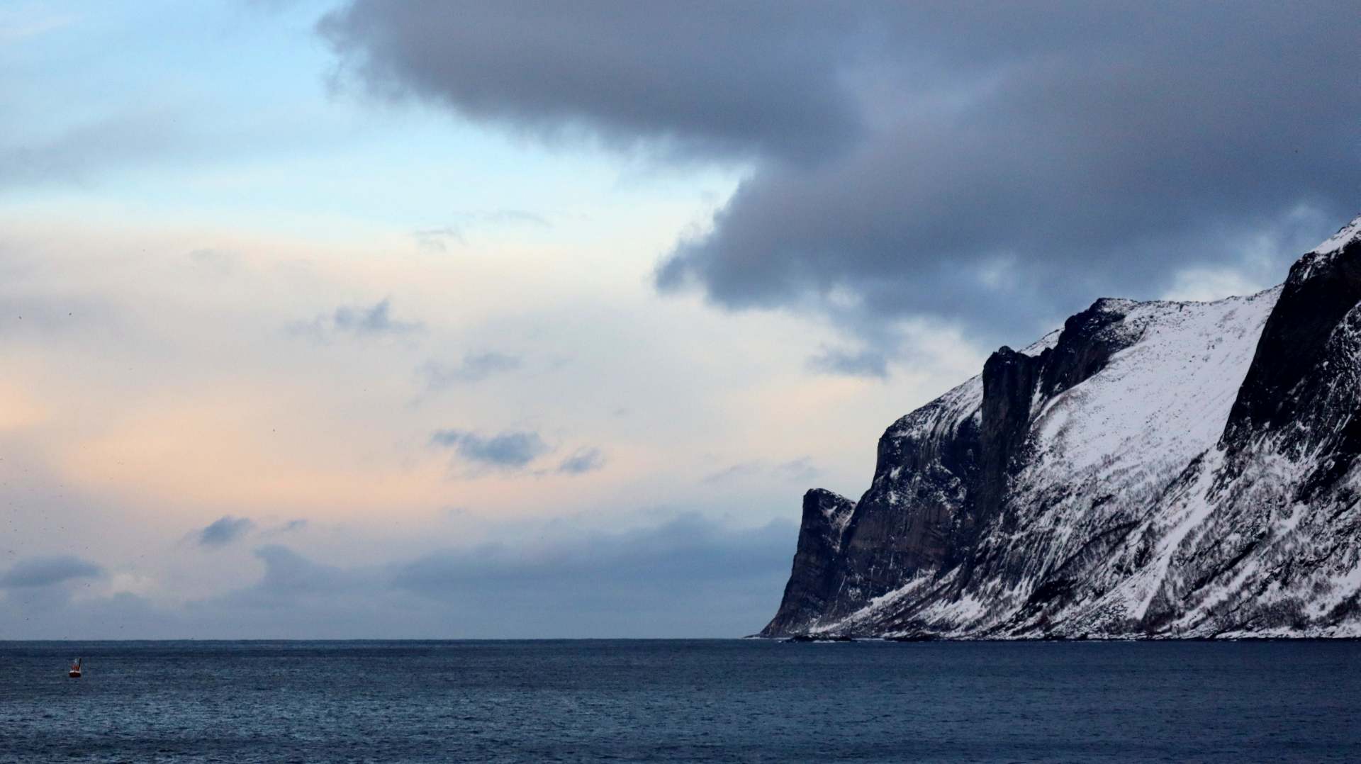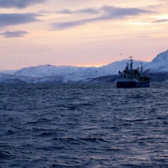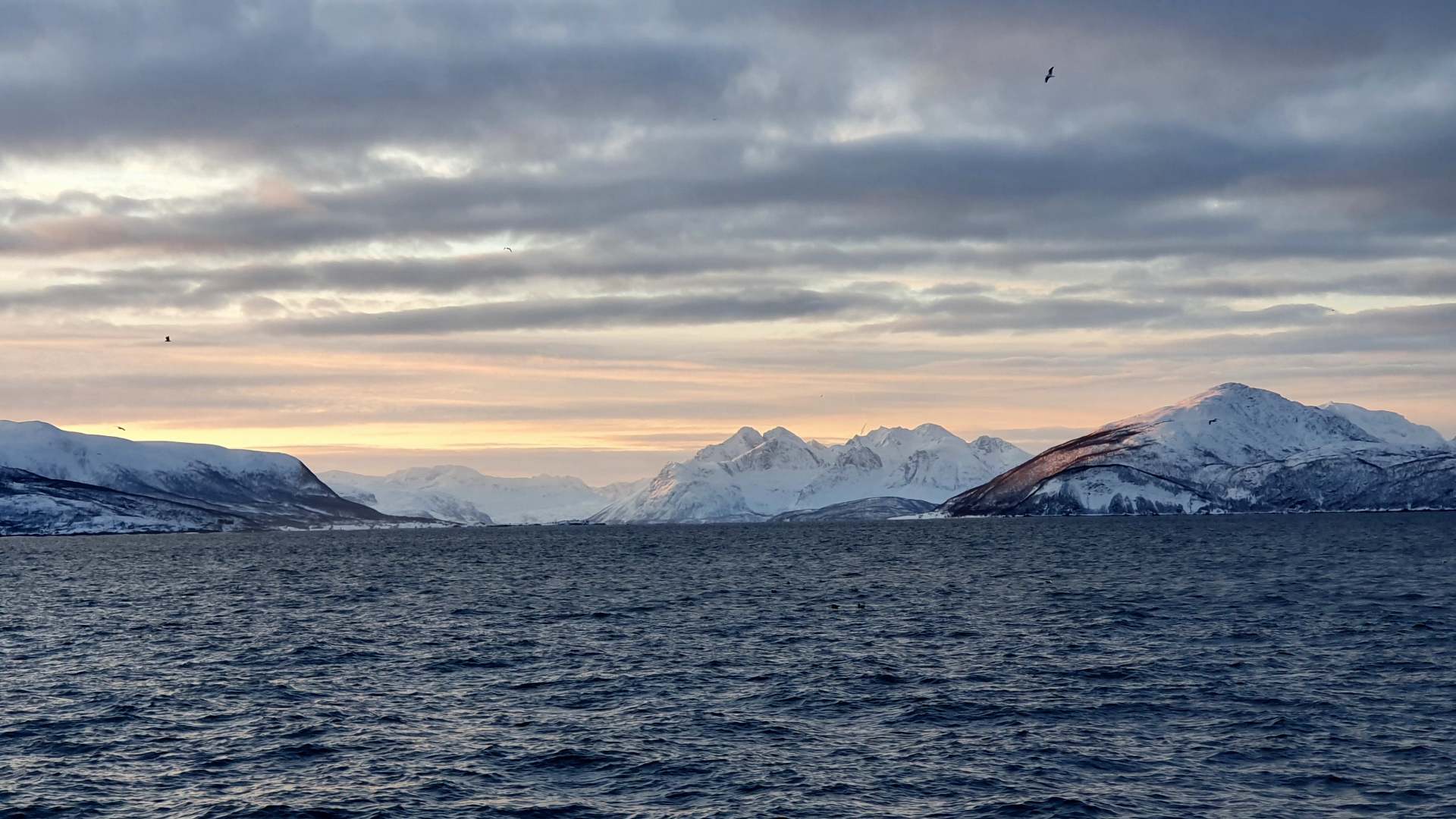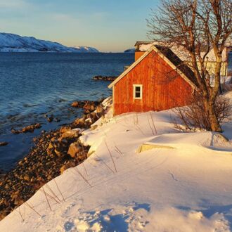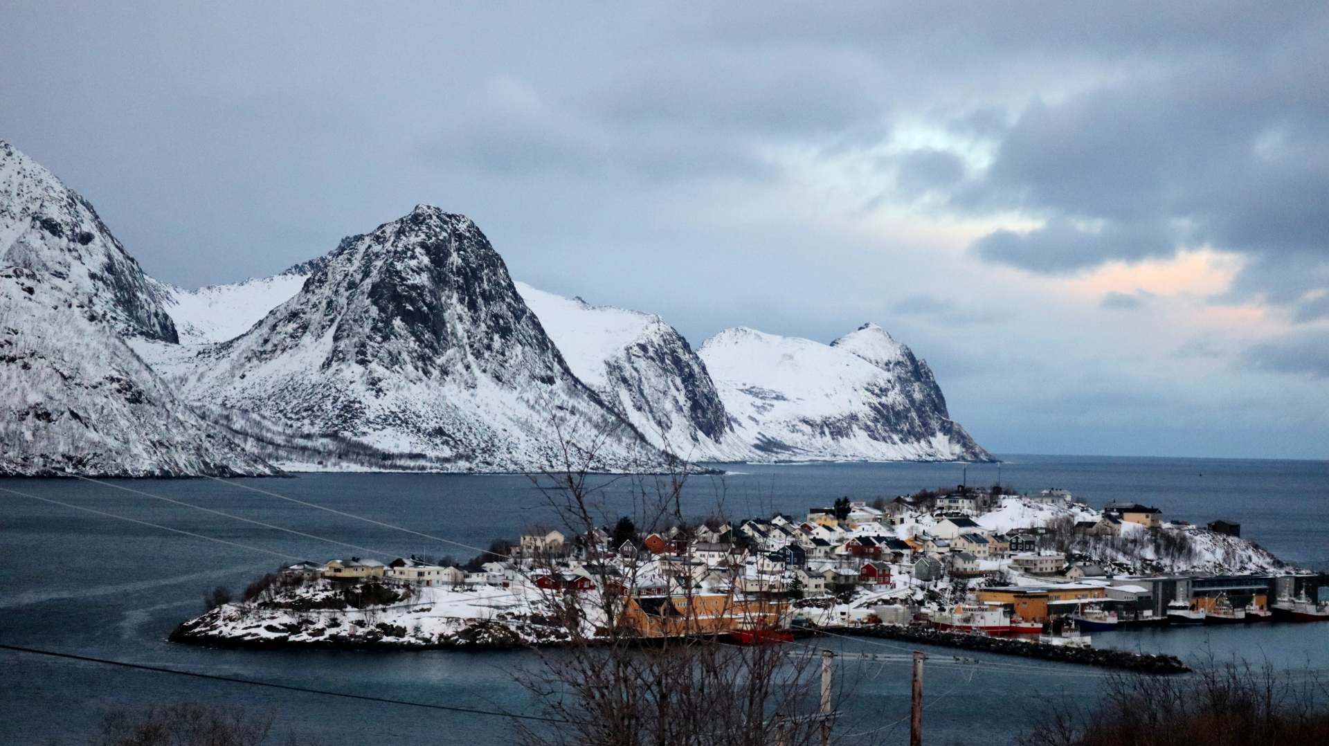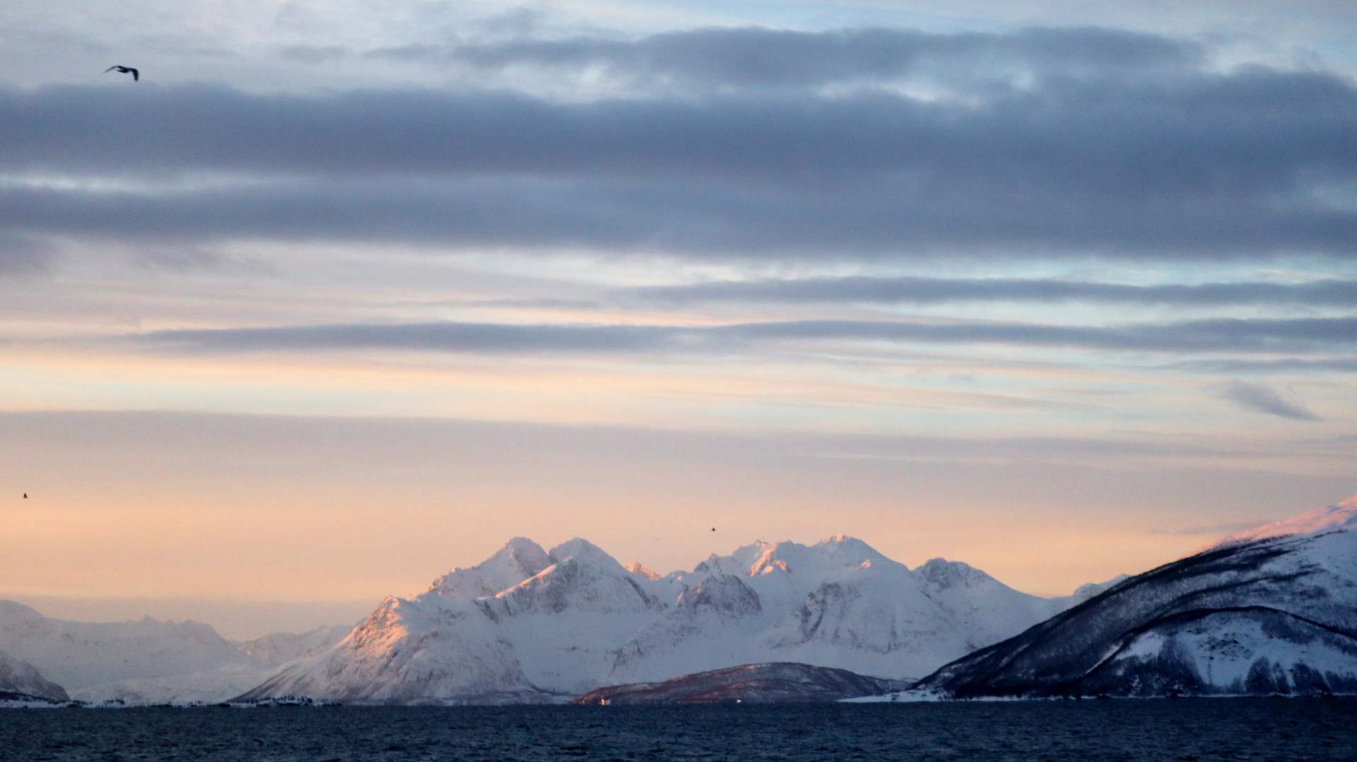 Die Farbe des Himmels wechselt gerade von Schwarz zu Blau und die Lichter Tromsøs leuchten in der Dunkelheit wie ein Schmuckstück, als wir um 8.00 Uhr Richtung Skjervøy starten.