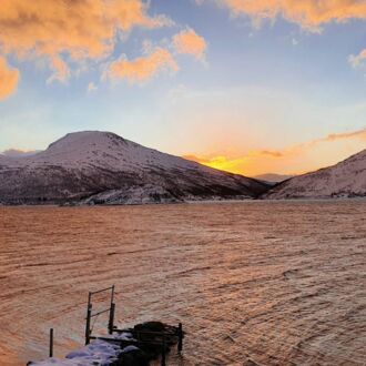 Mit der Fähre legen wir bei aufgehender Sonne von unserer Heimatinsel Kvaløya ab und setzen 45 Minuten später erstmals unseren Fuß auf die Insel Senja.