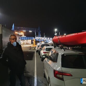Nur fünf PKW stehen neben den vielen LKW in der Warteschlange vor der Nachtfähre Niels Holgersen. Gemeinsames Ziel: Trelleborg.