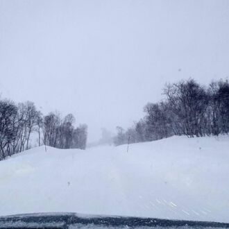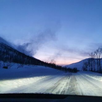 Reifen in Nordnorwegen scheinen meistens mit Spikes ausgestattet, denn die Straßen sind oft mit einer festen Eisdecke und einer darüber liegenden Schneedecke belegt. Unsere neuen Reifen waren sehr zuverlässig, die Schneeketten haben wir nicht benötigt.