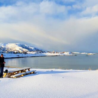 Ich tröste mich mit dem Genuß des wunderschönen polaren Sonnenlichtes. Heute werden die schneebedeckten Berge in ein atemberaubendes pastelliges leichtes Rosa getaucht. Wir statten der kleinen Insel Sommerøy einen zweiten Besuch ab, die bei strahlendem Sonnenschein so ganz anders aussieht als im Schneesturm vor einigen Tagen.