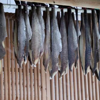 Unter dem Dachüberstand des Bootshauses hängen hunderte Dorschköpfe und Fische zum Trocknen. Leider sind die Fische noch nicht zum Verkauf, bzw. zum Kochen von Bacalao geeignet. Der Fischer mag dieses Trockenfischgericht ebenso gern wie wir und verspricht uns, seinen Vorrat zu überprüfen. Wir geben seiner Frau unsere Telefonnummer.