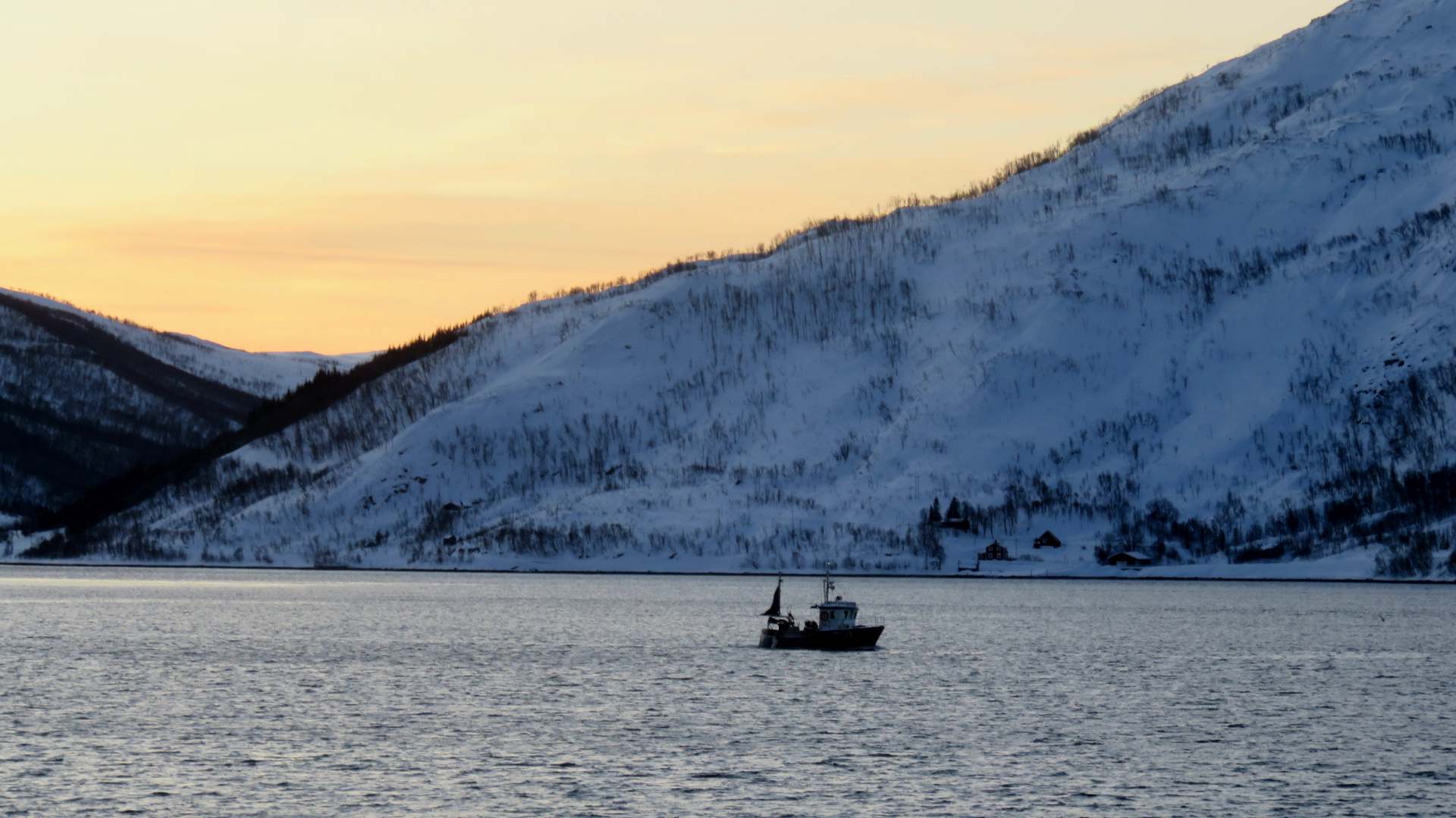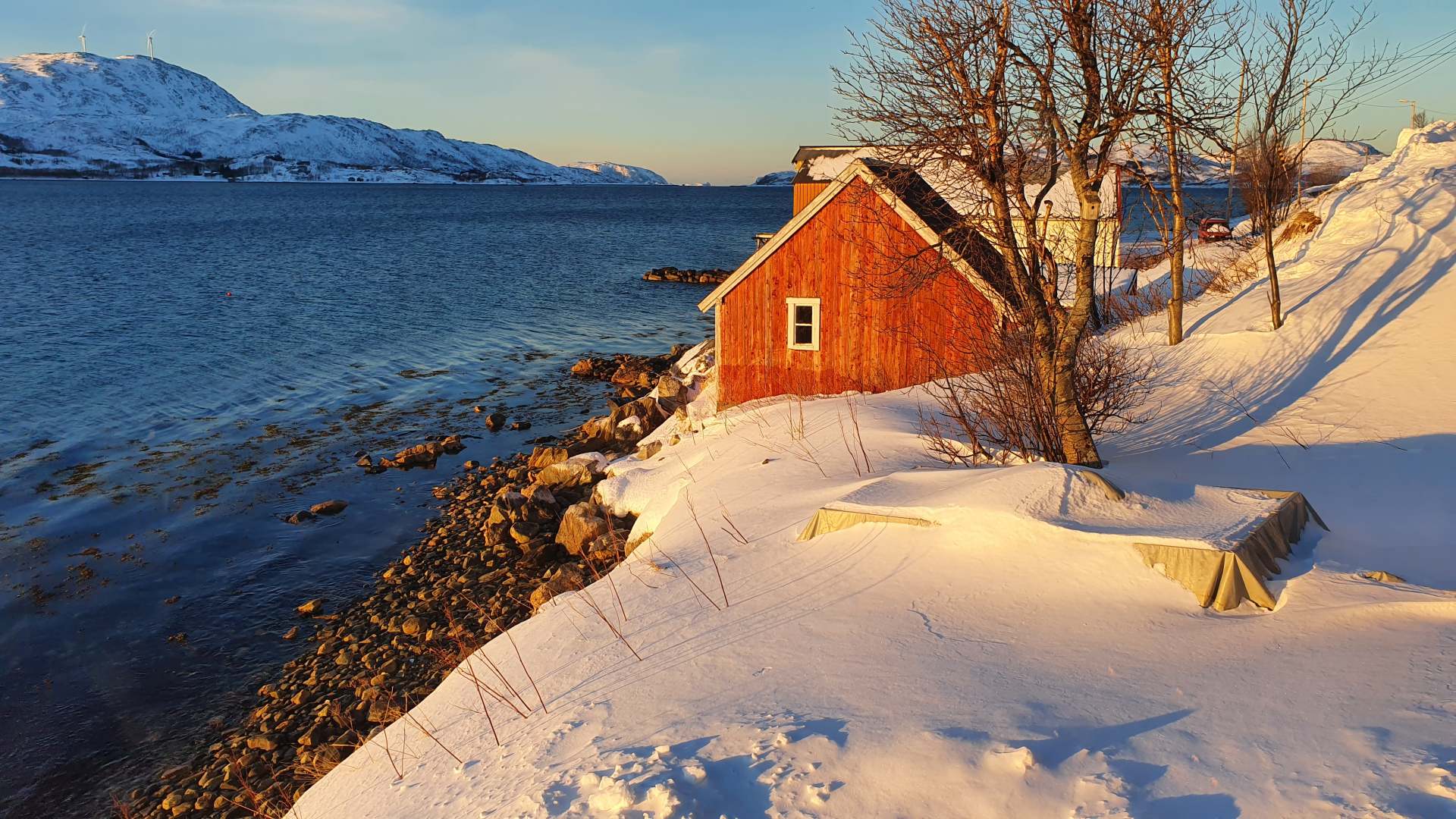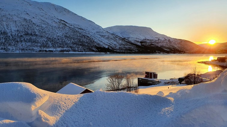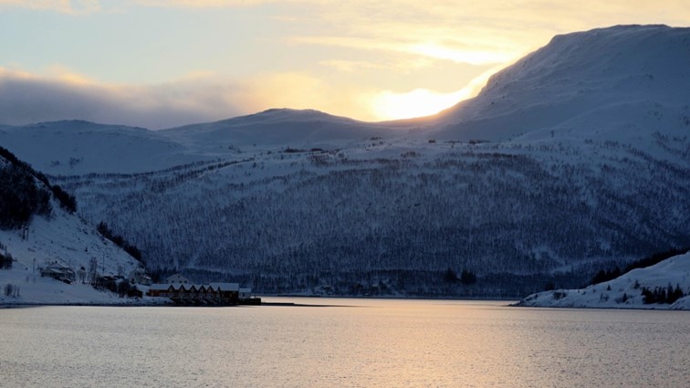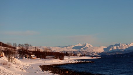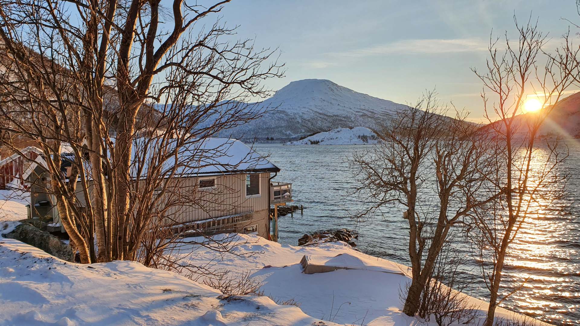 Das fast durchgehend sonnige Kvaløya im Süden kennen wir noch nicht. Dort ist nur derjenige im Schatten, der sich gegenüber der hohen Festlandberge aufhält. Dort wo die Sonne es auf der anderen Seite des Fjords noch nicht über die Berggipfel schafft.