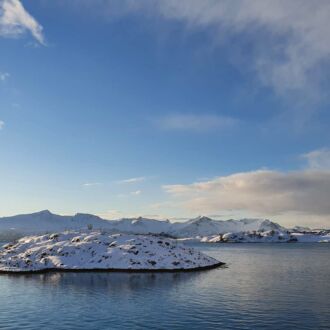 Die Sonne schafft es täglich ein Stück höher und das Licht verändert sich. Die Berge sind weniger in Rotgold und Rosa getaucht, die Farbe erinnert eher an Weißgold. Der Himmel ist tagsüber inzwischen so blau, wie wir ihn aus der Heimat kennen. Heute ist es mit bis zu -11° C sehr kalt, vor unserer Veranda treiben vereinzelte Eisschollen Richtung offenes Meer. Zu kalt zum Angeln oder Kajakfahren, auch wenn die Sonne am Himmel strahlt.