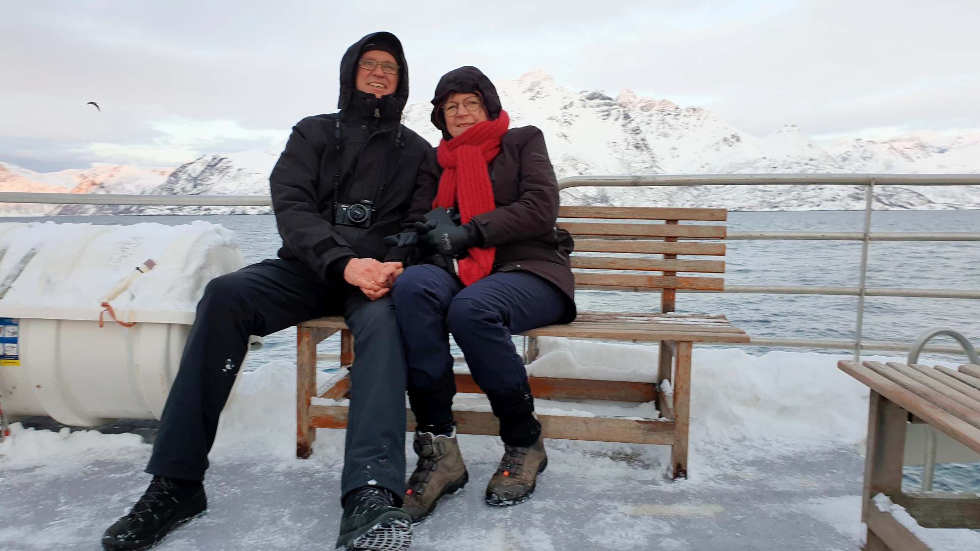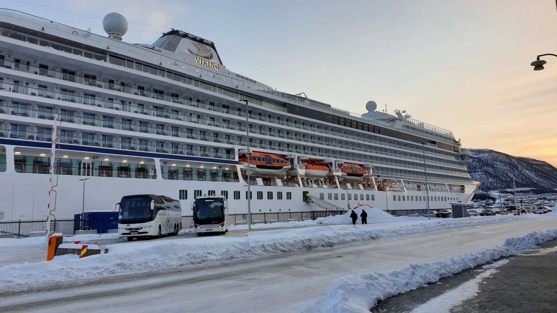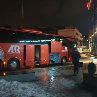 Um 3.00 Uhr sind wir aufgestanden, um 5.30 Uhr starten wir mit weiteren 22 Reisenden in einem Bus ab Tromsø Richtung Skjervøy. Das erste Mal seit Corona-Ausbruch, dass wir mit so vielen Leuten zusammen in einem Raum sind. Alle tragen mehr oder minder Maske und wir sowieso die guten Dräger FFP2-Masken.