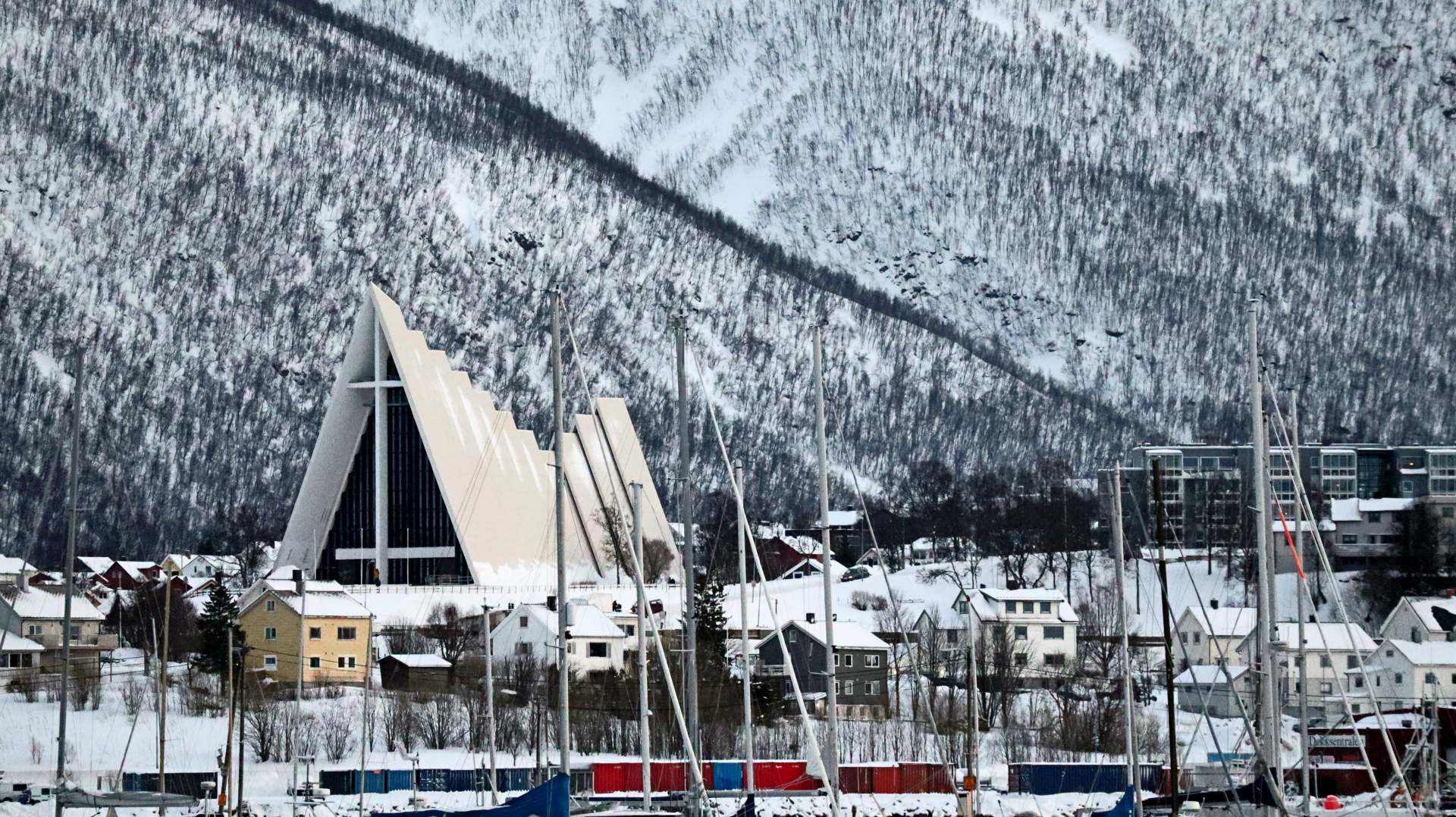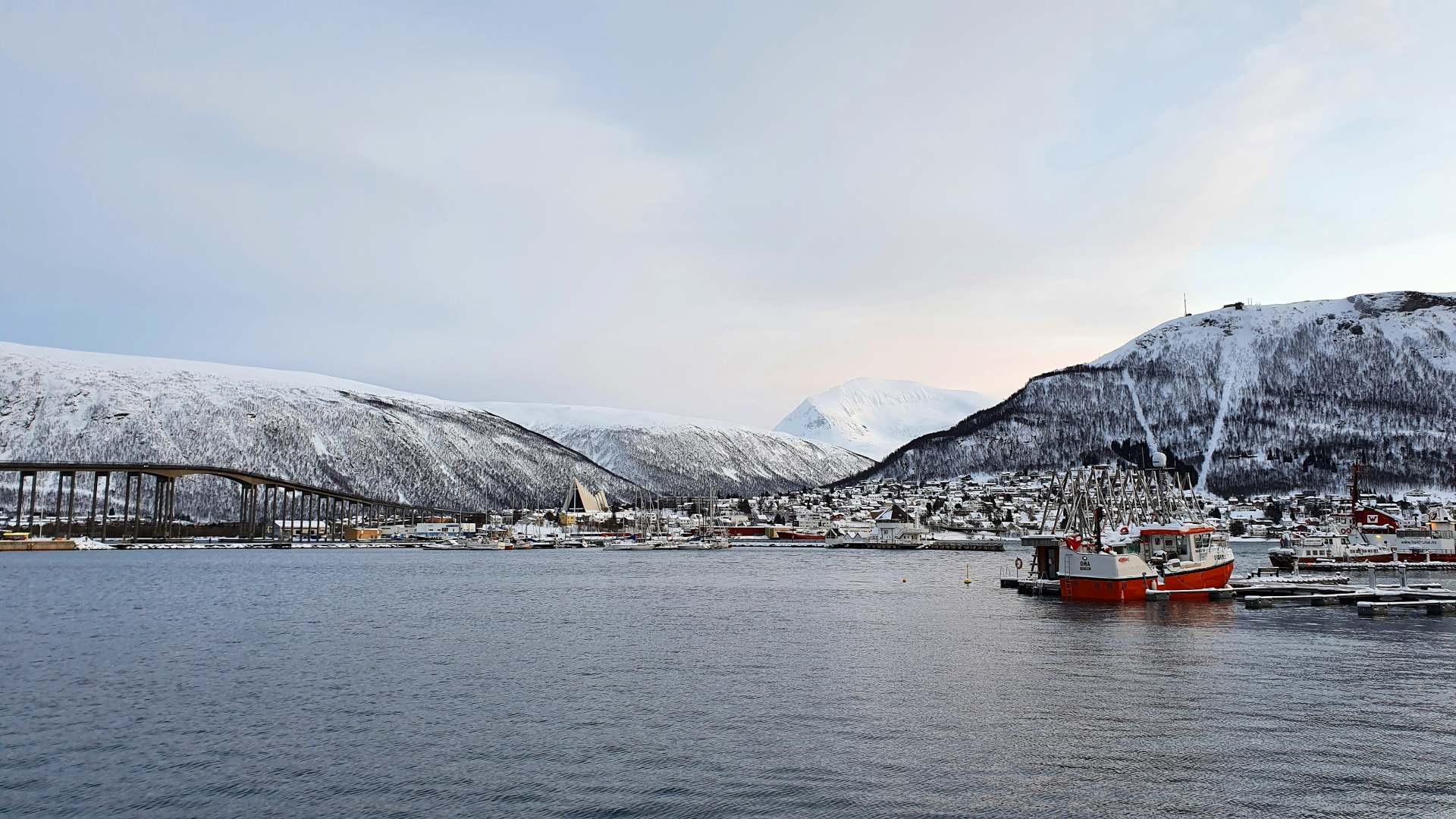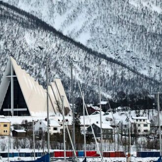 Die Eismeerkathedrale ist das Wahrzeichen Tromsøs. Die Silhouhette soll Eisplatten symbolisieren und ein 23 m hohes Glasmosaik an der Stirnseite ist eines der größten Glasgemälde Europas. Leider bleibt uns die nähere Betrachtung um 11.30 Uhr verwehrt, die Kathedrale öffnet erst um 13.00 Uhr.