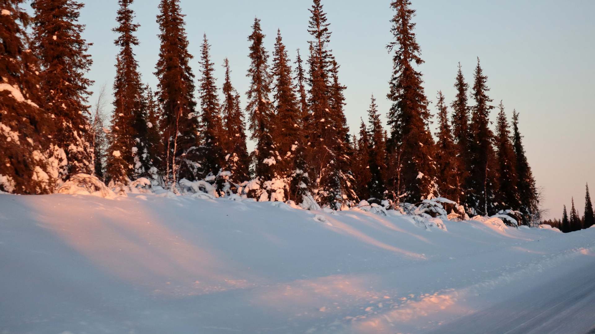 Ab 9.00 Uhr zeigt sich langsam die Sonne und taucht die Landschaft in helle Pastellfarben. Die Straßen sind meist schnurgerade, wellig wie ein Waschbrett und rechts und links von Wald gesäumt. Der geradeaus gerichtete Blick schaut in einen Himmel, dessen Hellblau in ein Hellgelb und schließlich Hellrosa übergeht.