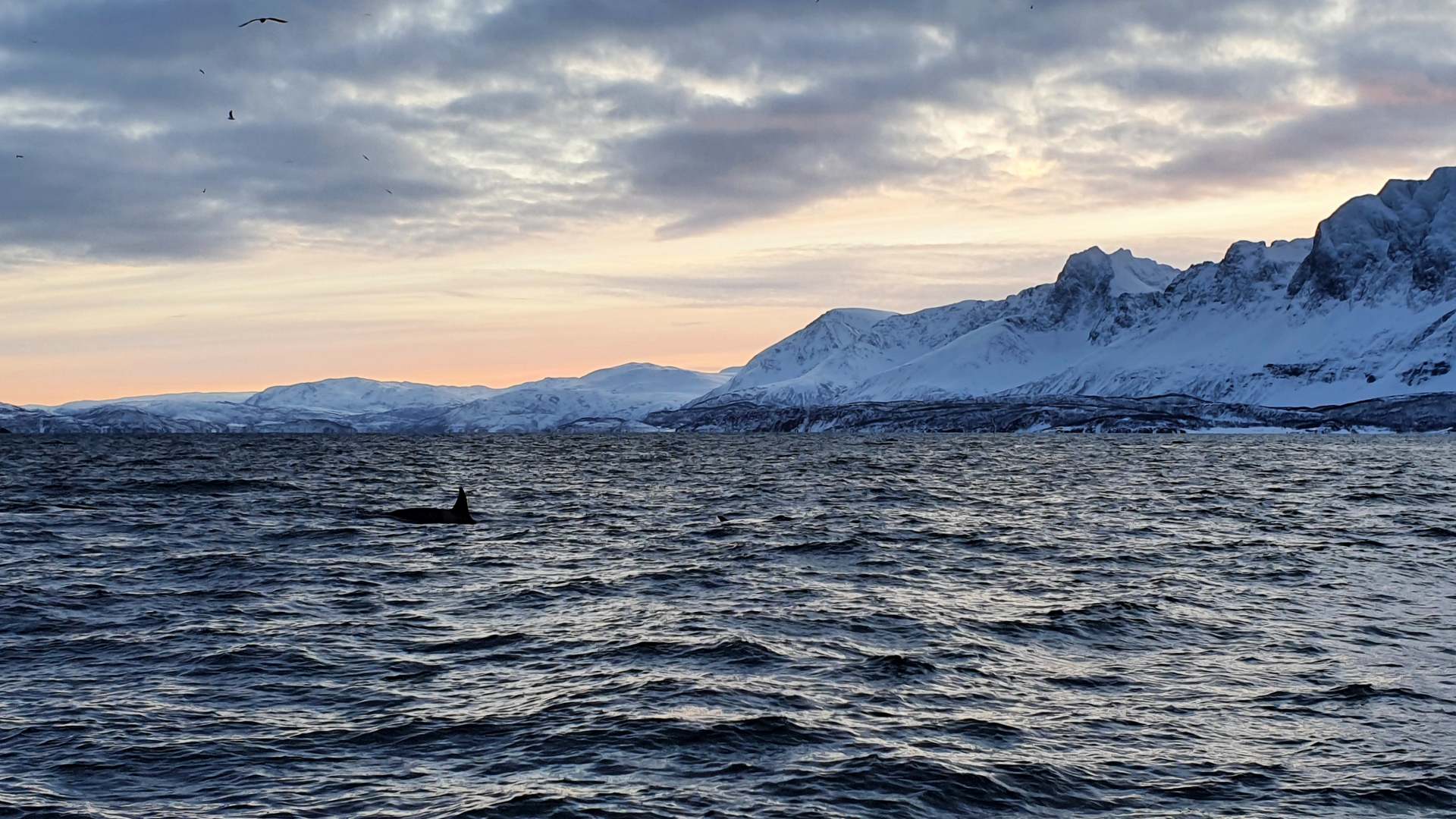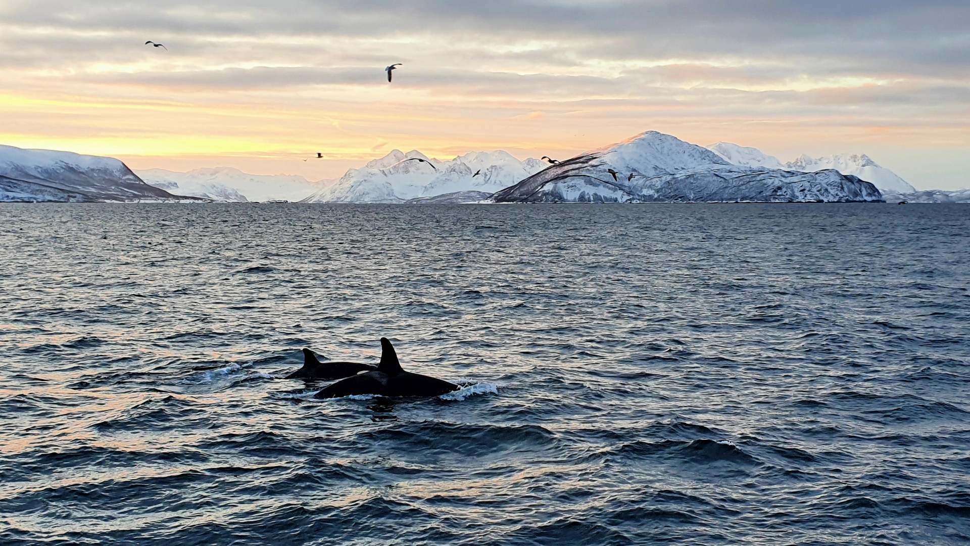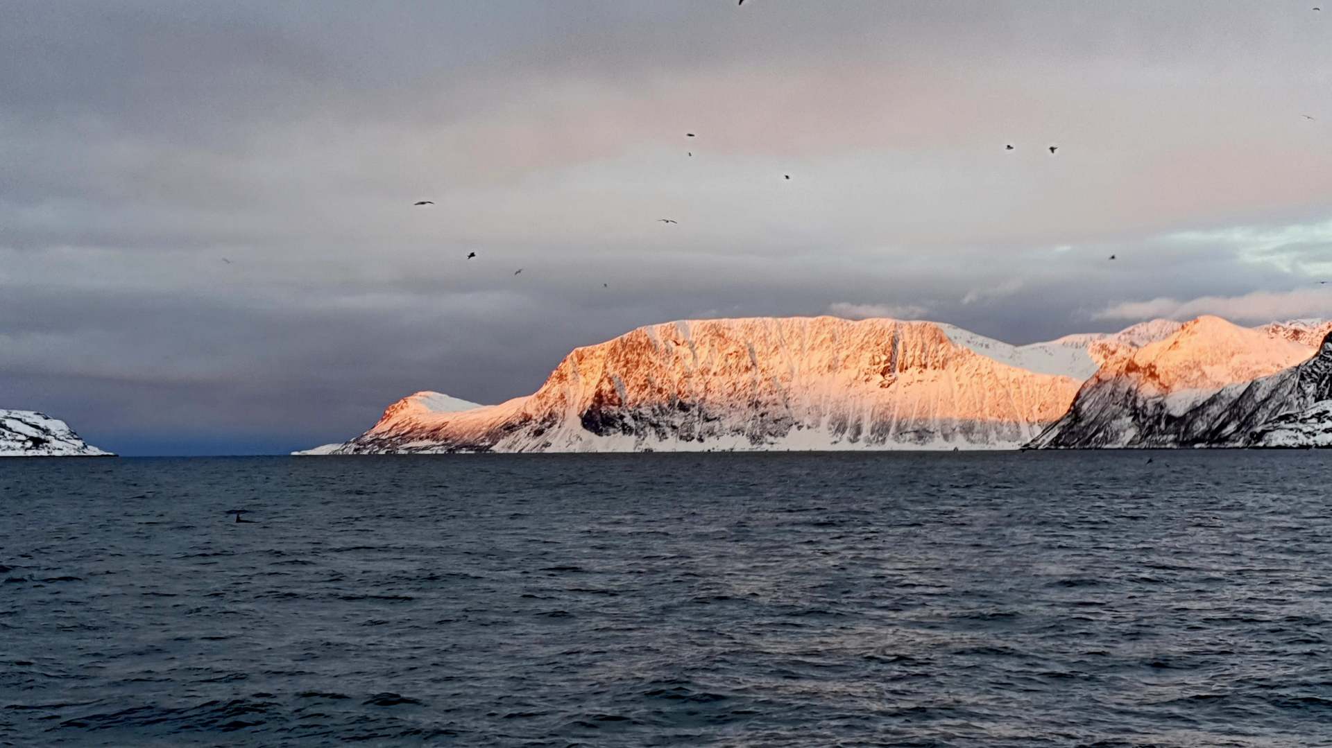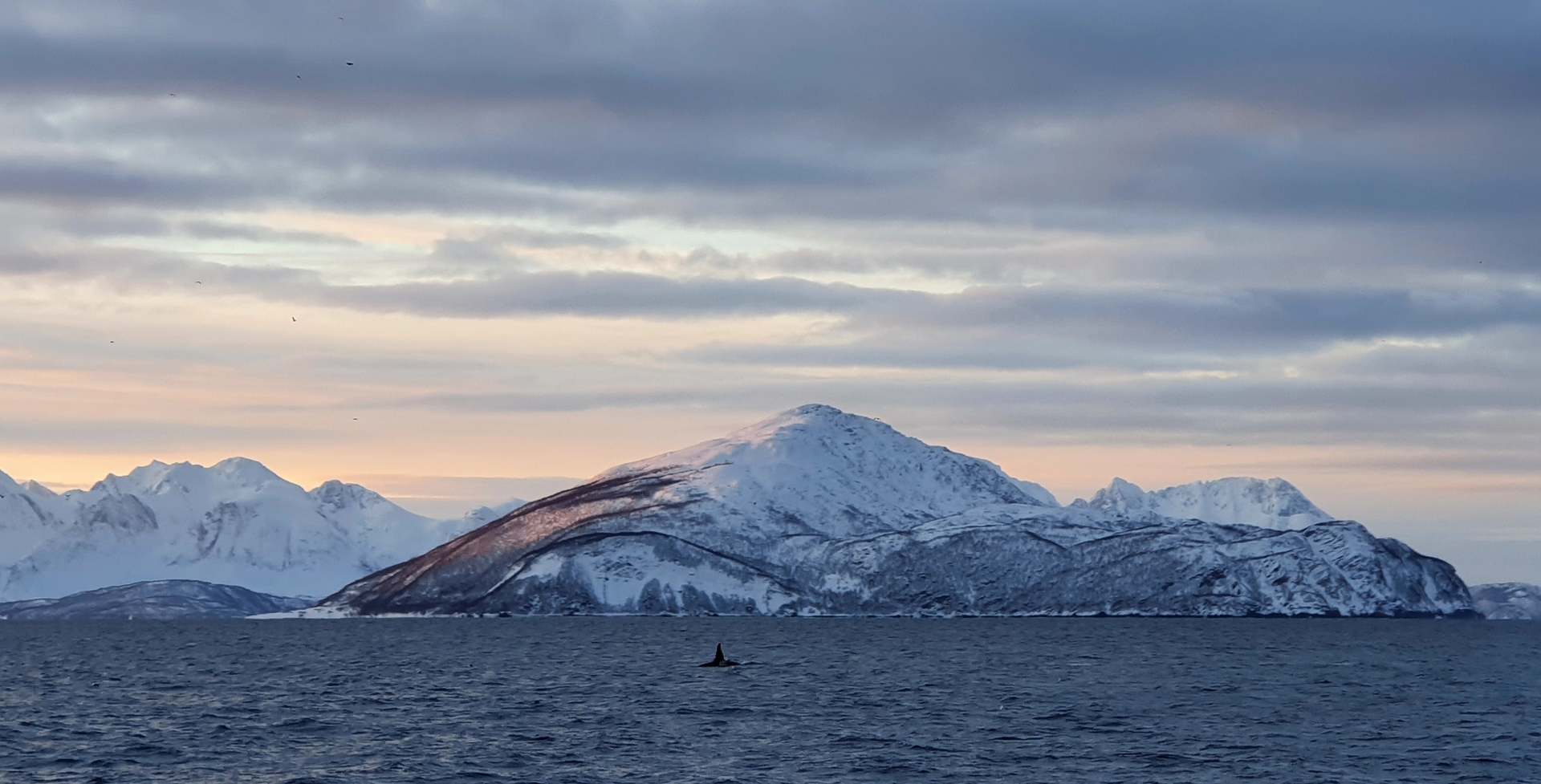 Diesmal fahren wir ein Stück an der Insel Skjervøy vorbei und stoppen zwischen einer Inselgruppe, deren Berge nach und nach in ein zauberhaftes Licht getaucht werden. Nach kurzer Zeit kommen die Orcas, dann noch drei Buckelwale. Wieder so nah wie auf der RIP-Boot-Tour und so unfassbar viele.