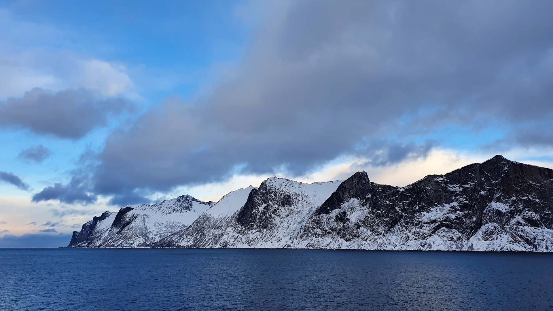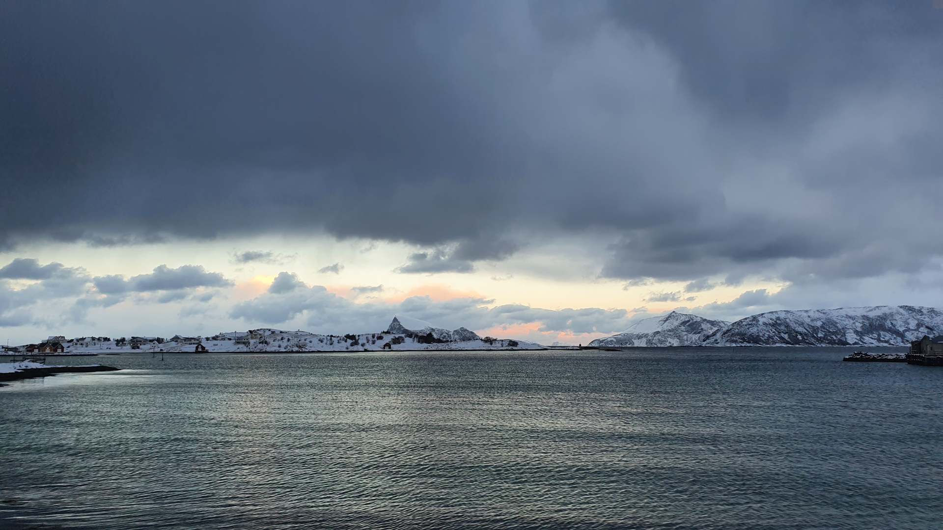 Das Sonnenlicht am Kattfjorden ist kühler als zu Beginn unseres Urlaubs, doch wie immer wunderschön und wir genießen Licht und Stille. Zumindest so lange, bis die Wolken vom Horizont uns erreichen.