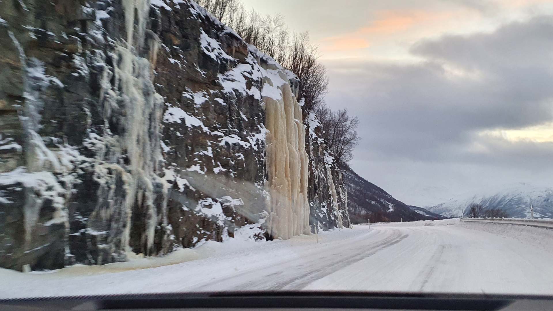 Die Landschaft ändert sich schlagartig. Norwegen pur: Schroff, gewaltig und von allem ein bisschen mehr: Berge, Schnee, Höhenunterschiede, Felsen, Eiszapfen. Immer ein klein wenig dramatisch – so scheint uns. Oder heißt das dramaturgisch?