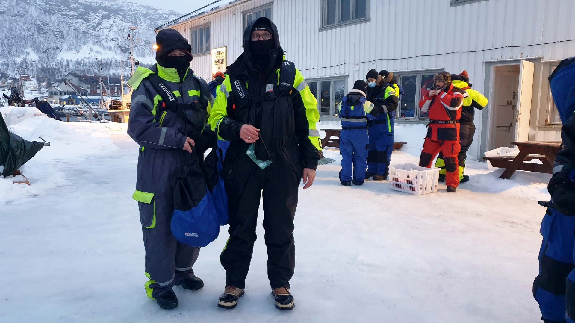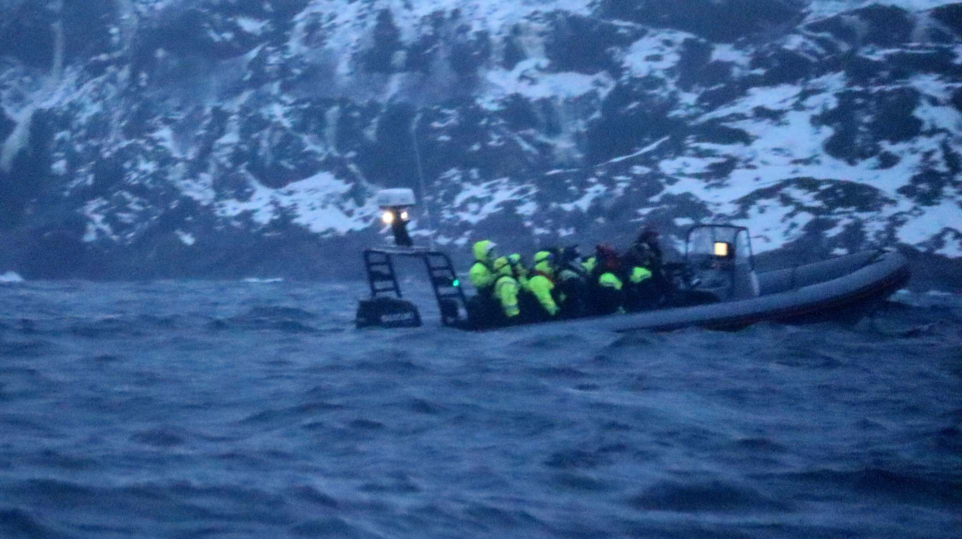 Nach vier Stunden geht es zackzack zum Umziehen: Überlebensanzug, Schwimmweste, Fäustlinge, Ski-Maske, schwere Gummistiefel. Je zwölf Personen klettern in die zwei Boote und mit 350 PS-Vollspeed geht es für knapp drei Stunden aufs Meer hinaus.